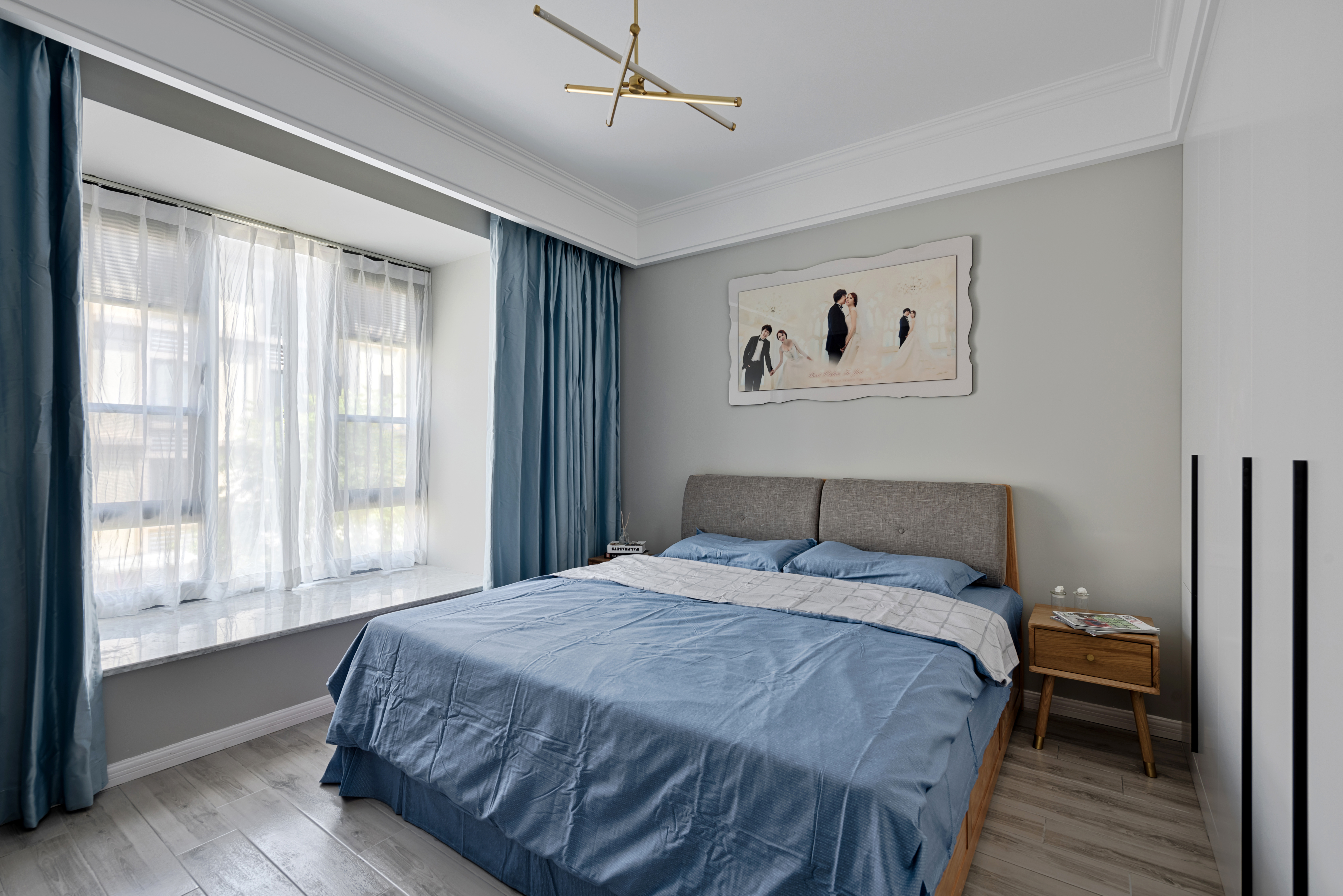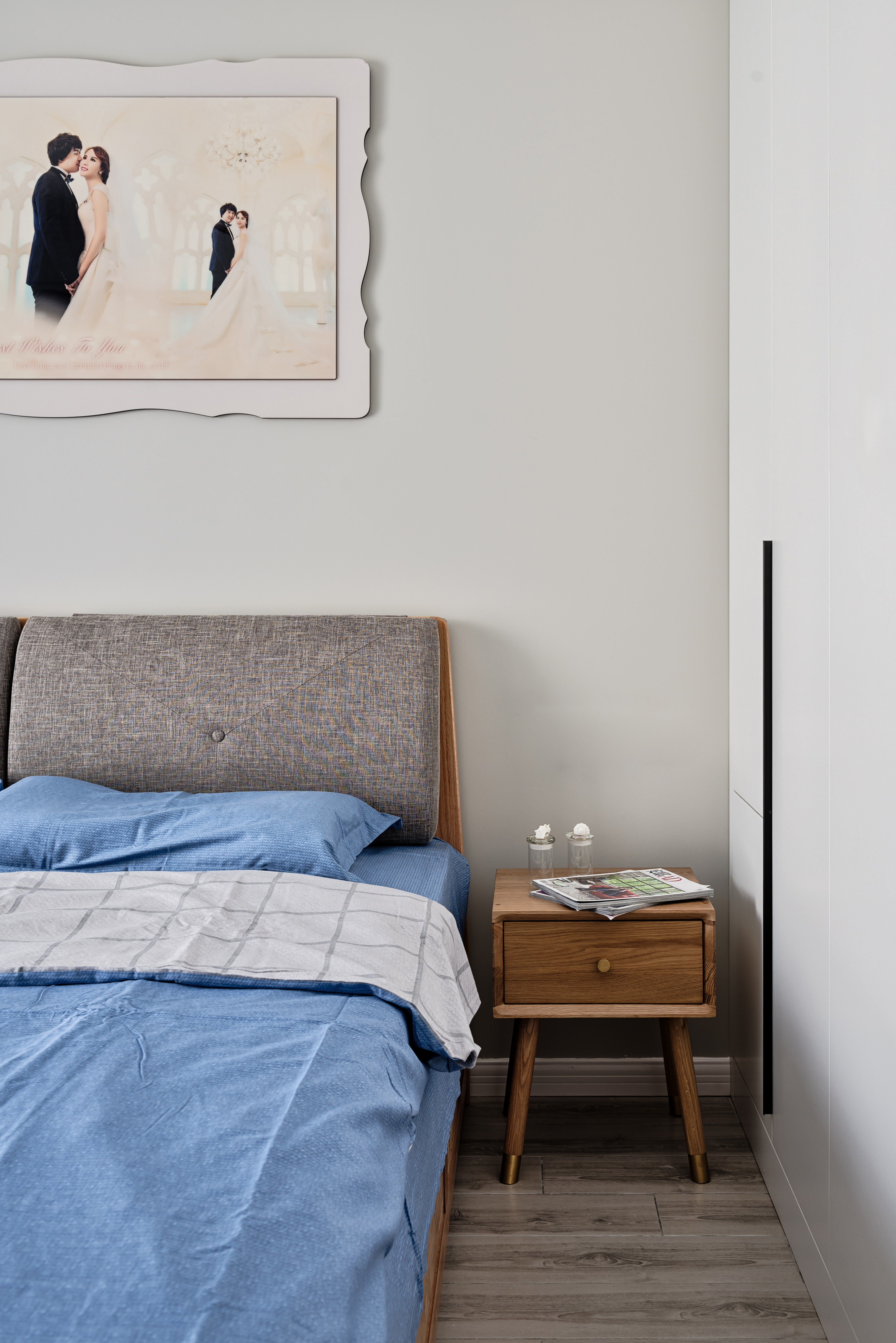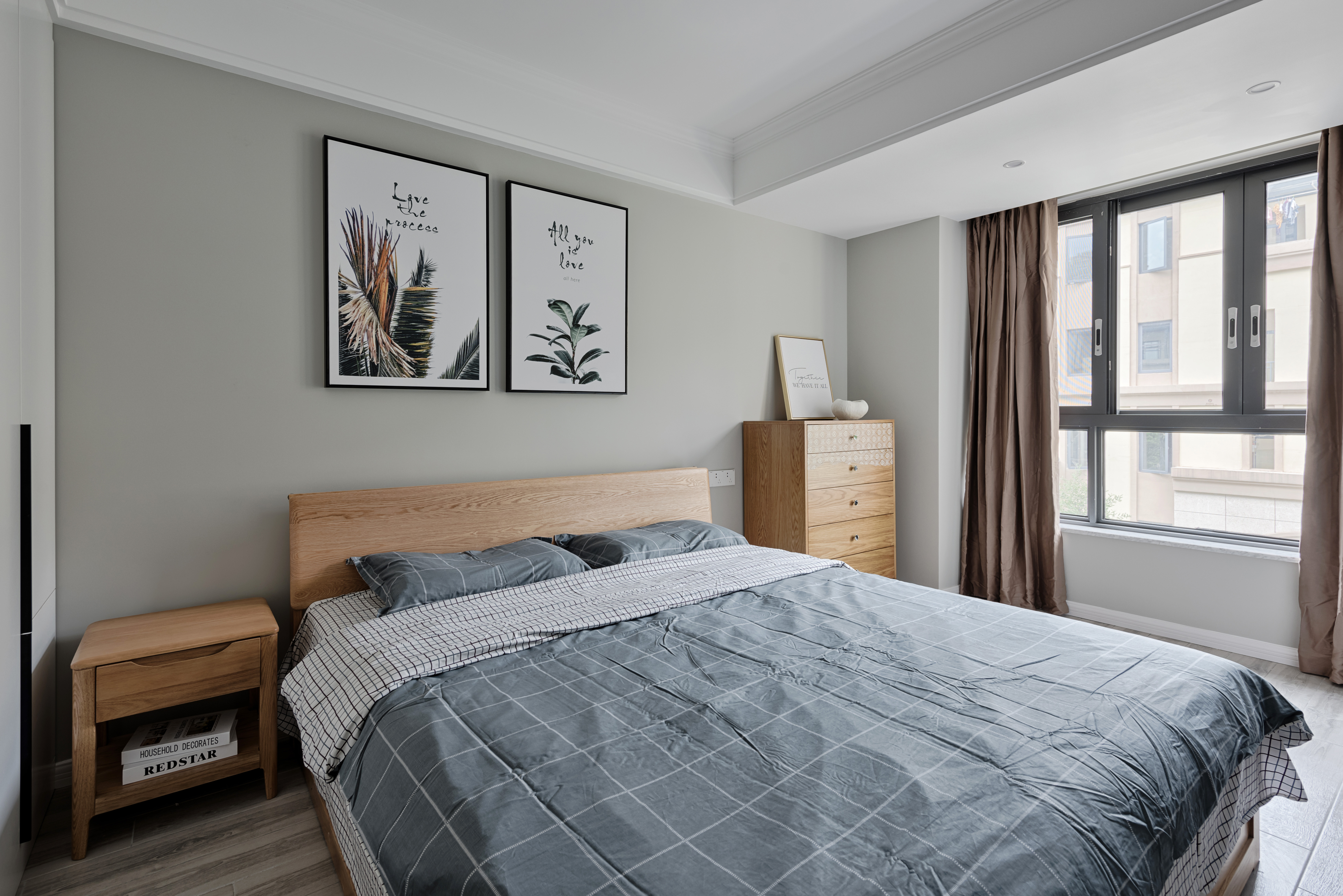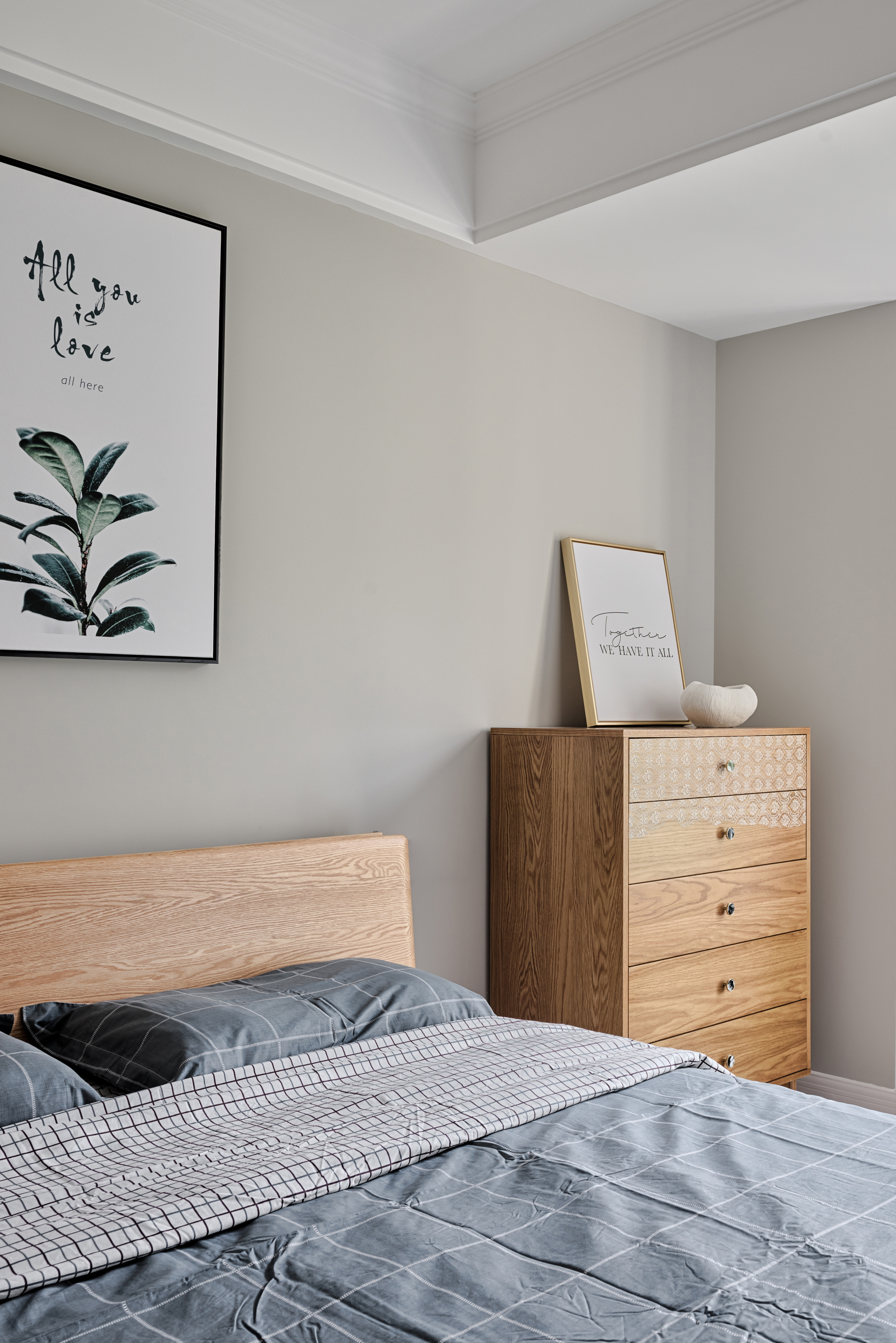 通过植物挂画透露出对生活的热爱,植物采用深绿色带一点黄色的枯叶,搭配自然木色的床以及床头柜、五斗柜。让实用与颜值并存,打造出清新自然中带着点小资情调的卧室空间