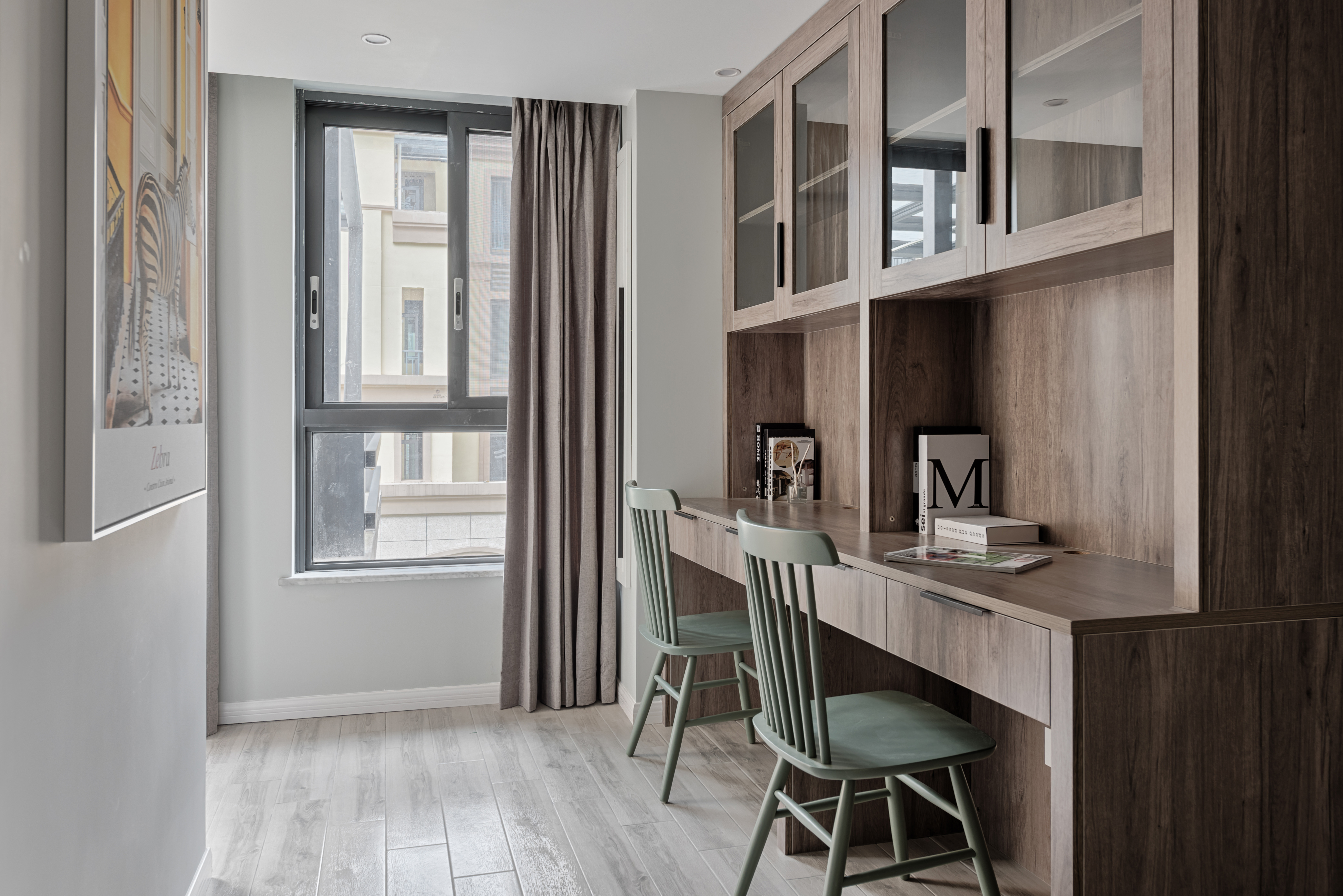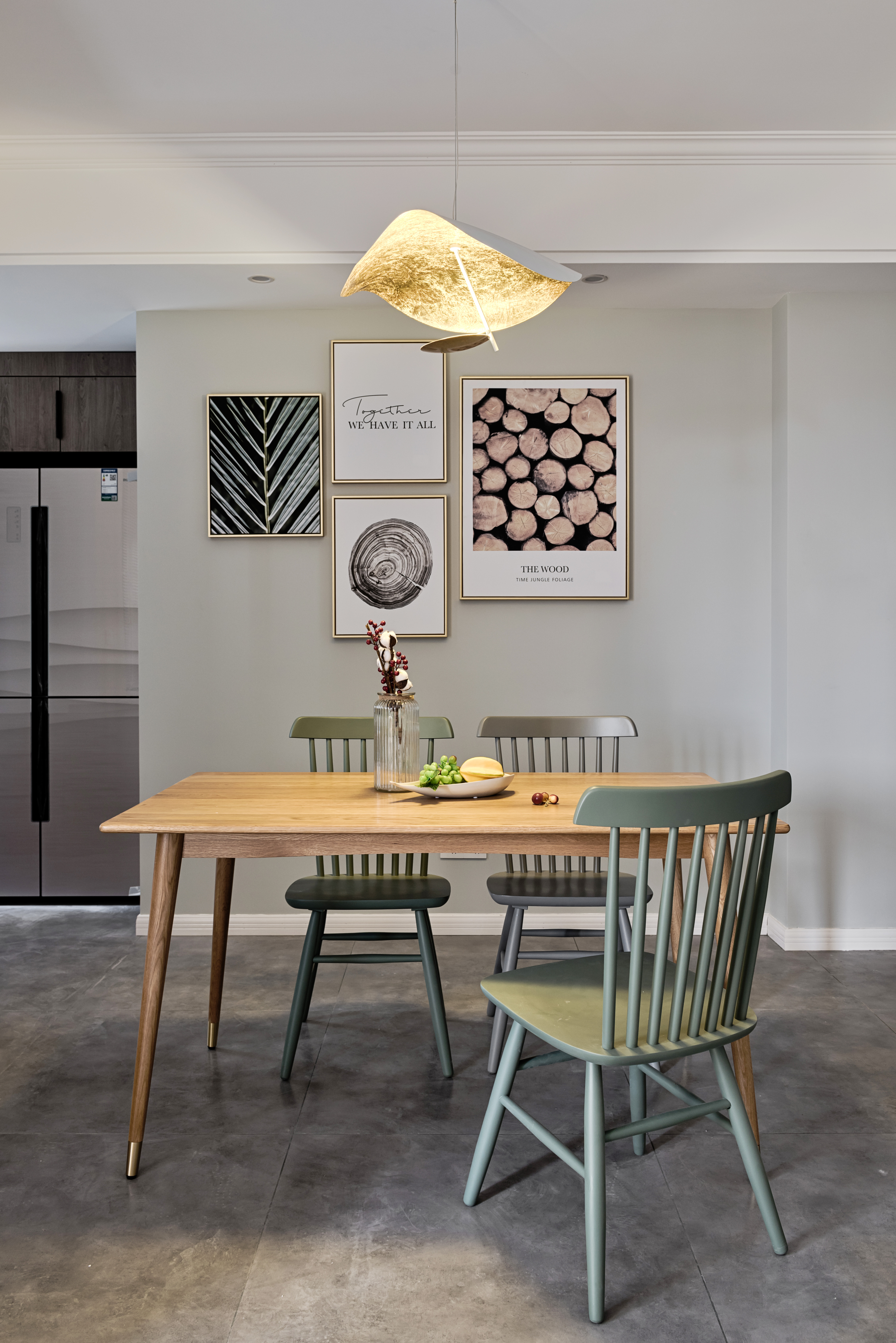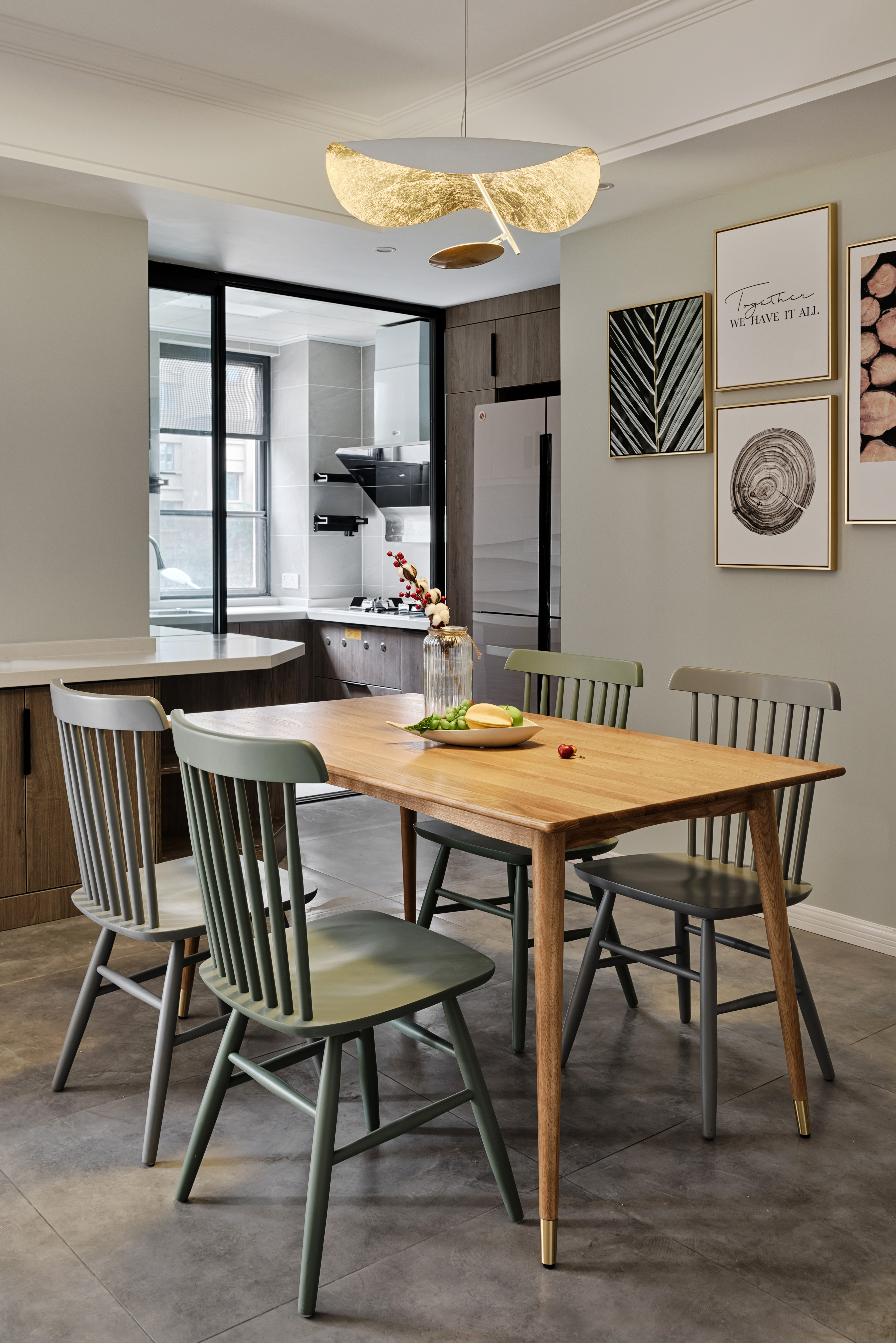 森系的挂画和墨绿色的餐椅更加符合这个空间的氛围,自然、淡雅、素净,与不同色泽的木质形成一股独特的气质,被改造过的厨房在视觉上变得更加的通透,不再拘泥小小的一角