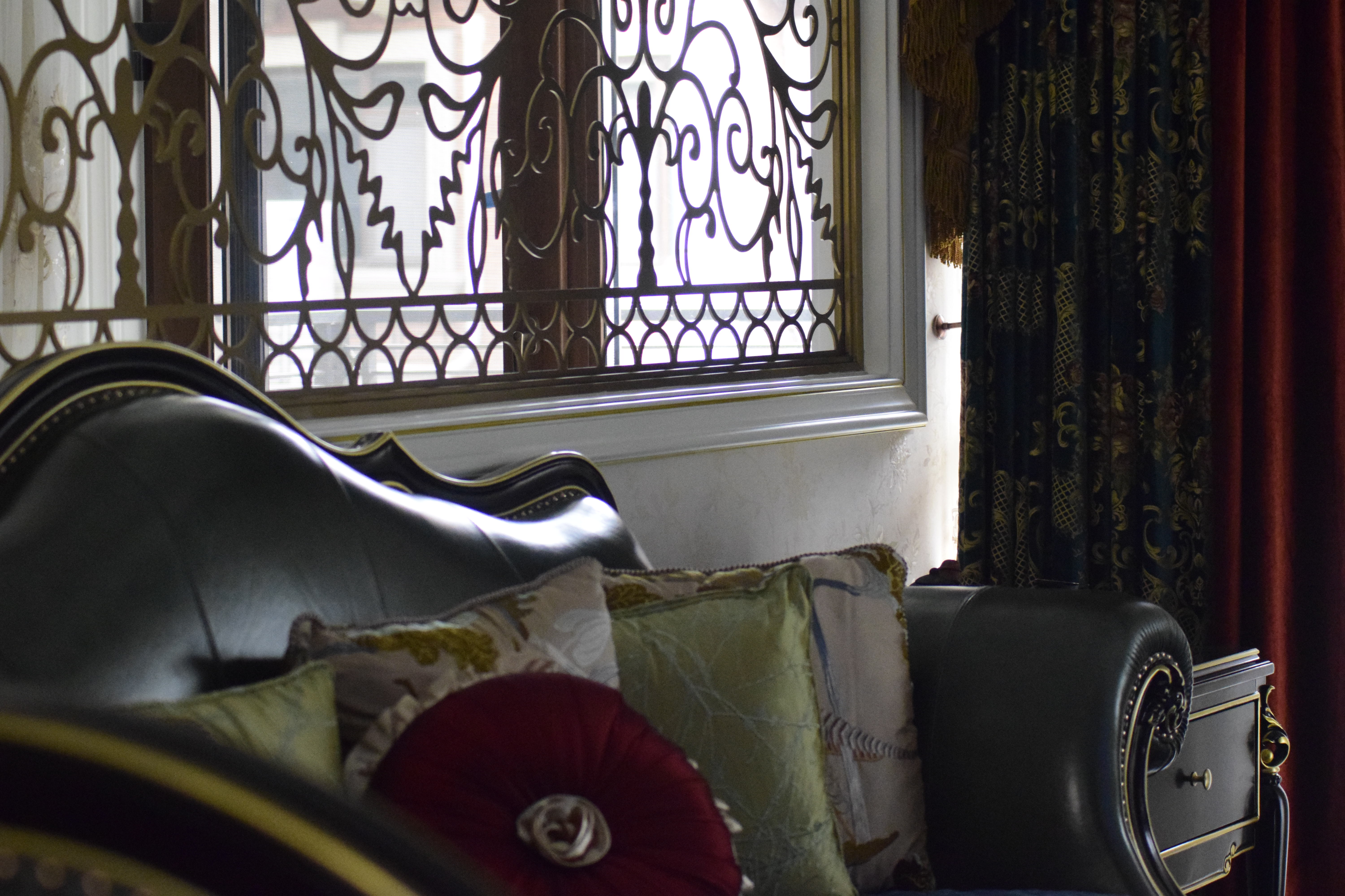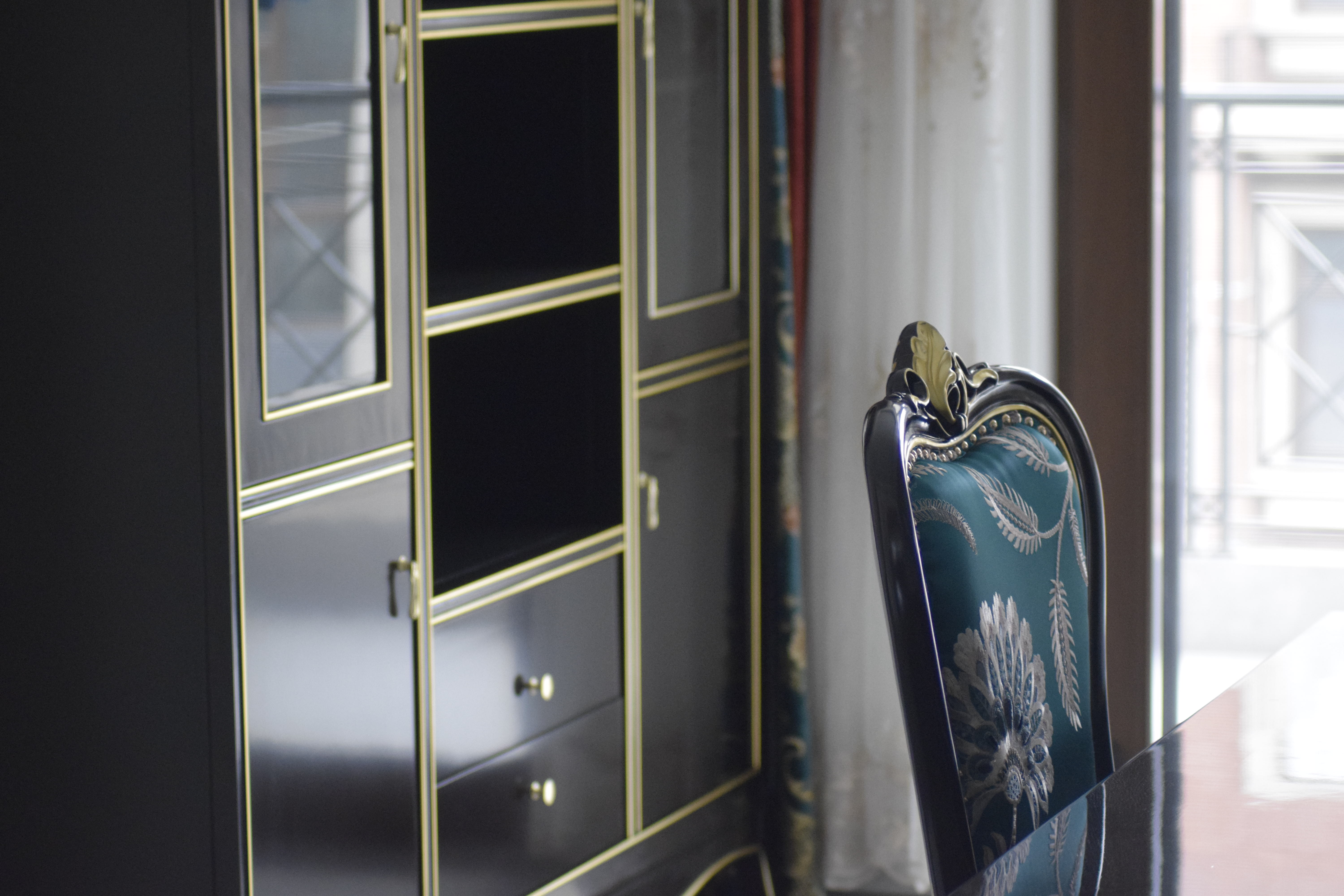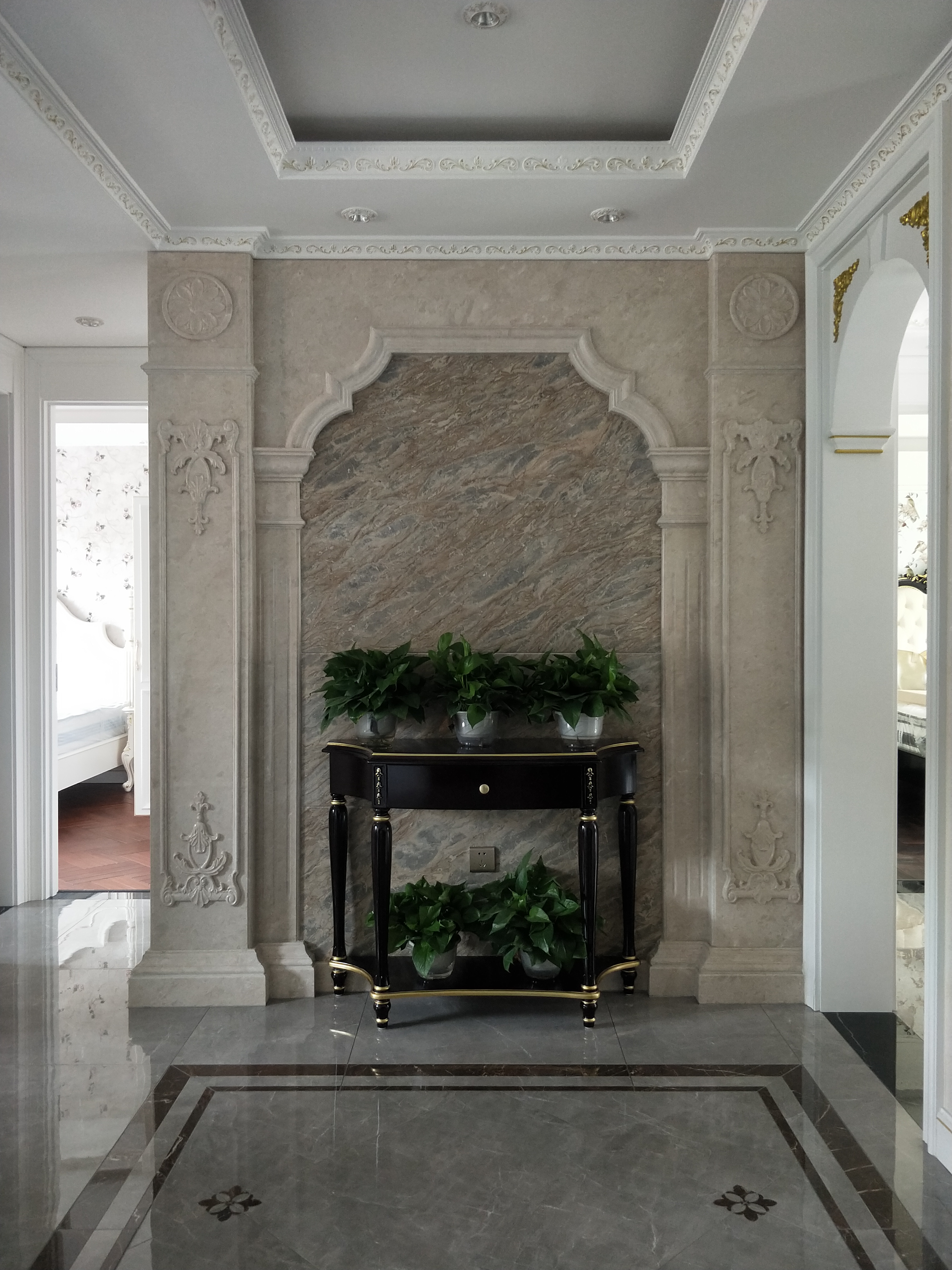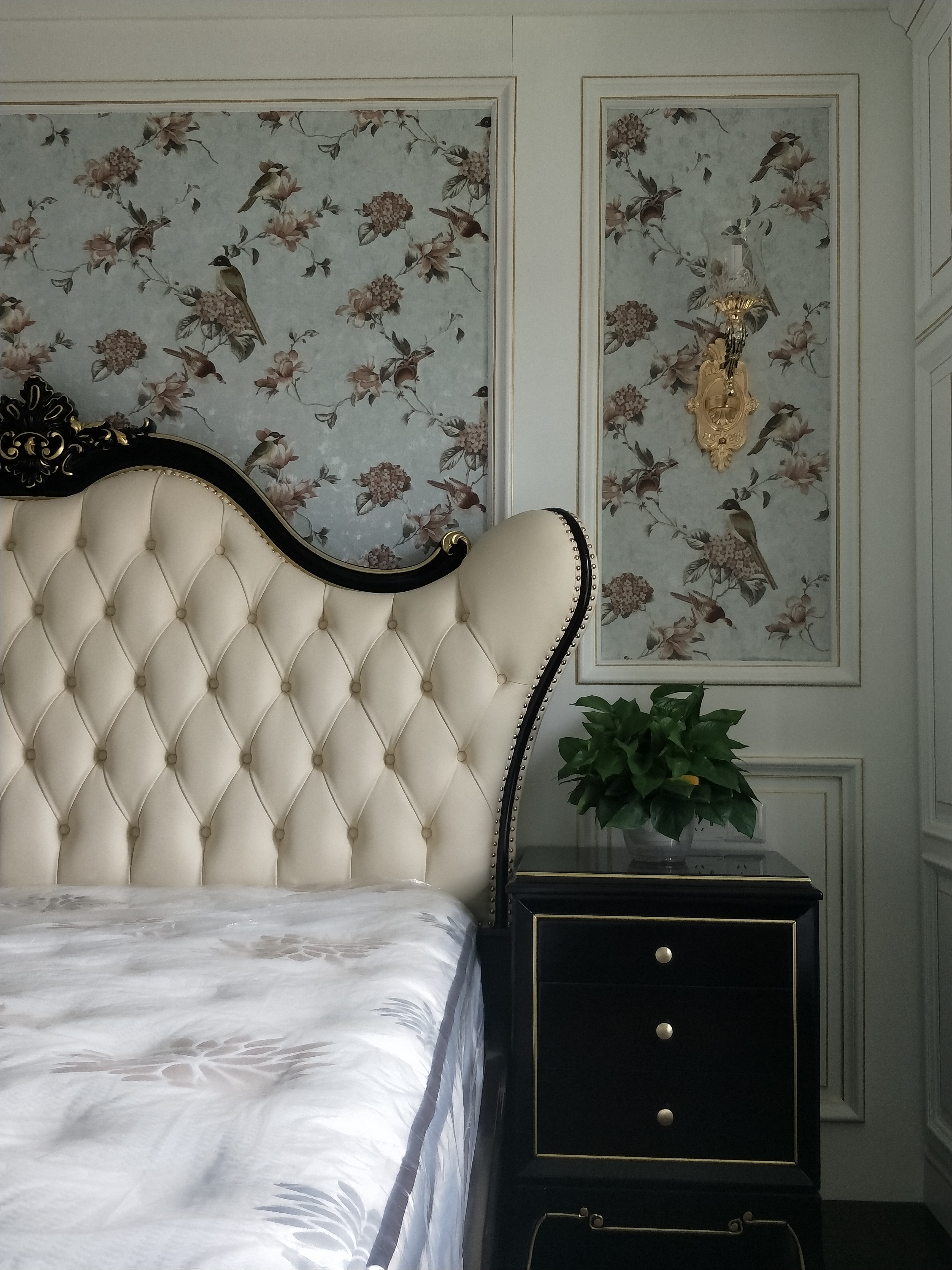 空间意境:色彩对比明确,浅色丝光质感墙纸及深色墙纸提升质感,灰色、金色互补在浅色基调架构起高贵典雅的清新浪漫环境,且到处弥漫着女性的温柔及梦幻。