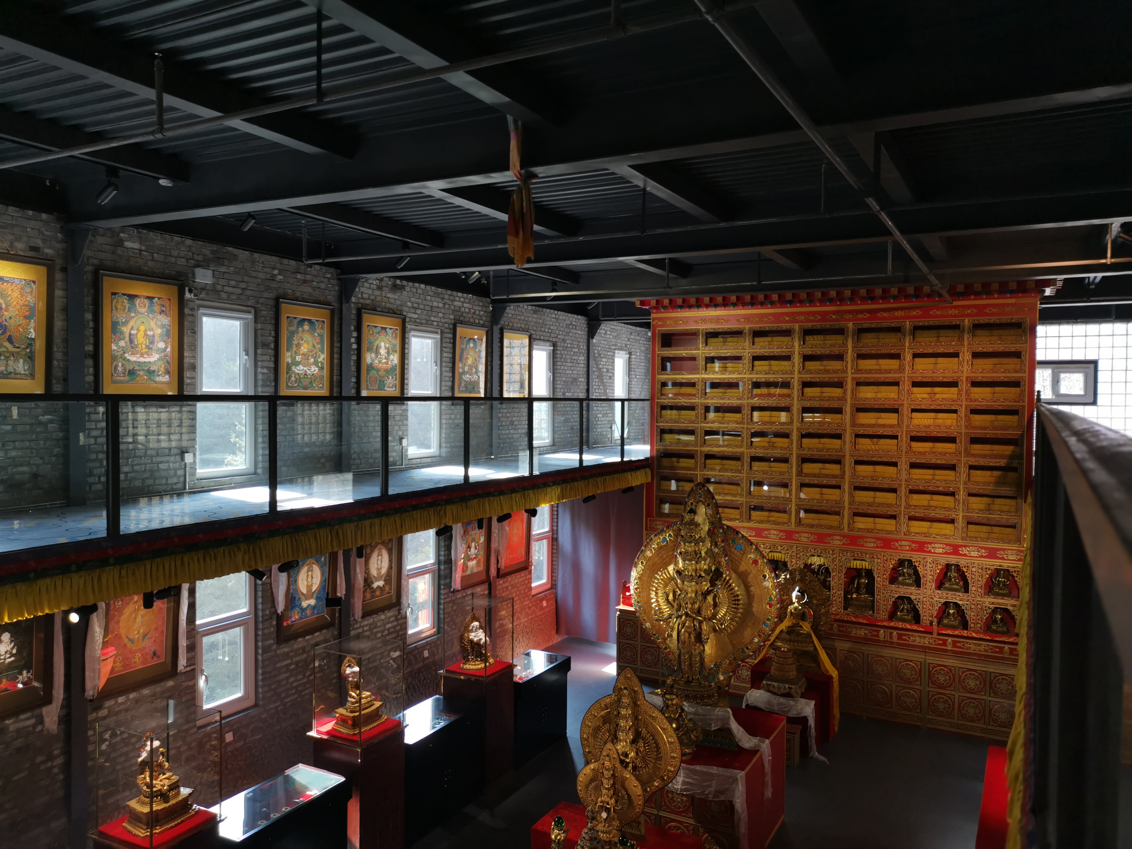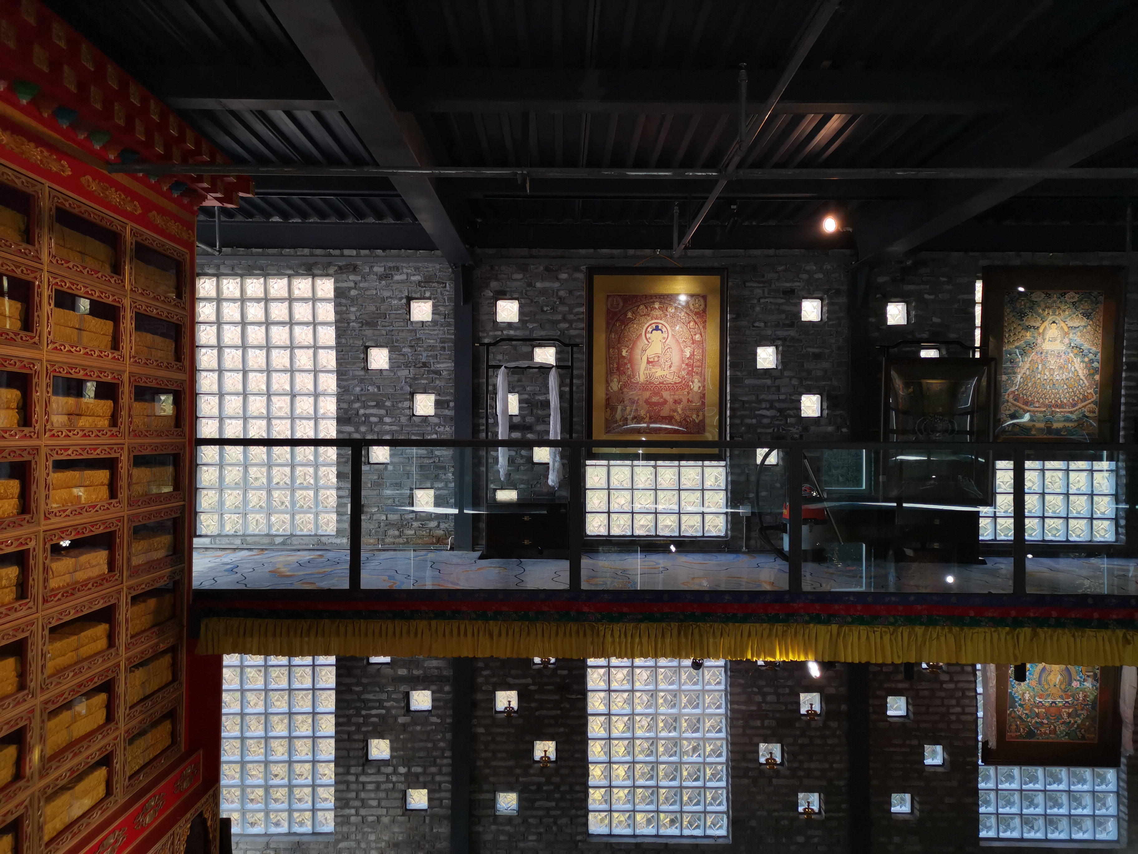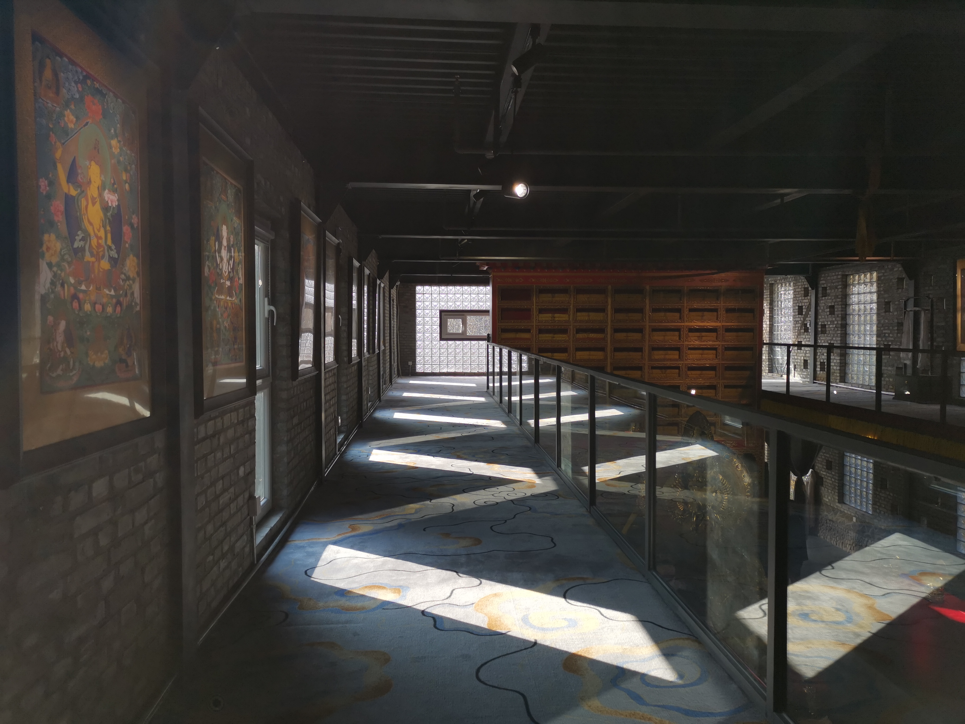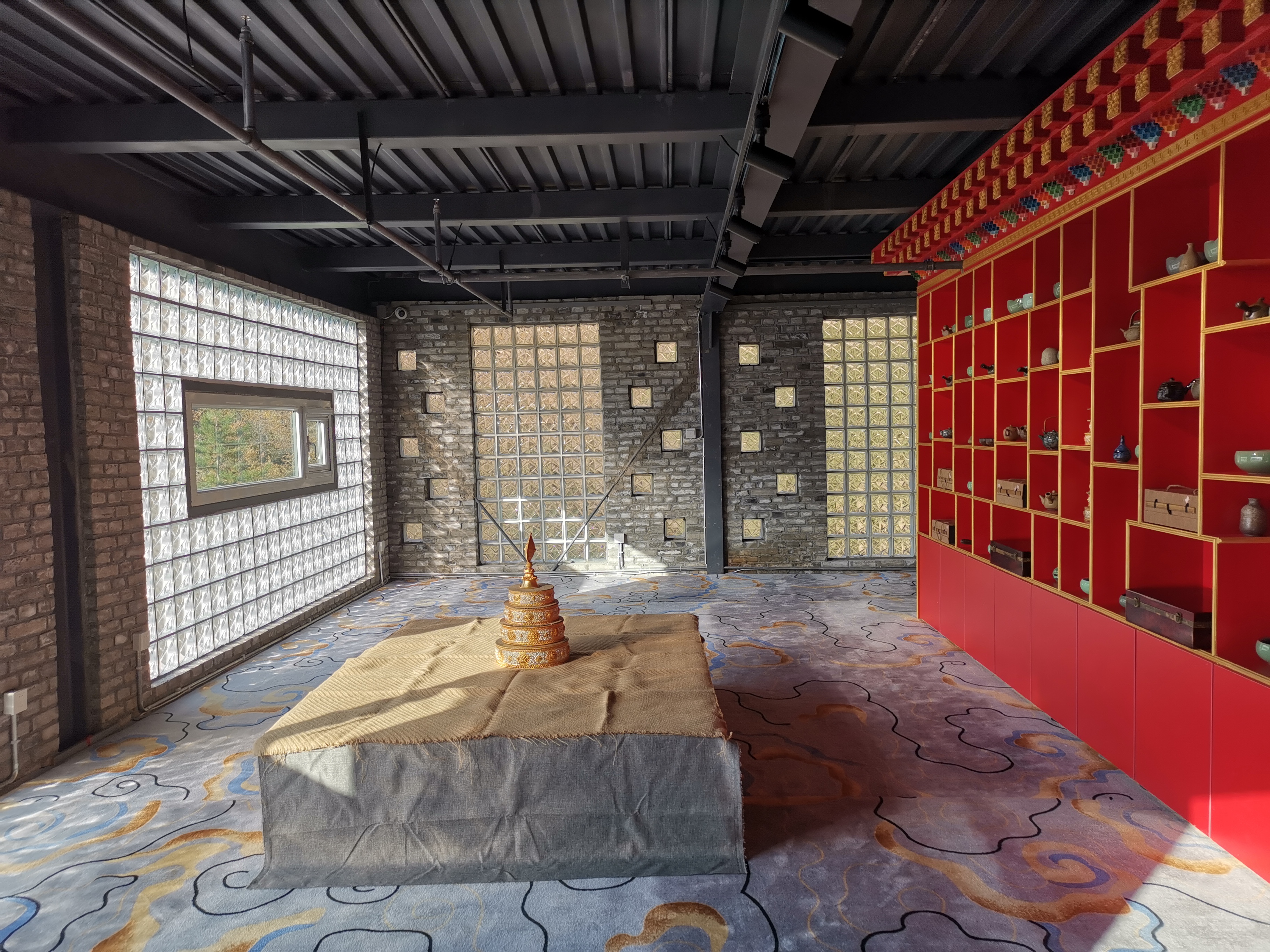 空间意境:展厅由一二层两个主要分区组成,一楼展示区占200多平米,主要以尼泊尔手工佛像为主,展厅整体以钢结构,青砖,玻璃砖为基调,金色红色传统纹样柜体为载体。二层以巨幅唐卡和精美工艺品为主要展示,在两侧走廊的设计上作为一个禅修打坐的禅廊,当窗外的阳光照射到禅修者身上的时候,那样的场景真是妙不可言,此为设计上的第一个创新点。同时一楼设置了一个小型多功能厅的区域,作为主人招待朋友的一个地方。我们以利落的裸露的钢架线条度刻出体积,自上而落贯通到底,迸发而出的力量,收纳后再吐露,一楼四条软性的布帘隔开了三个空间,使空间拥有