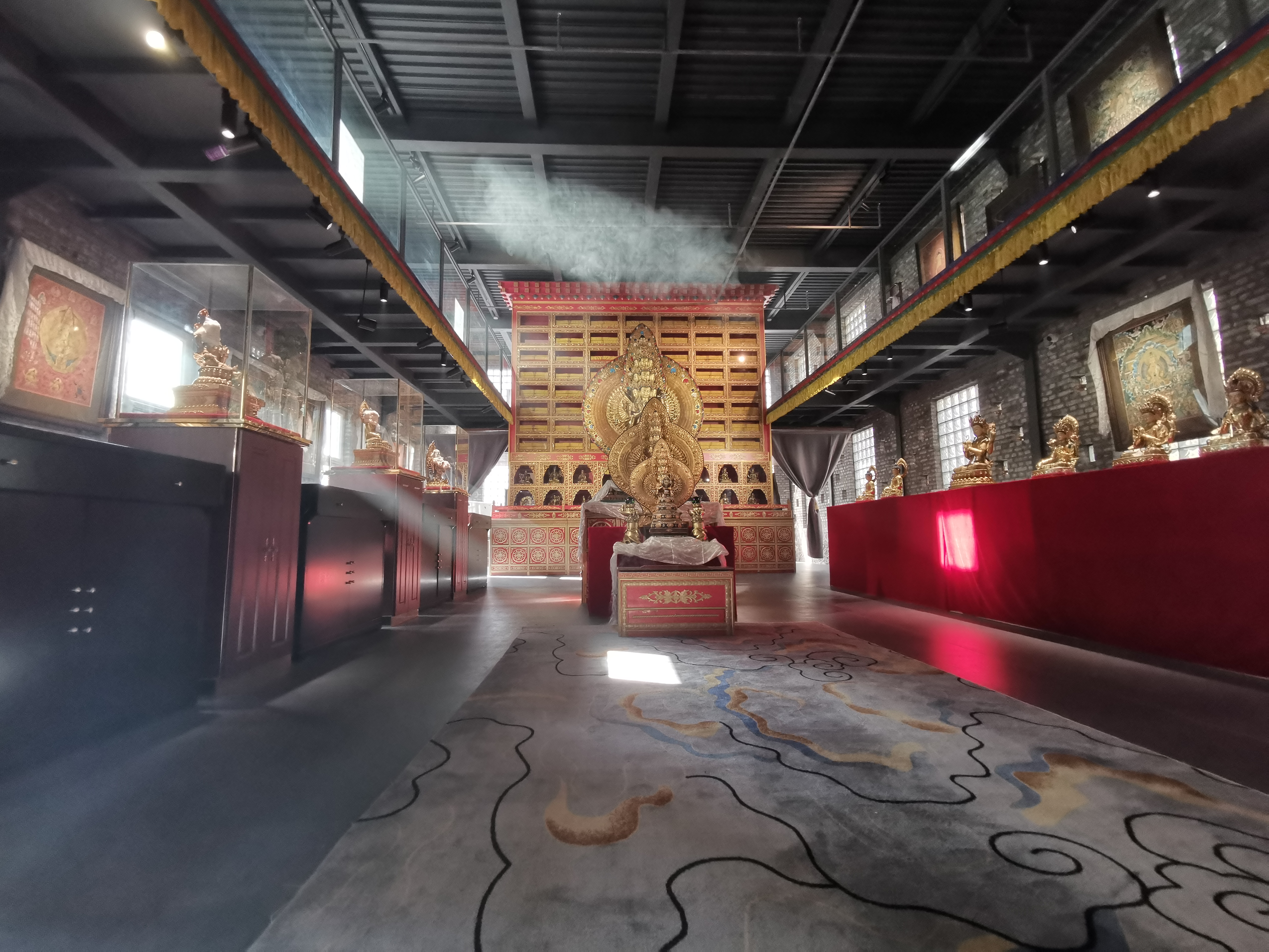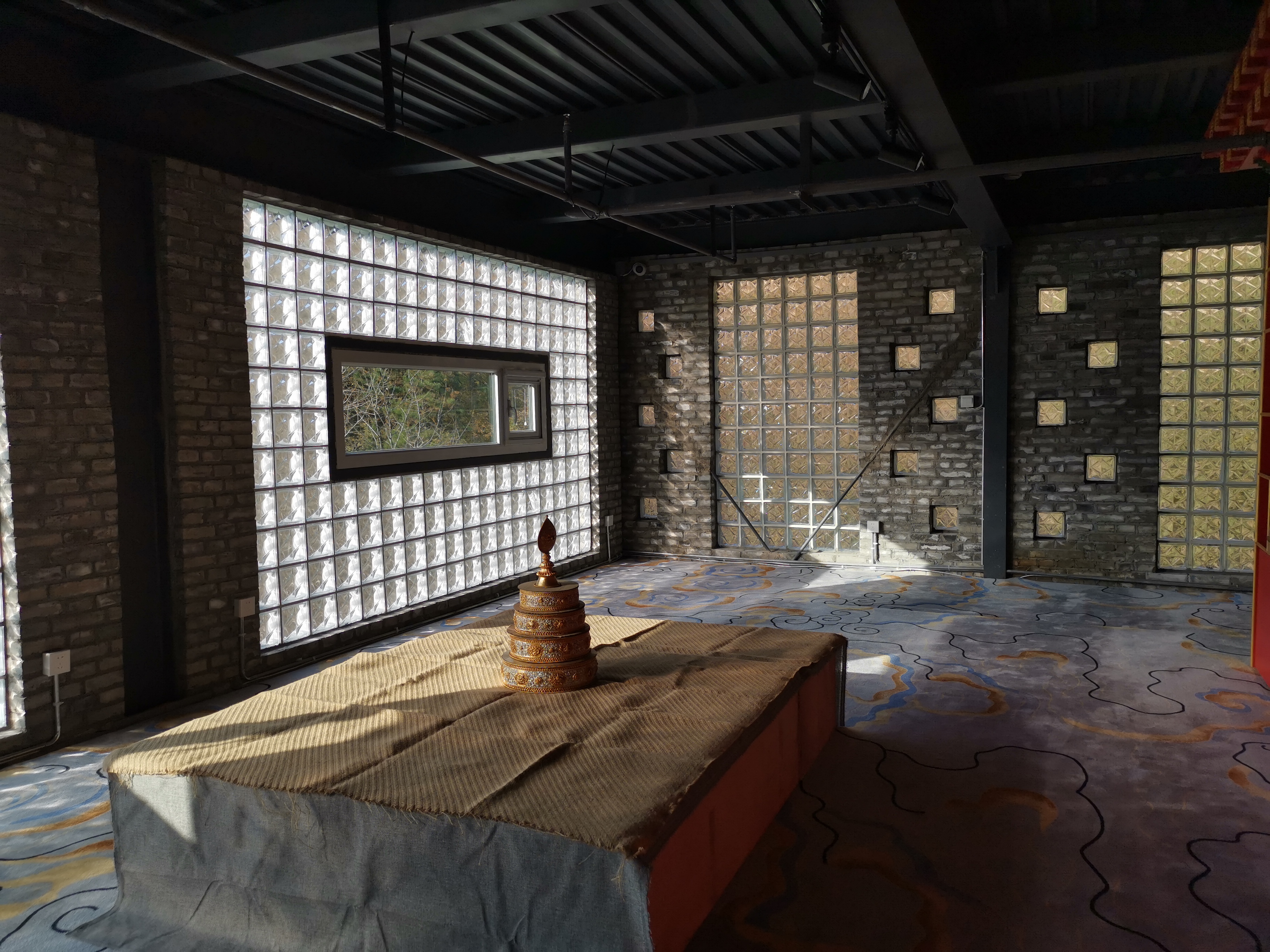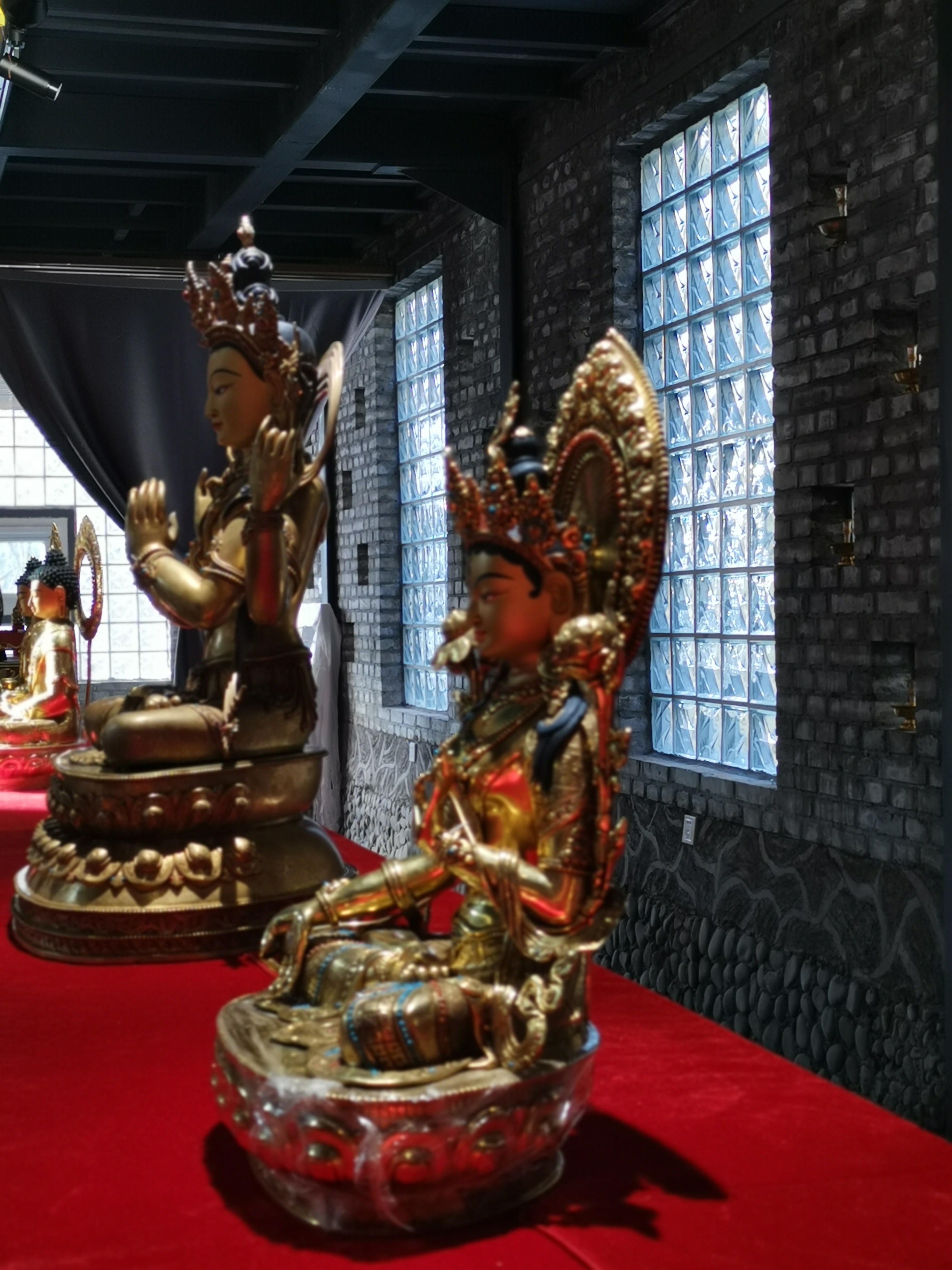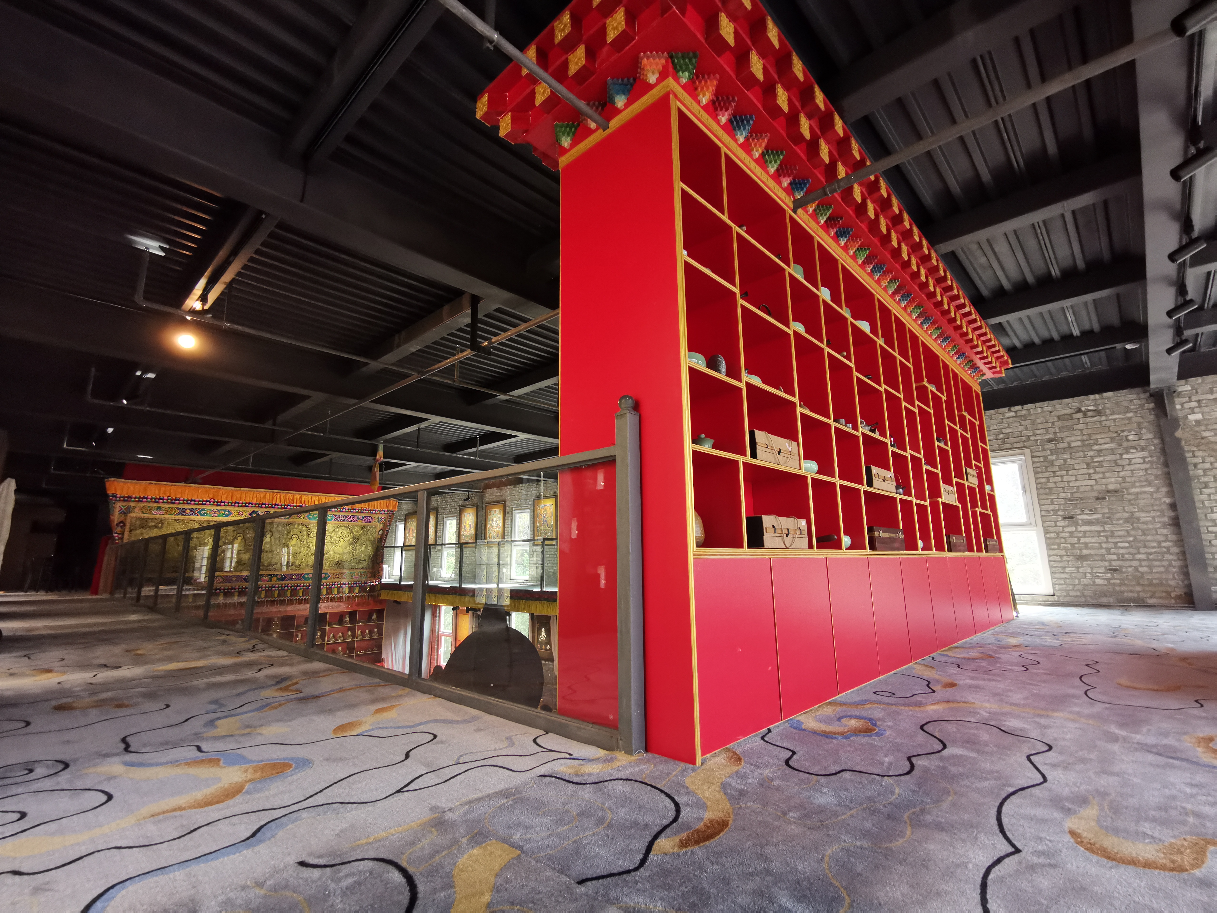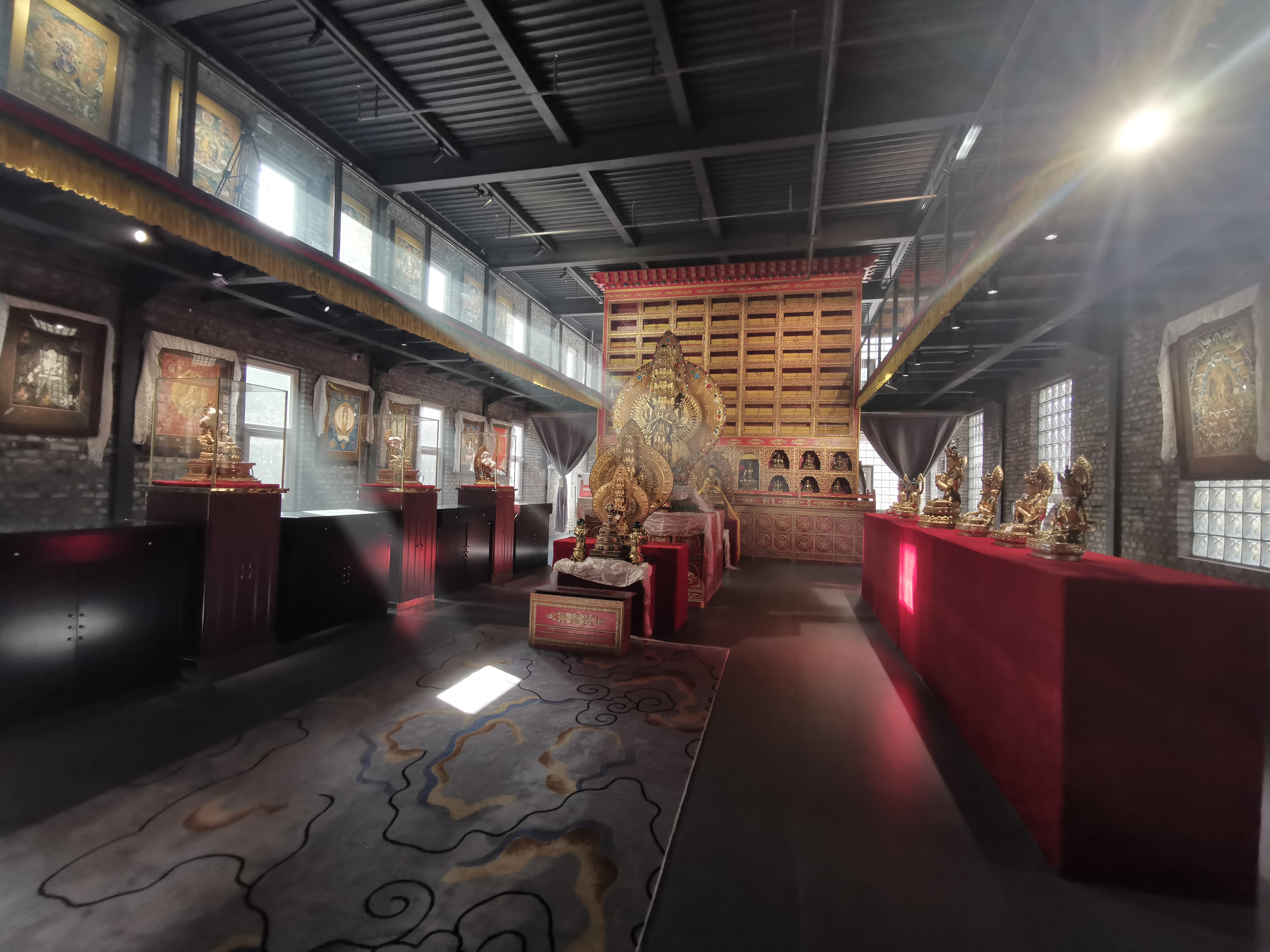空间意境:展厅由一二层两个主要分区组成,一楼展示区占200多平米,主要以尼泊尔手工佛像为主,展厅整体以钢结构,青砖,玻璃砖为基调,金色红色传统纹样柜体为载体。二层以巨幅唐卡和精美工艺品为主要展示,在两侧走廊的设计上作为一个禅修打坐的禅廊,当窗外的阳光照射到禅修者身上的时候,那样的场景真是妙不可言,此为设计上的第一个创新点。同时一楼设置了一个小型多功能厅的区域,作为主人招待朋友的一个地方。我们以利落的裸露的钢架线条度刻出体积,自上而落贯通到底,迸发而出的力量,收纳后再吐露,一楼四条软性的布帘隔开了三个空间,使空间拥有
