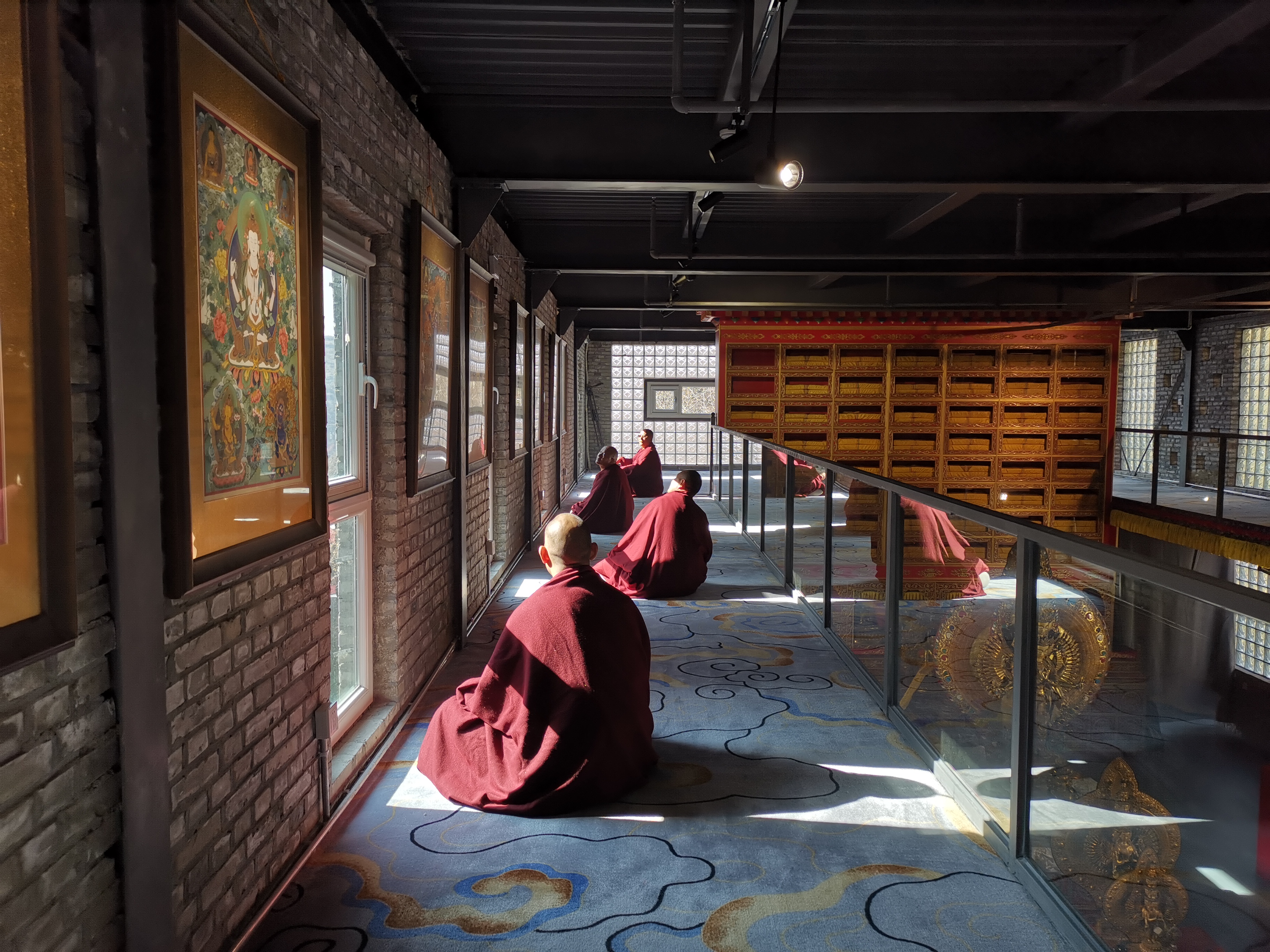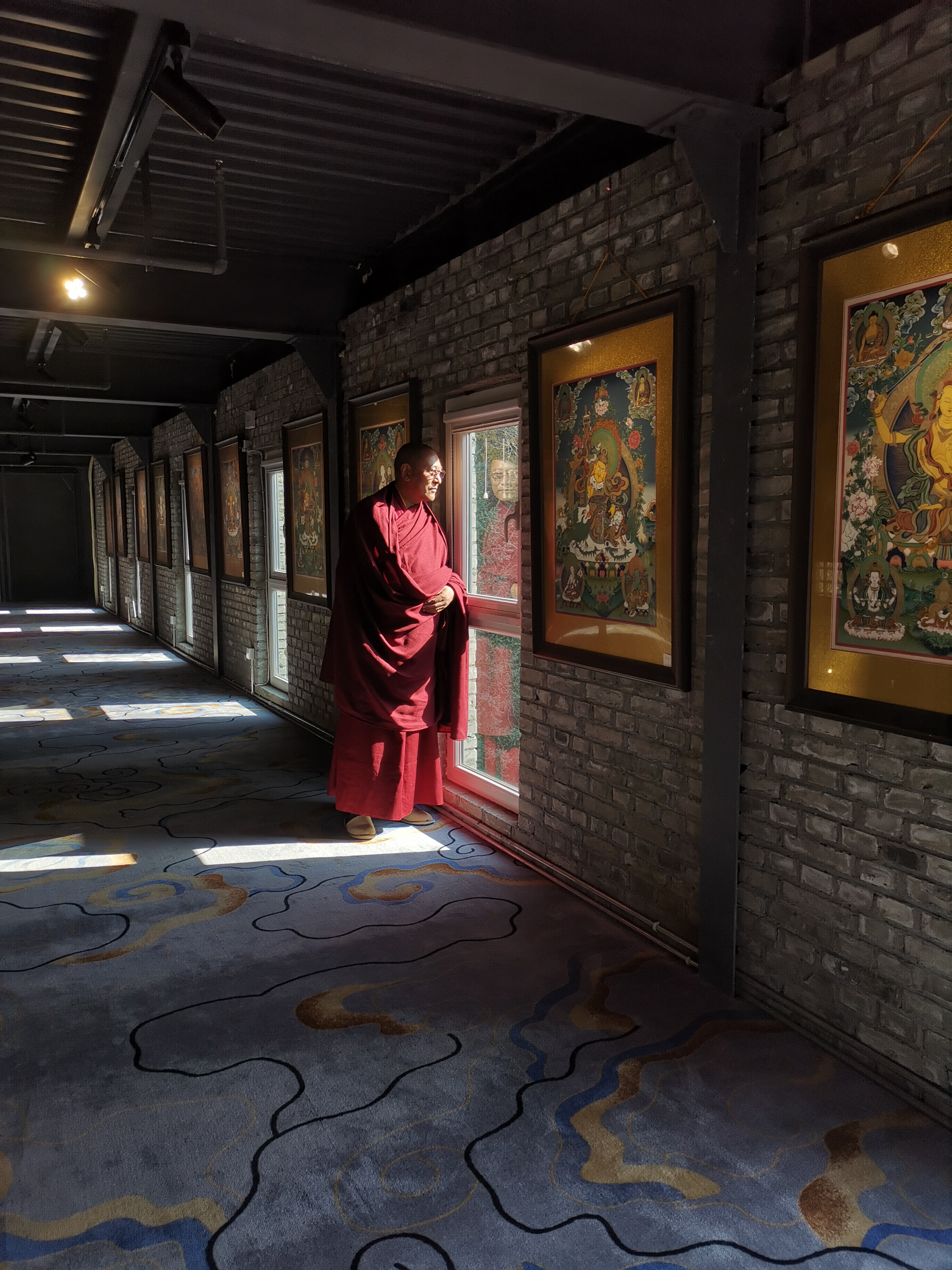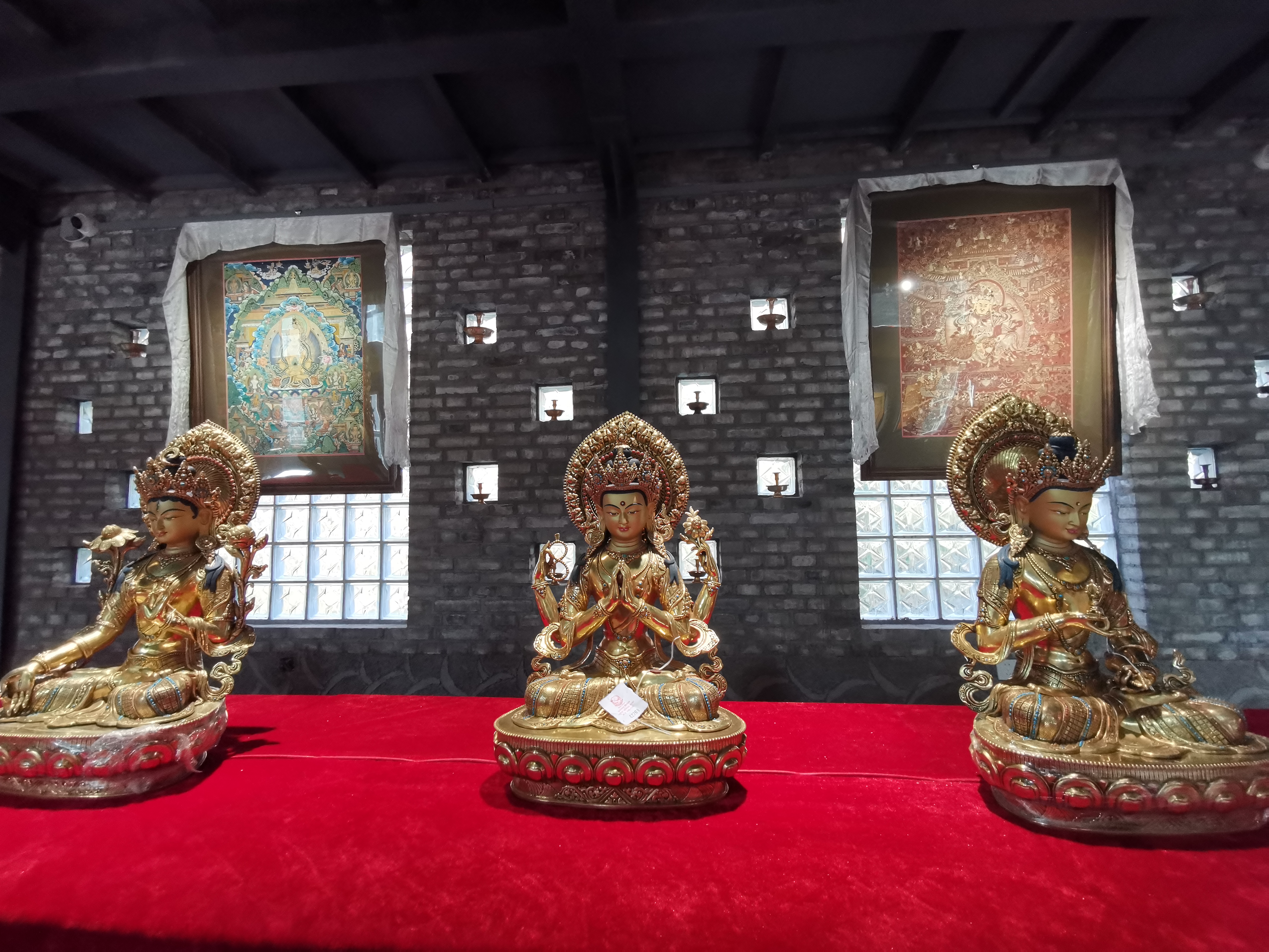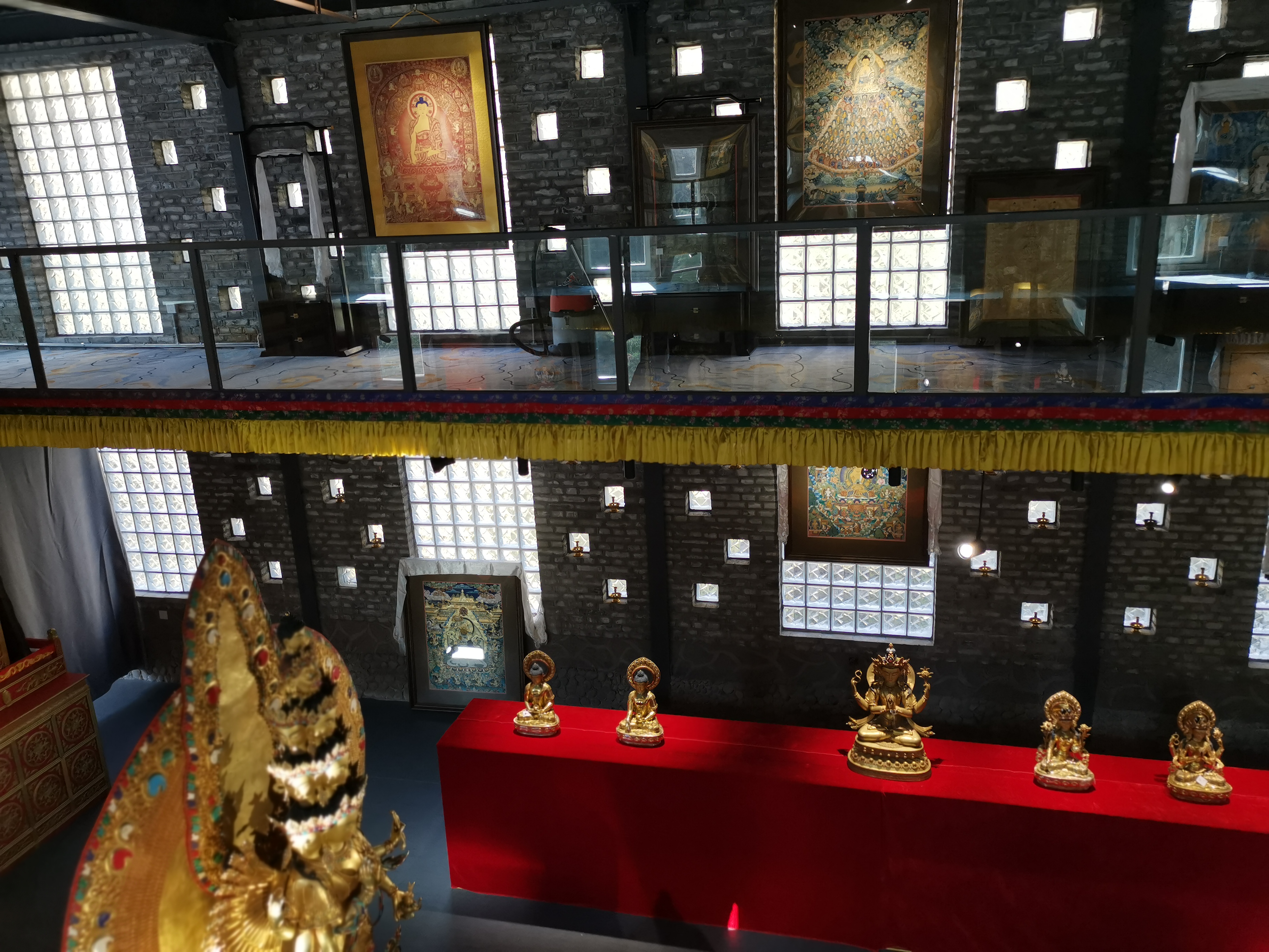 空间意境:展厅由一二层两个主要分区组成,一楼展示区占200多平米,主要以尼泊尔手工佛像为主,展厅整体以钢结构,青砖,玻璃砖为基调,金色红色传统纹样柜体为载体。二层以巨幅唐卡和精美工艺品为主要展示,在两侧走廊的设计上作为一个禅修打坐的禅廊,当窗外的阳光照射到禅修者身上的时候,那样的场景真是妙不可言,此为设计上的第一个创新点。同时一楼设置了一个小型多功能厅的区域,作为主人招待朋友的一个地方。我们以利落的裸露的钢架线条度刻出体积,自上而落贯通到底,迸发而出的力量,收纳后再吐露,一楼四条软性的布帘隔开了三个空间,使空间拥有