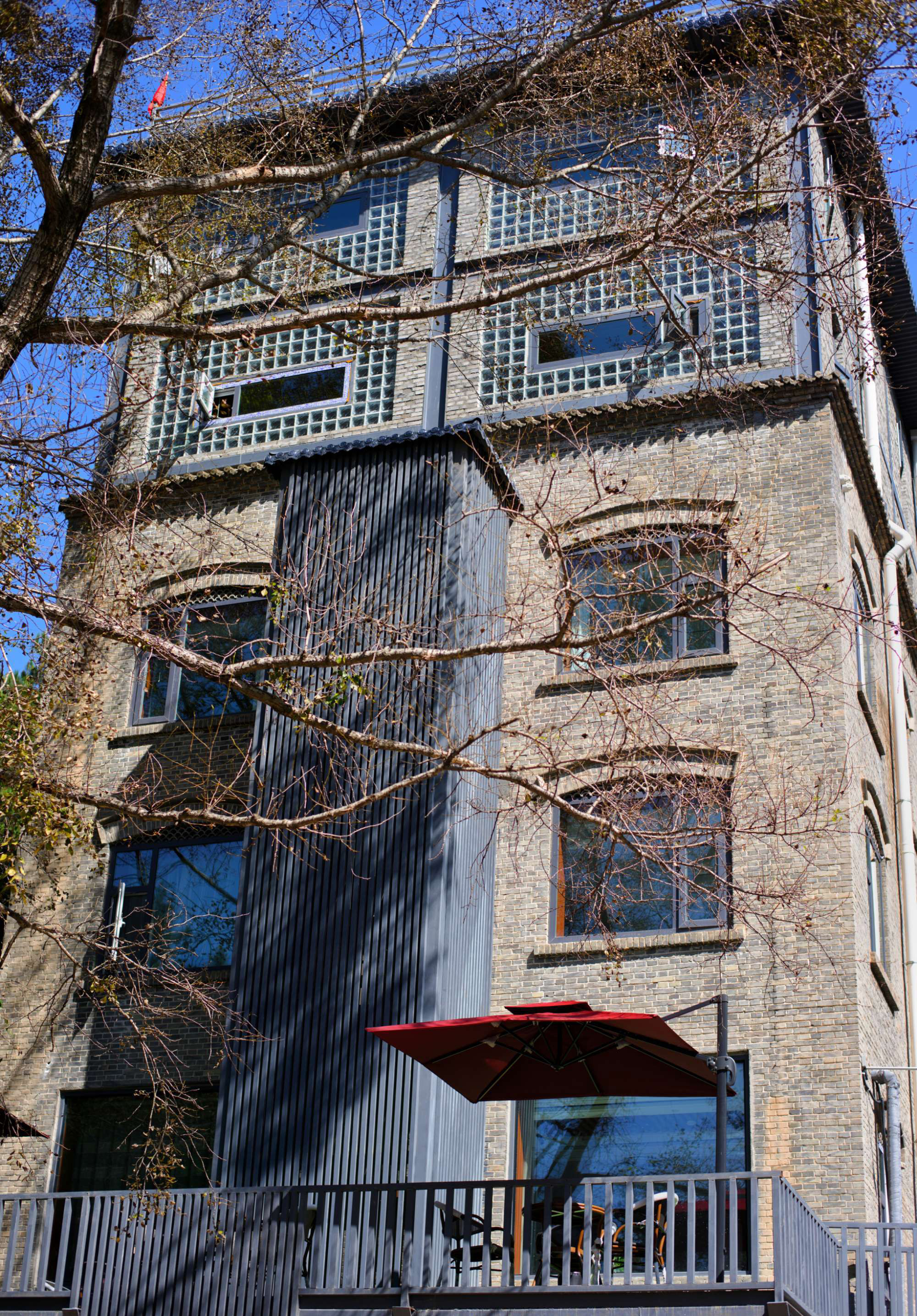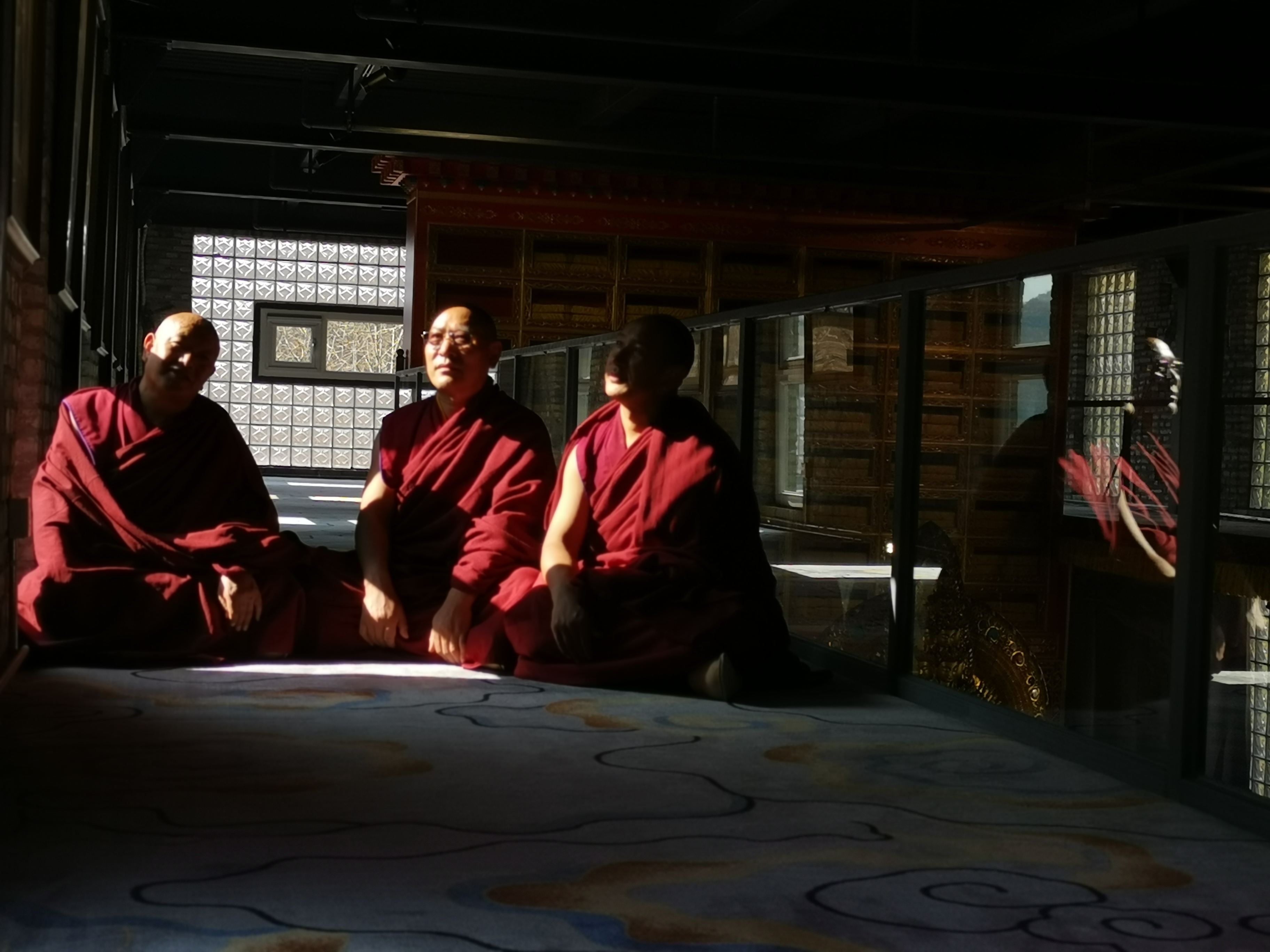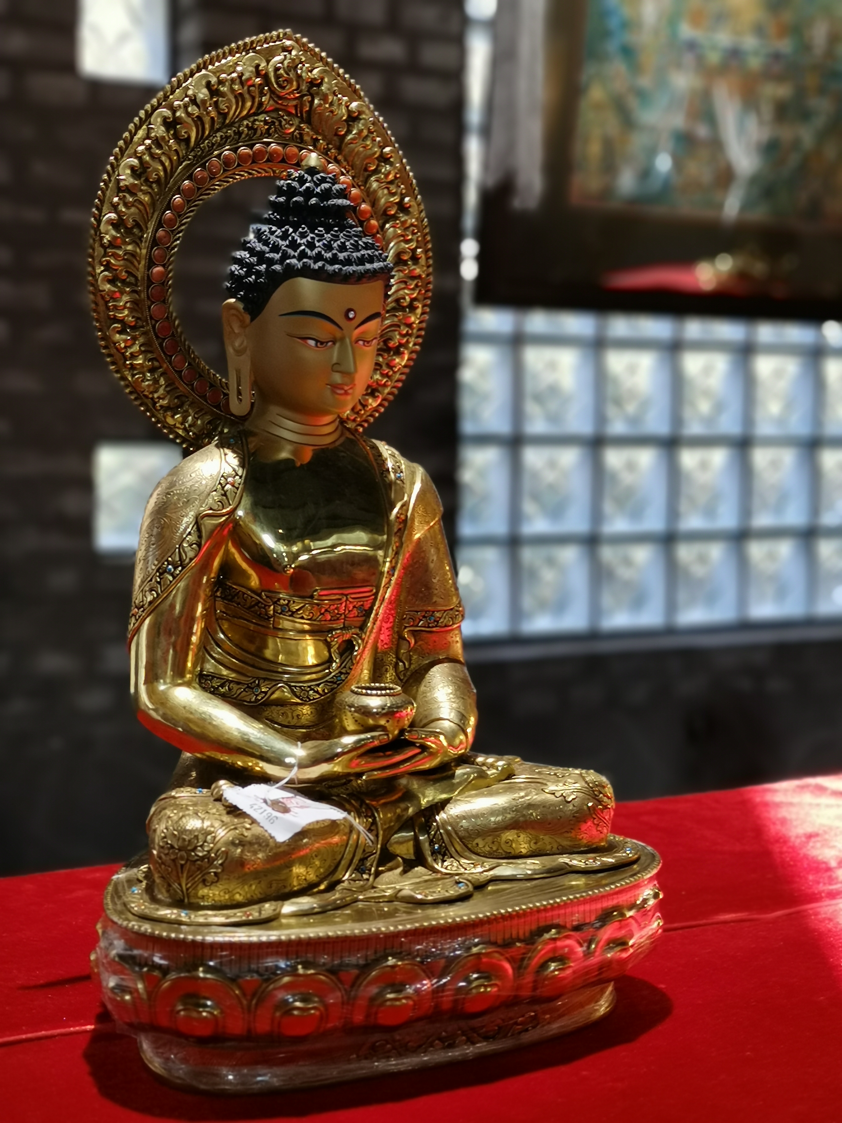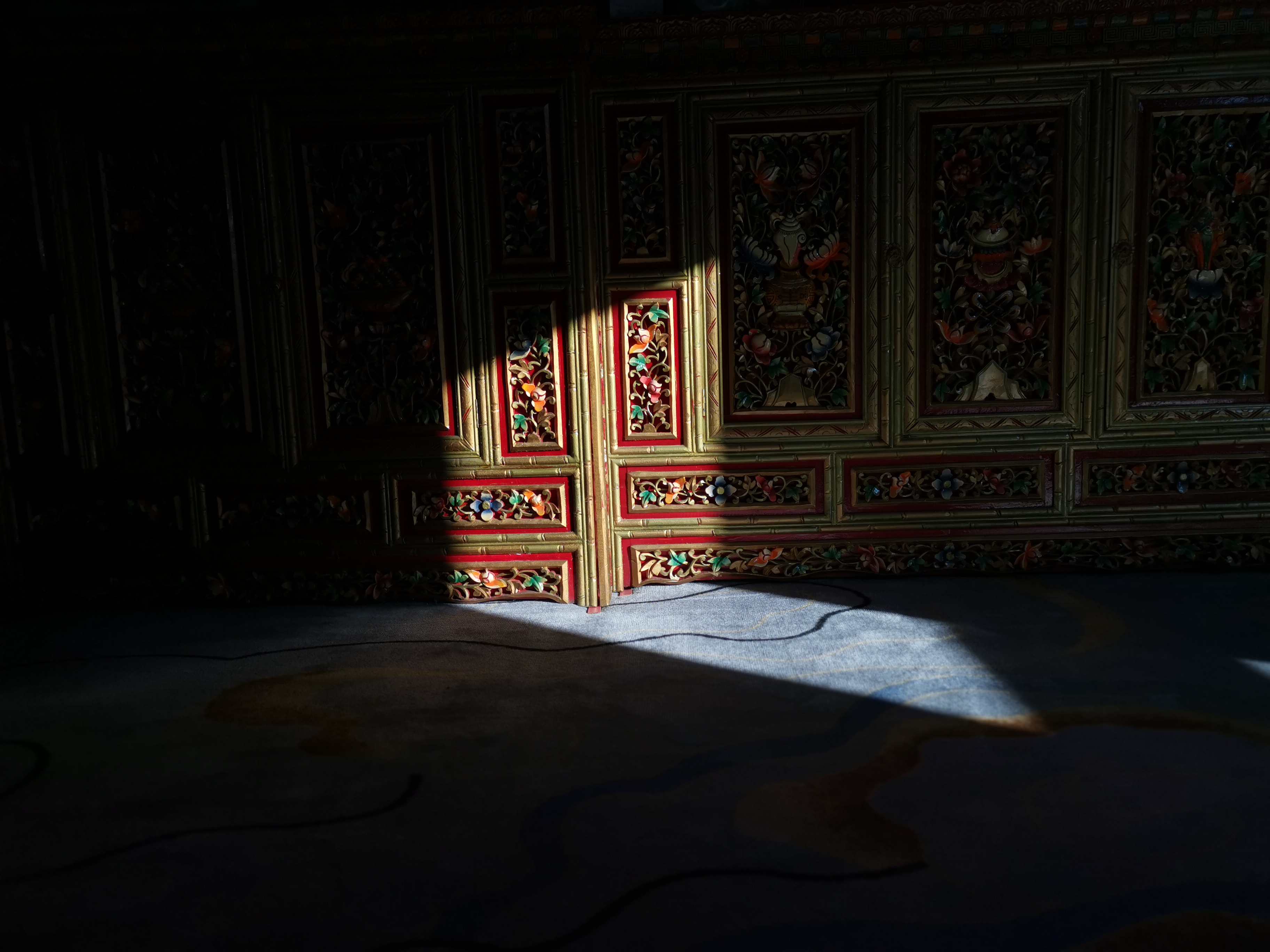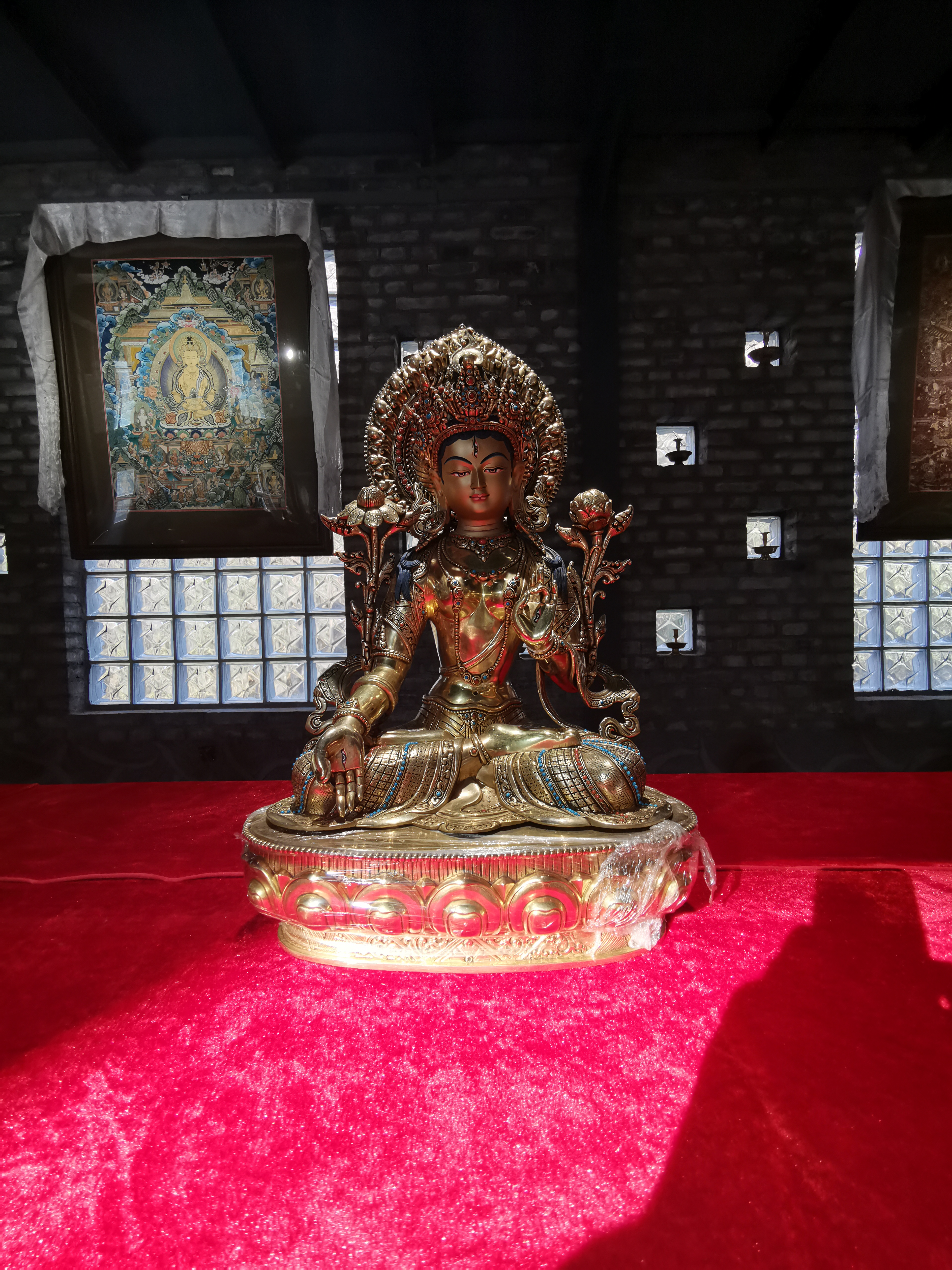 空间意境:展厅由一二层两个主要分区组成,一楼展示区占200多平米,主要以尼泊尔手工佛像为主,展厅整体以钢结构,青砖,玻璃砖为基调,金色红色传统纹样柜体为载体。二层以巨幅唐卡和精美工艺品为主要展示,在两侧走廊的设计上作为一个禅修打坐的禅廊,当窗外的阳光照射到禅修者身上的时候,那样的场景真是妙不可言,此为设计上的第一个创新点。同时一楼设置了一个小型多功能厅的区域,作为主人招待朋友的一个地方。我们以利落的裸露的钢架线条度刻出体积,自上而落贯通到底,迸发而出的力量,收纳后再吐露,一楼四条软性的布帘隔开了三个空间,使空间拥有