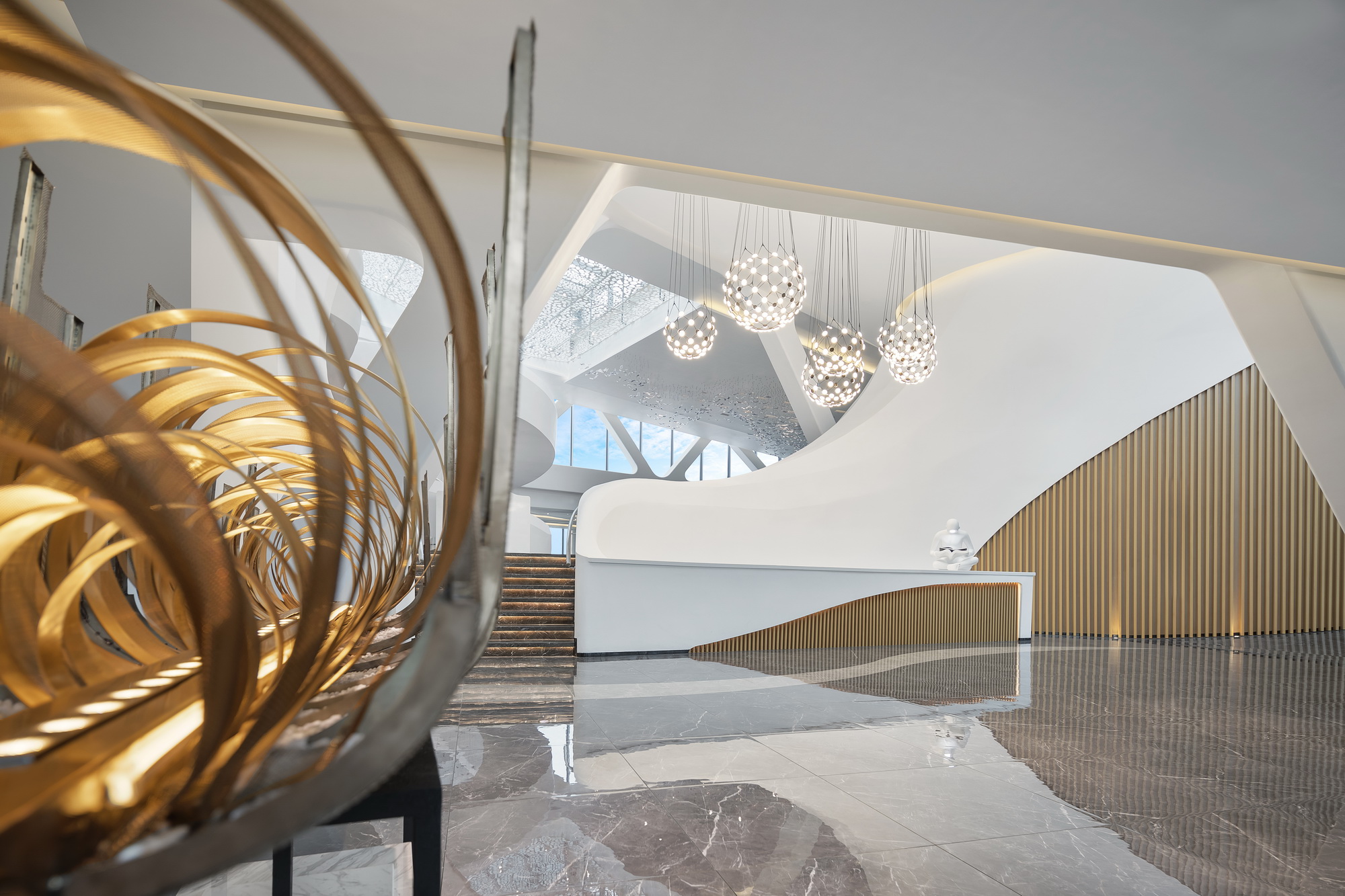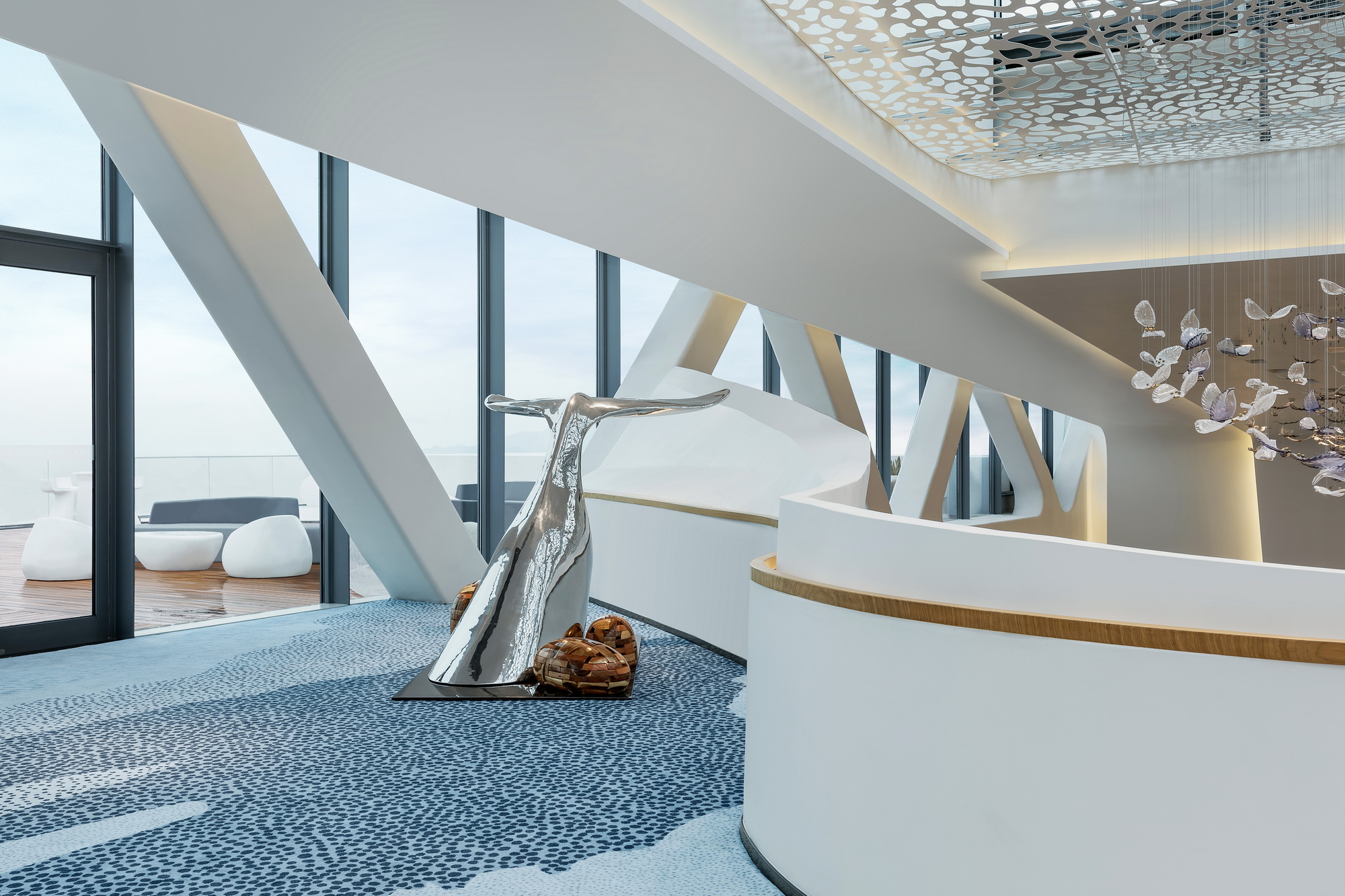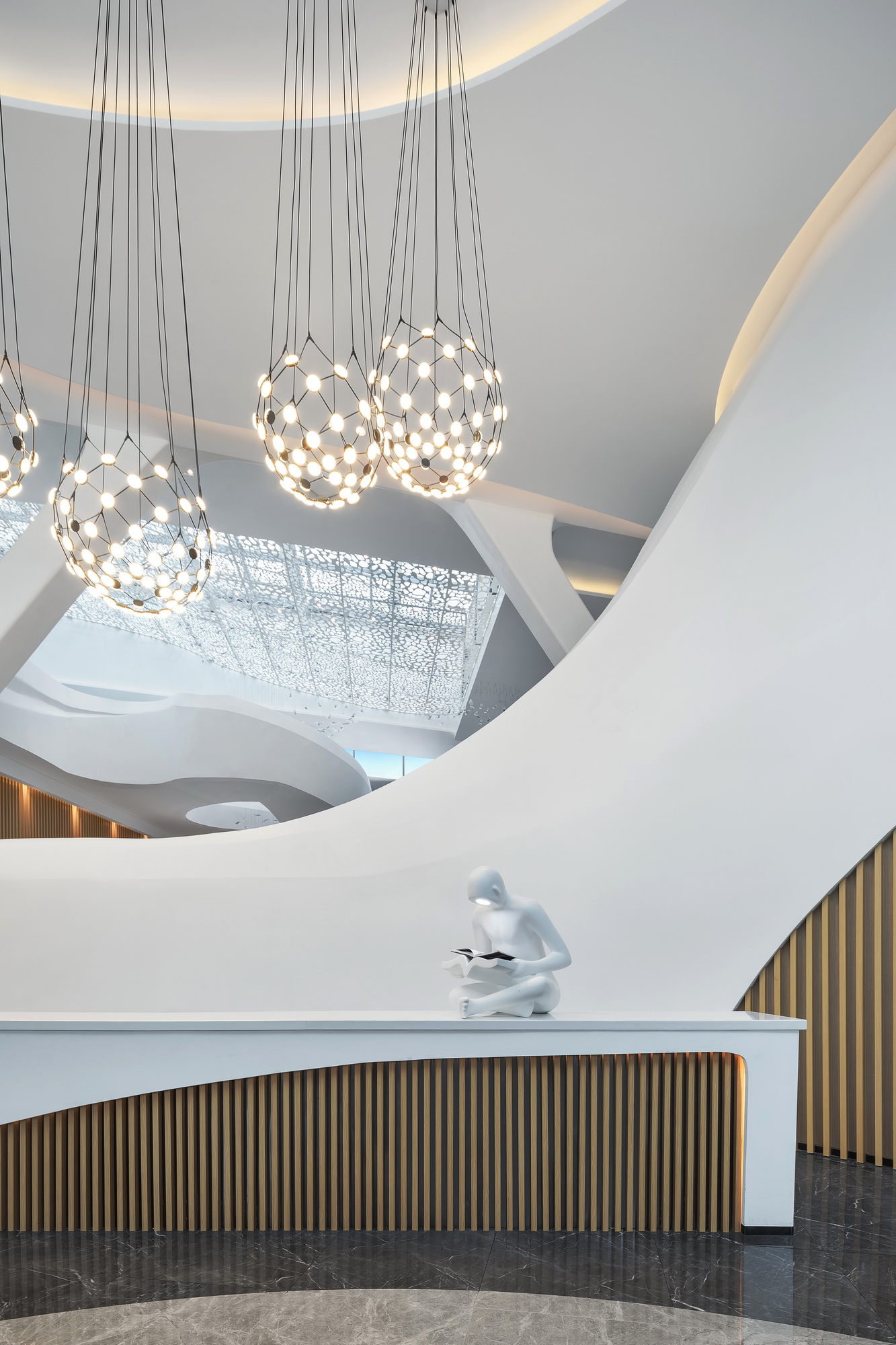 接待总台取形于渔网的艺术吊灯,以近乎透明的网状结构,隐藏器具的物质形式,凸显“光”的真正地位。“海鸥之翼”玻璃艺术吊灯,从沙盘区蔓延至艺术书吧,将海洋灵动的生命力带入空间。