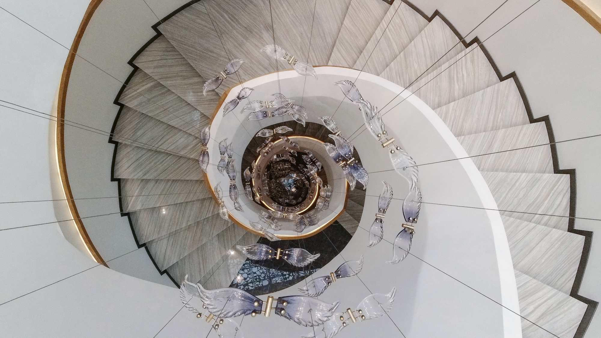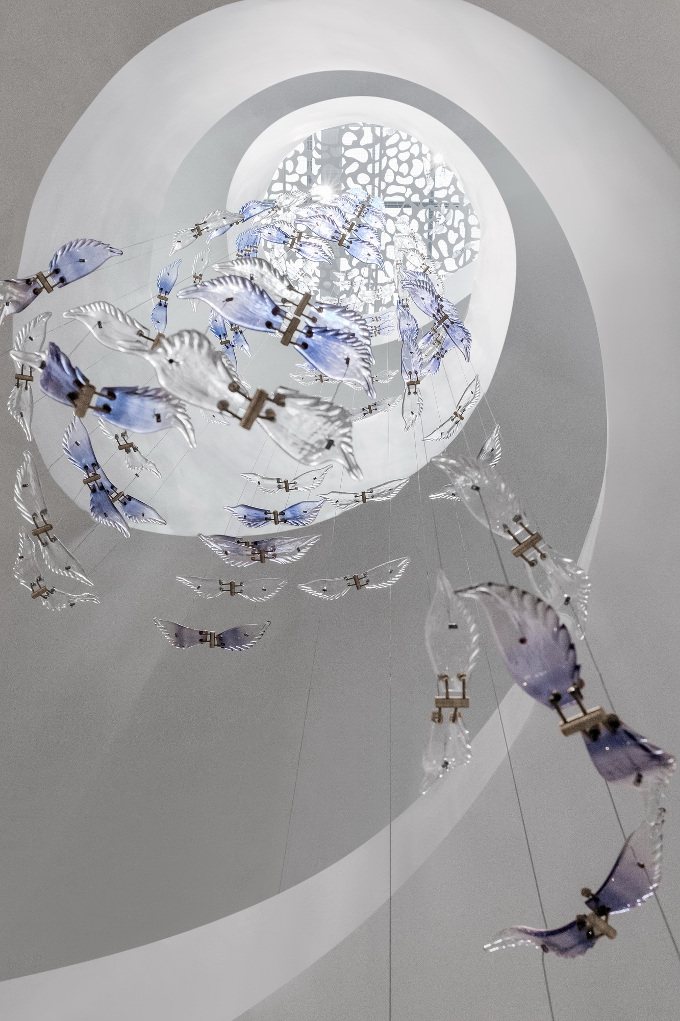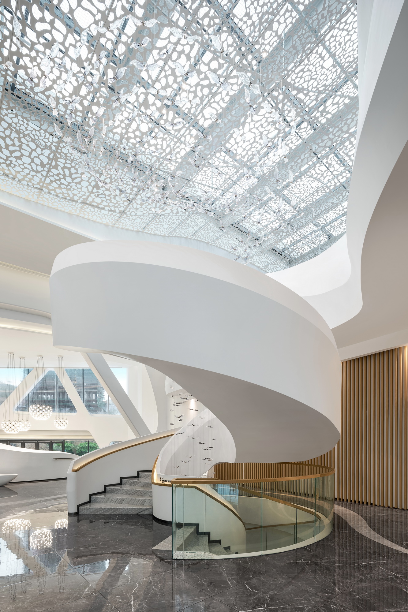 接待总台取形于渔网的艺术吊灯,以近乎透明的网状结构,隐藏器具的物质形式,凸显“光”的真正地位。“海鸥之翼”玻璃艺术吊灯,从沙盘区蔓延至艺术书吧,将海洋灵动的生命力带入空间。