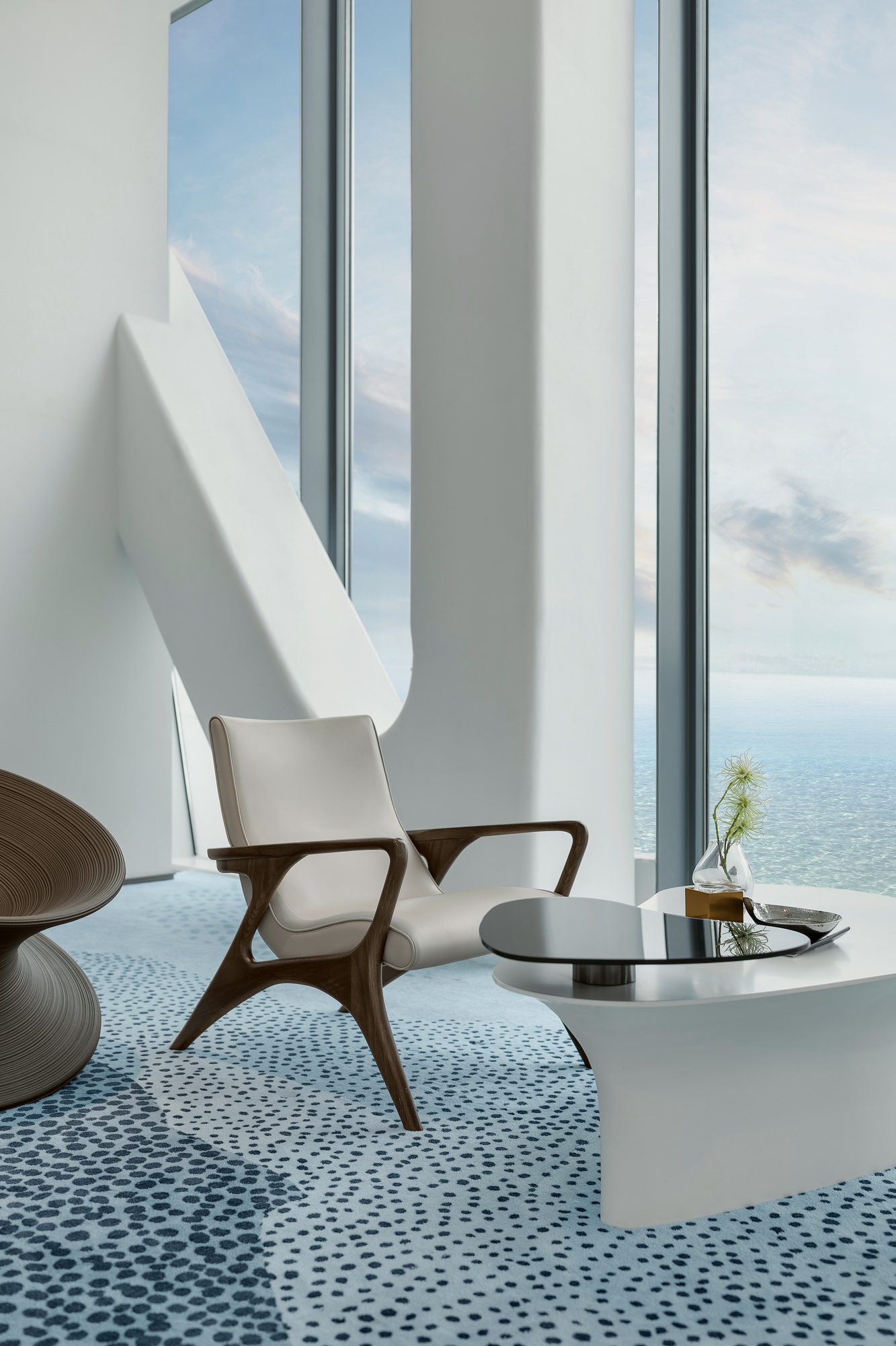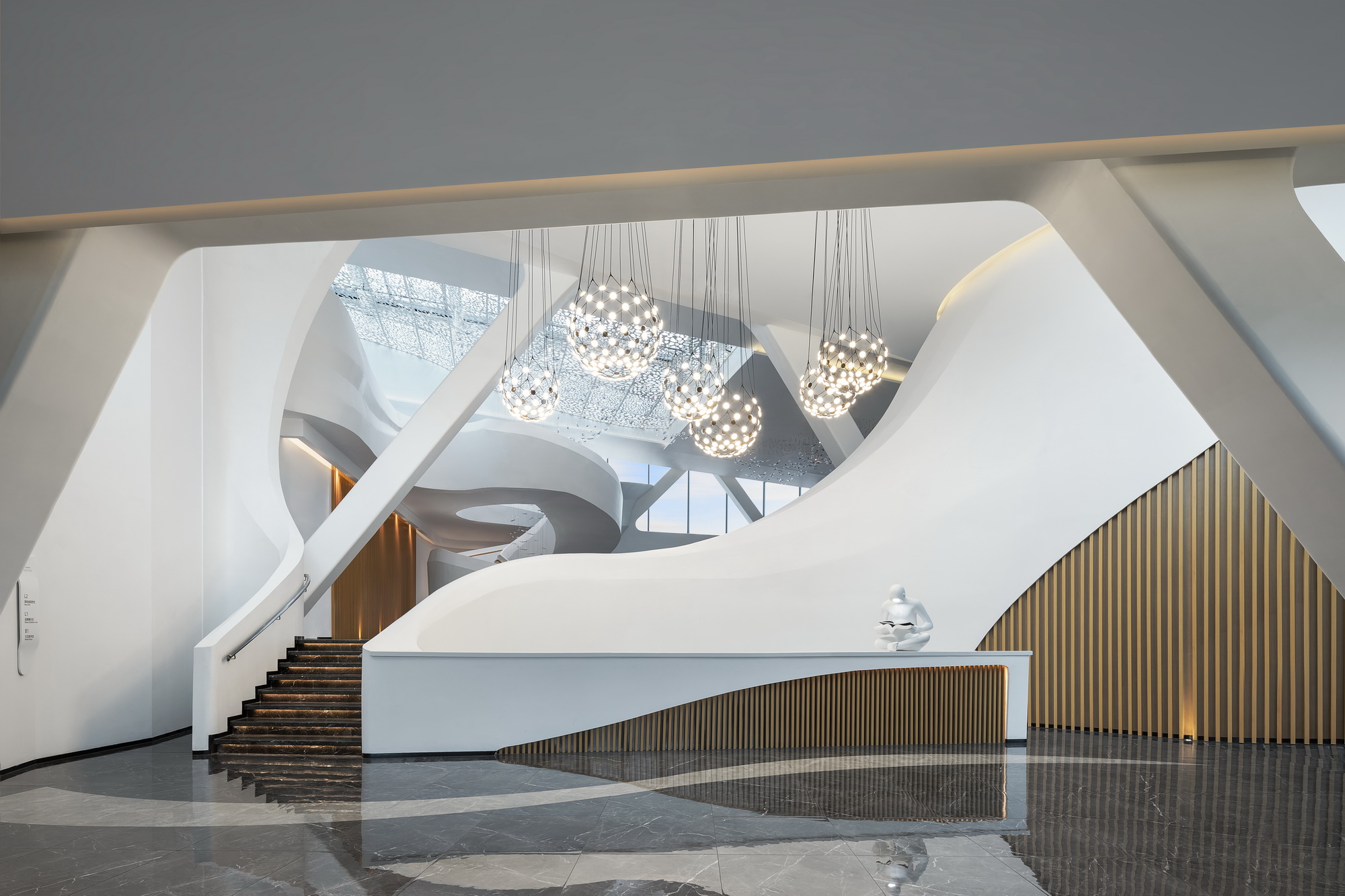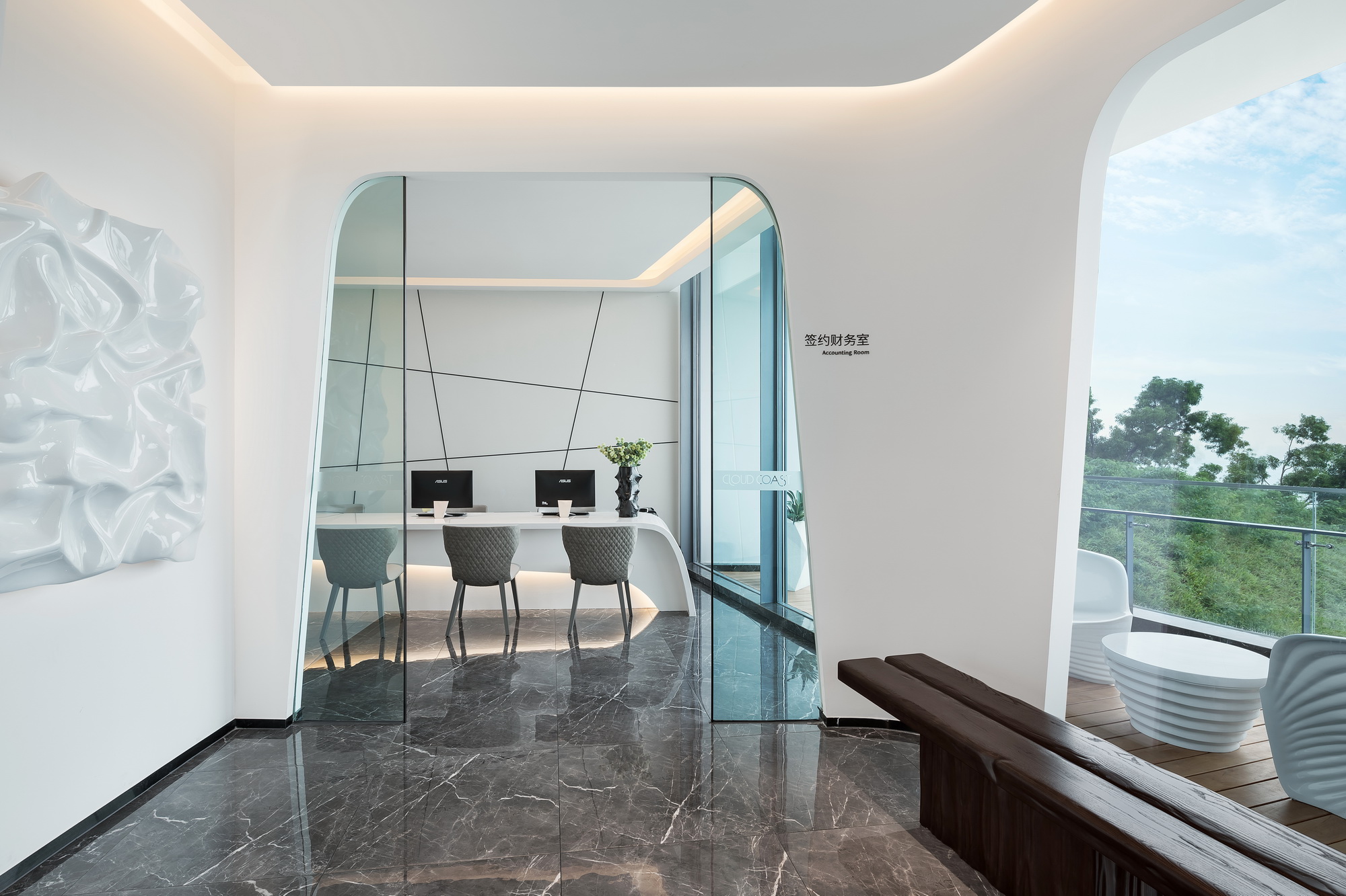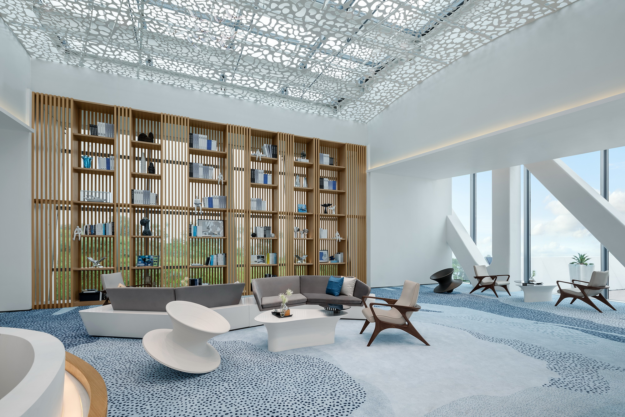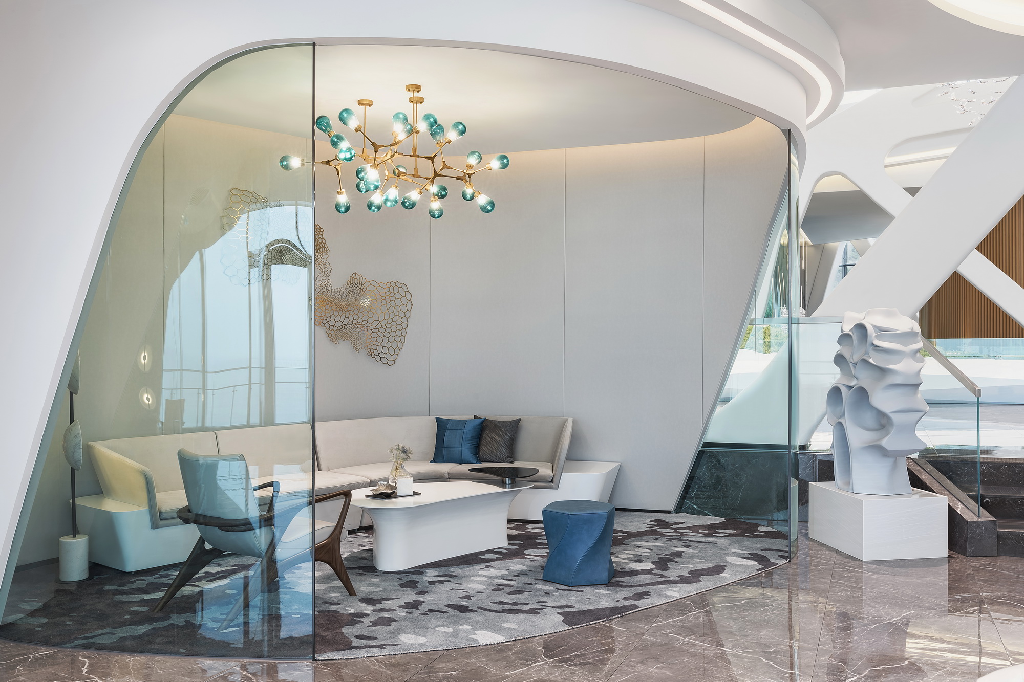 软装色彩延续了硬装白色主调的时尚简约气质,同时融入浅灰、海洋蓝等辅调,模糊商业与艺术的边界,拉近人与空间的距离。家具、艺术品极具现代感的曲线与造型,抽象演绎山林海洋的自然景物,营造出“馆在山海中,馆内藏山海”的空间意境。