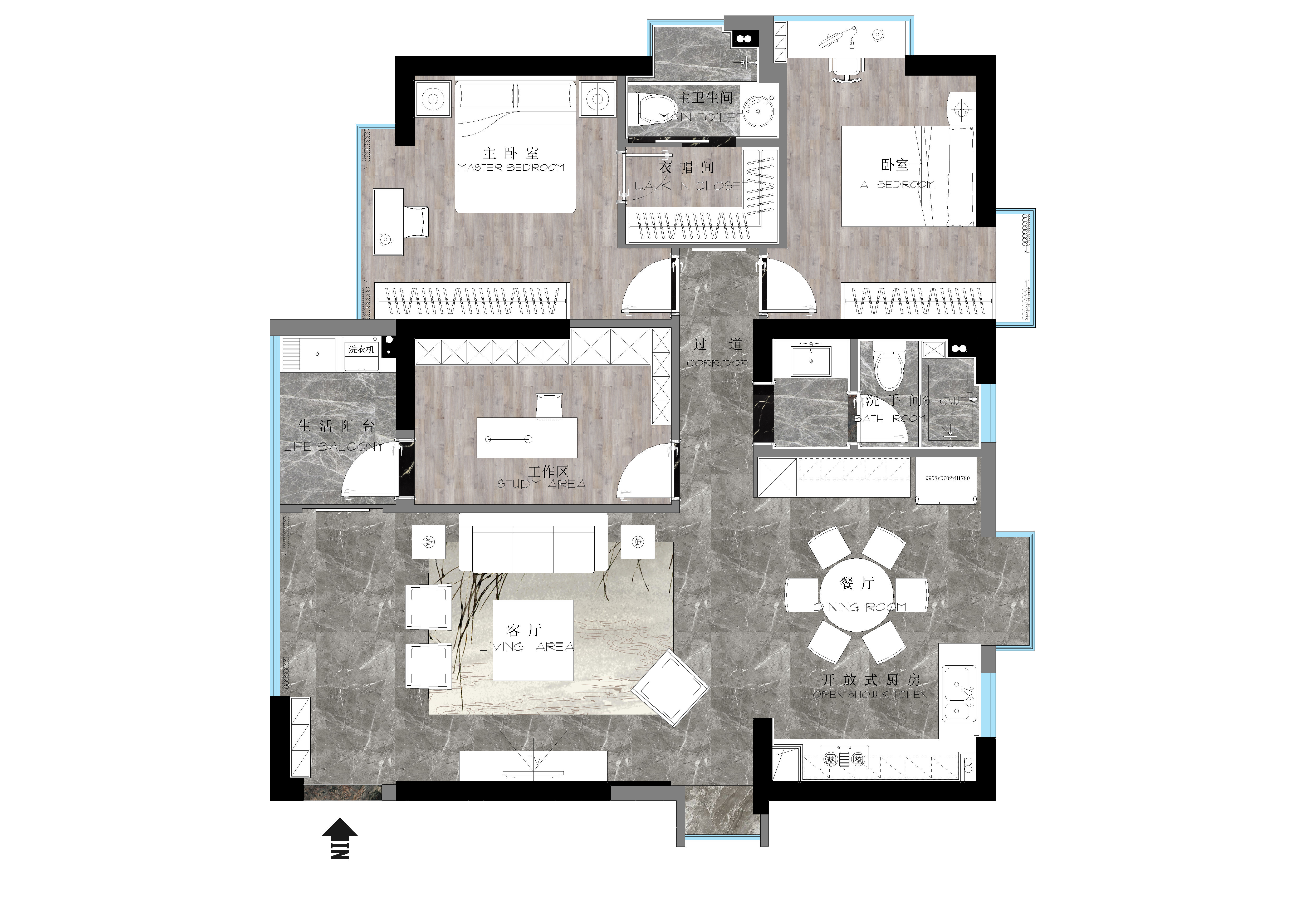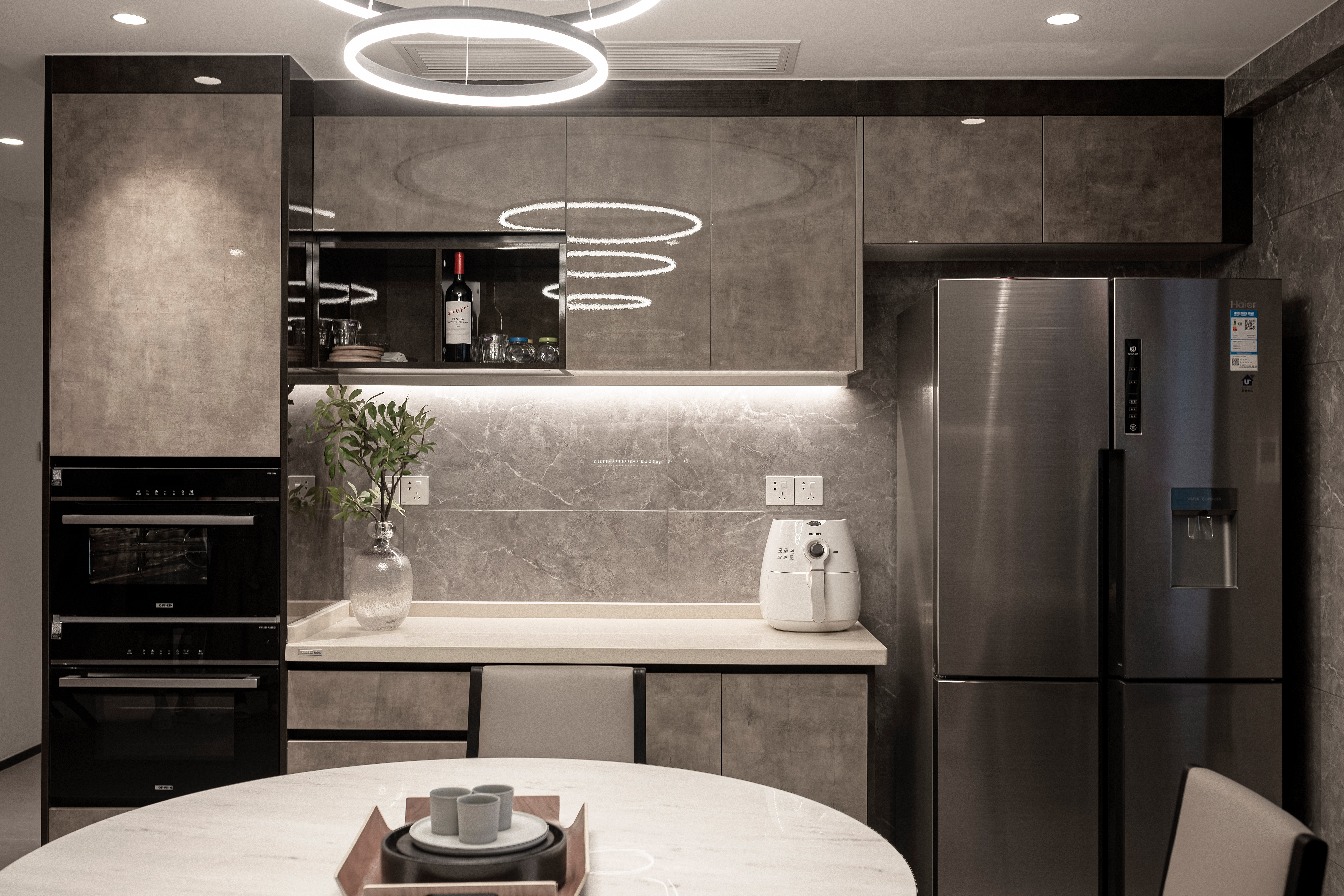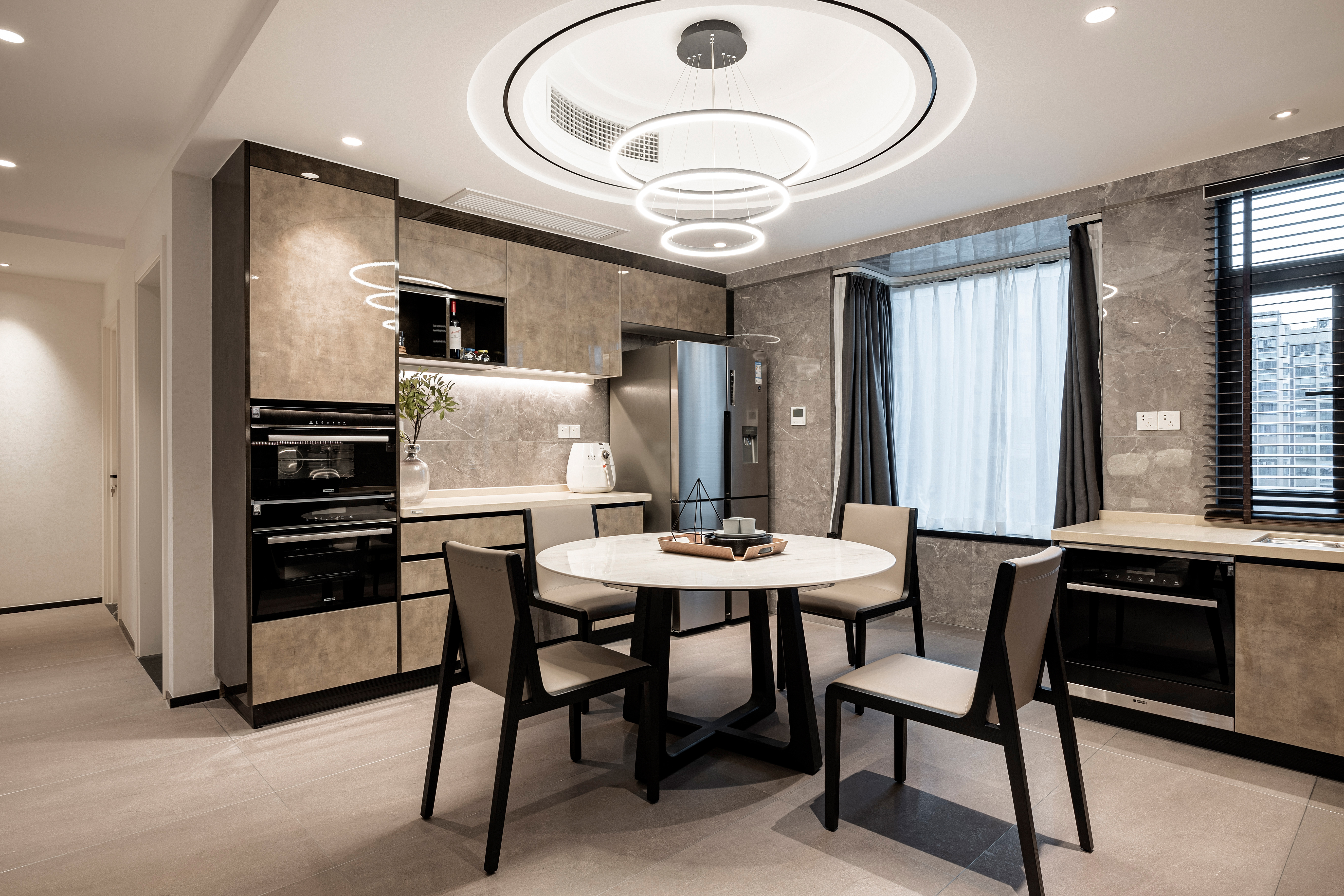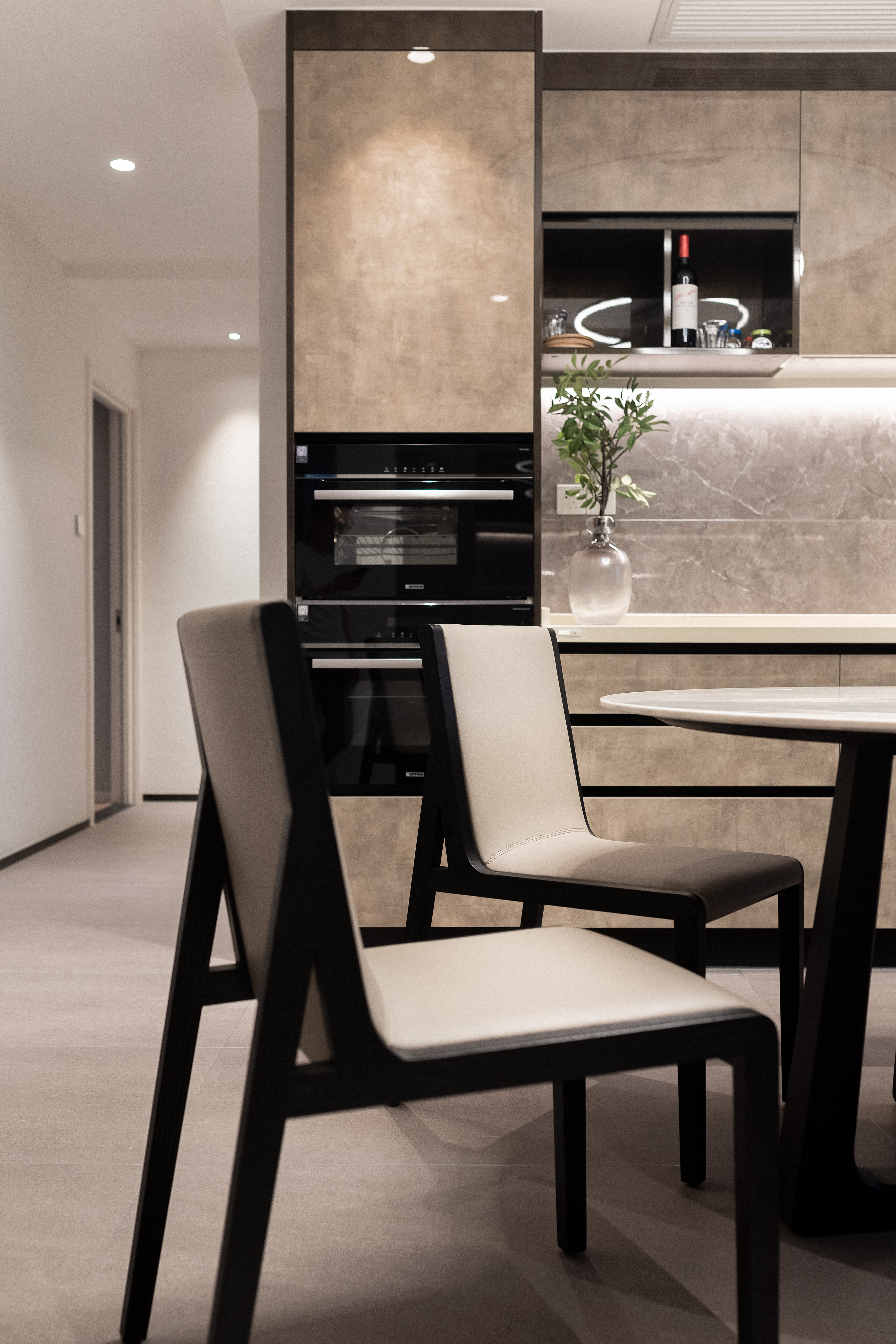 本案在空间布局方面例采用开放式的设计手法,客、餐厅、厨房连接在一起延伸了空间的视觉感,使每个空间之间的互动更加密切,家人的互动更加亲密