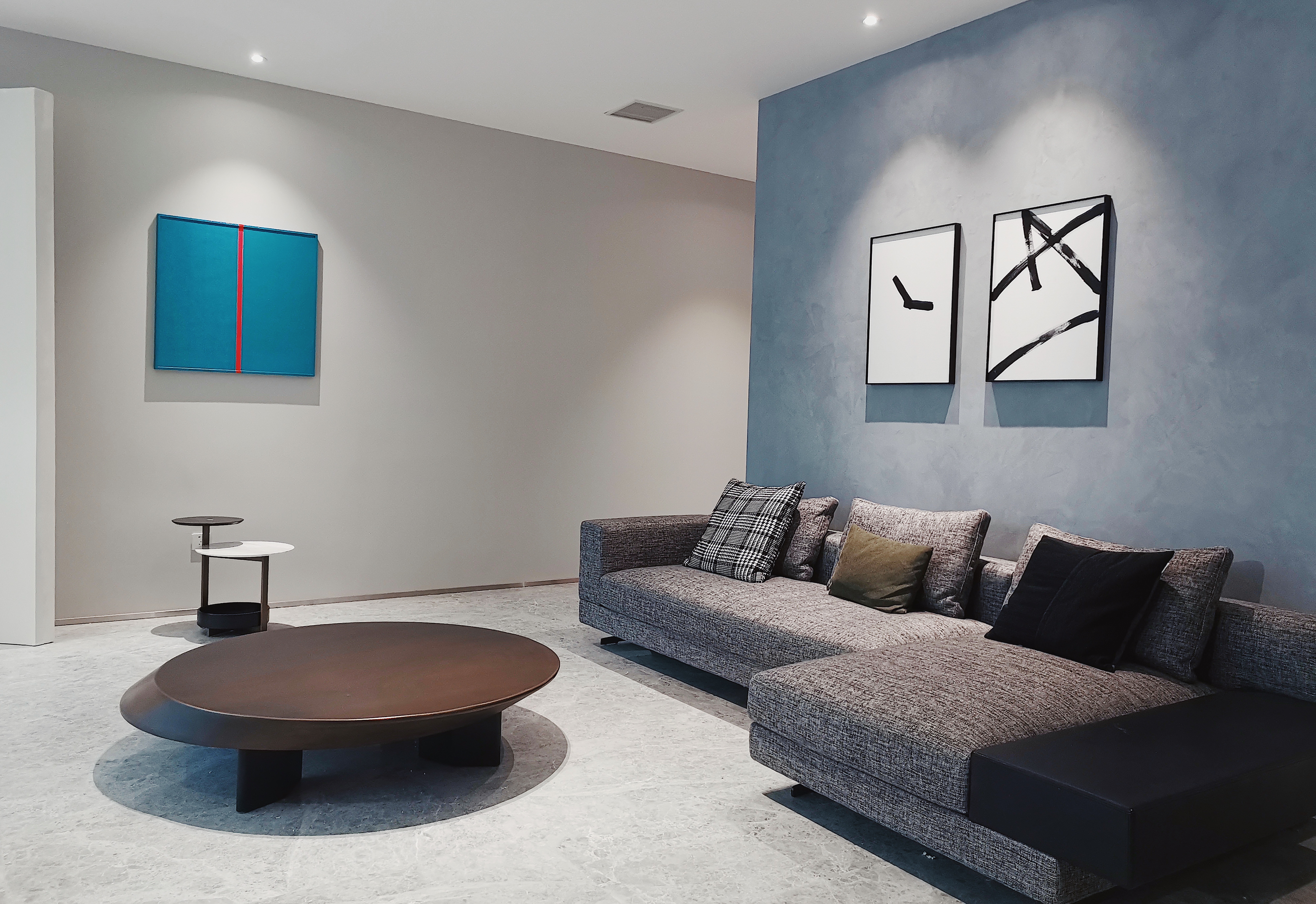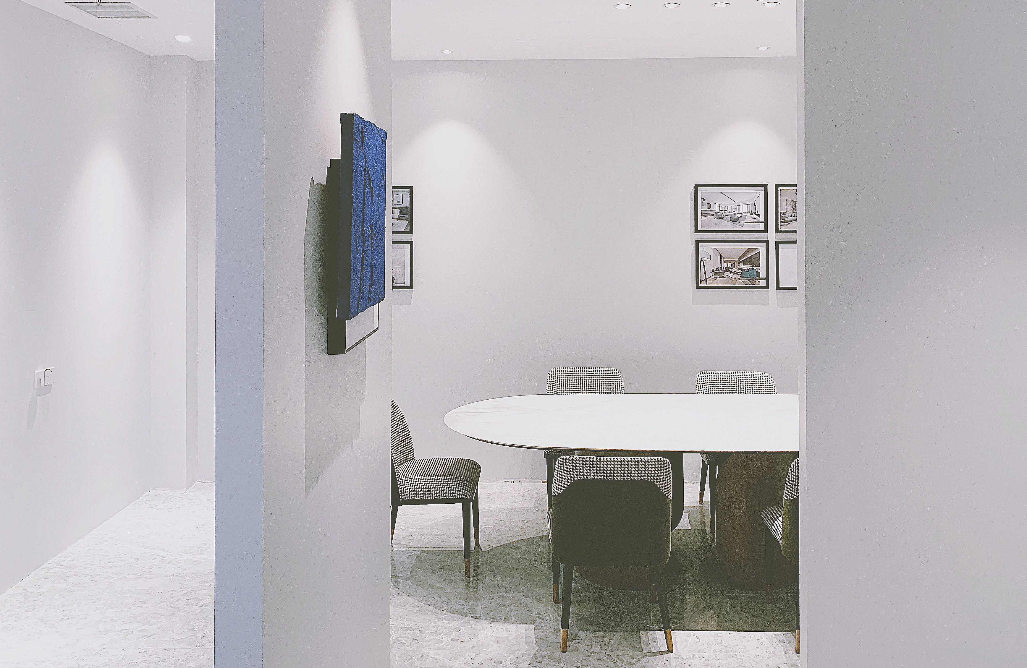 空间意境:基础结构我拒绝了缤纷的色彩,只留灰与白的交融,使得胚底一如画布,但自由的留白似乎缺少一丝张力,于是:克莱因蓝冷静而沉稳形成一种特殊的孤独感,与前厅蓝色体块有了延续和反复性,黑白人像有种莫名的情绪,是平静 是愤怒 是热烈 或是绝望,画面留给记忆做伴,时间里都会遇见自己