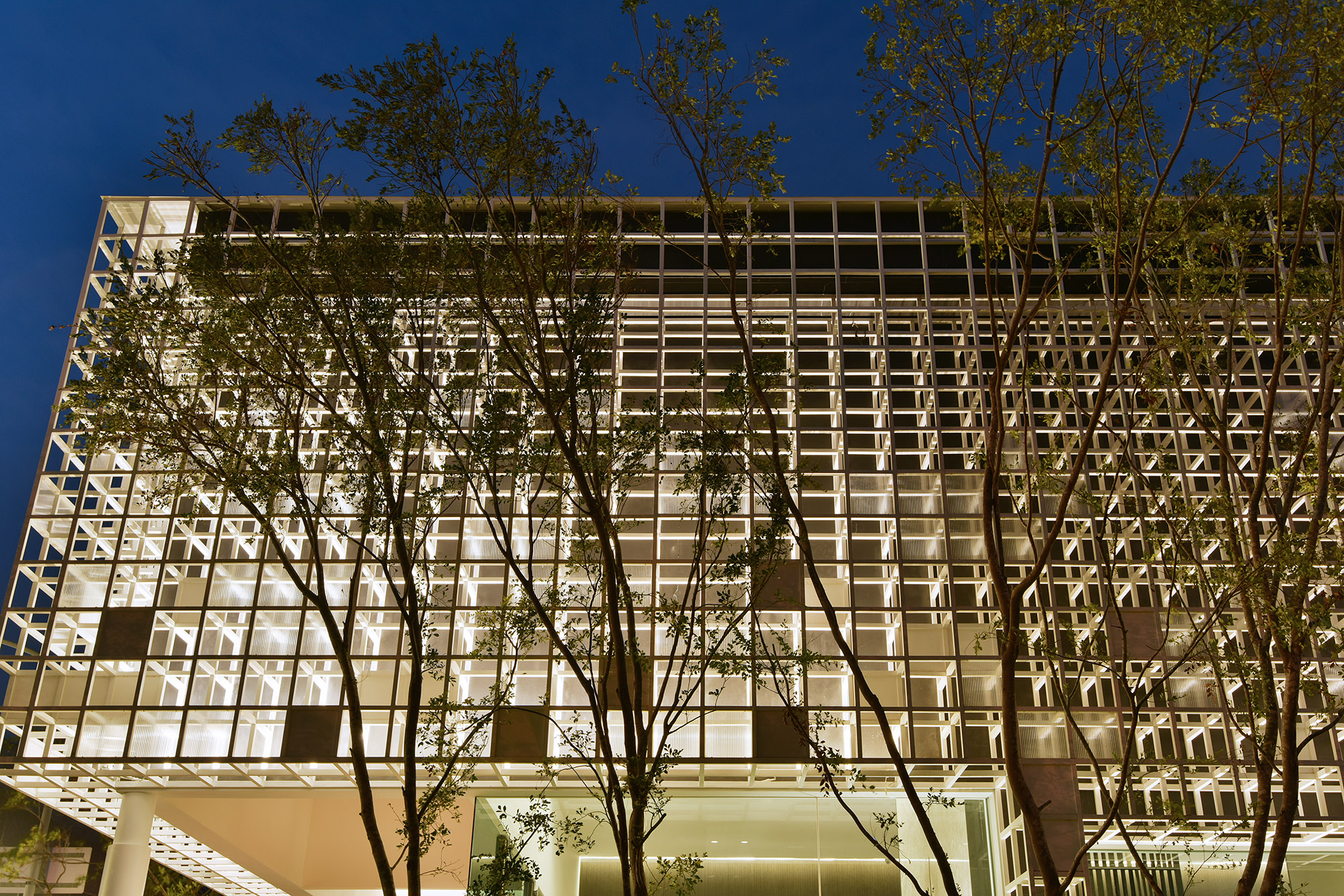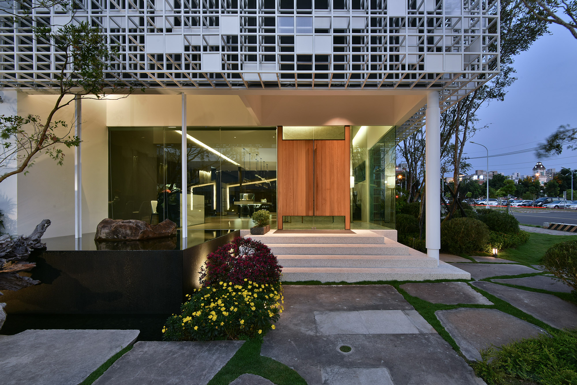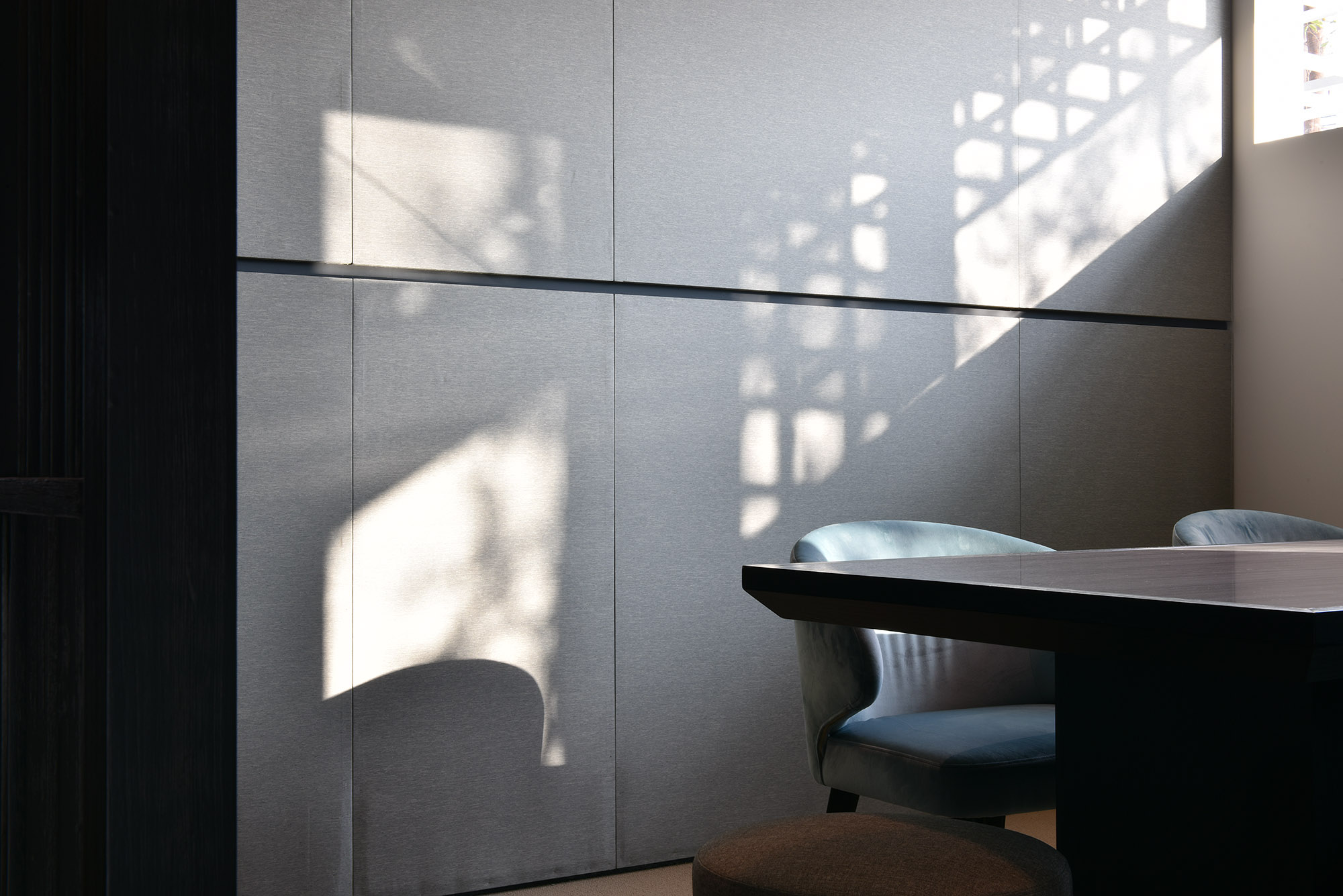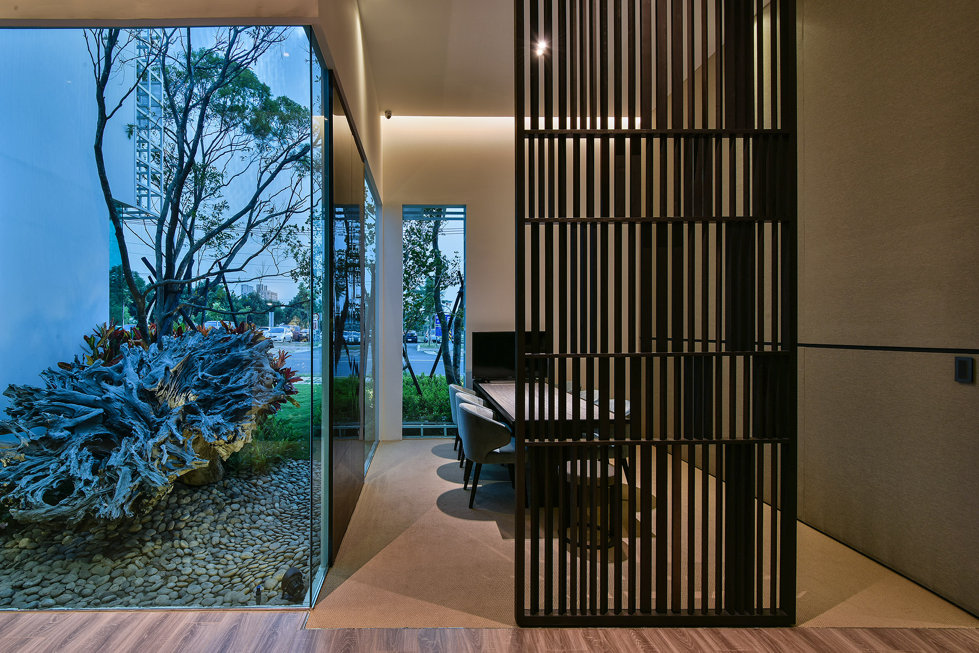 空間一側以半鏤空深色木格柵區隔出洽談空間,光線自外部格狀造型入口照射,掌握光影的藝術,美感盡收眼底。藉由空間內縮,搭配綠色玻璃,戶外枯木軟石乾景映入室內,與入口水井相呼應。