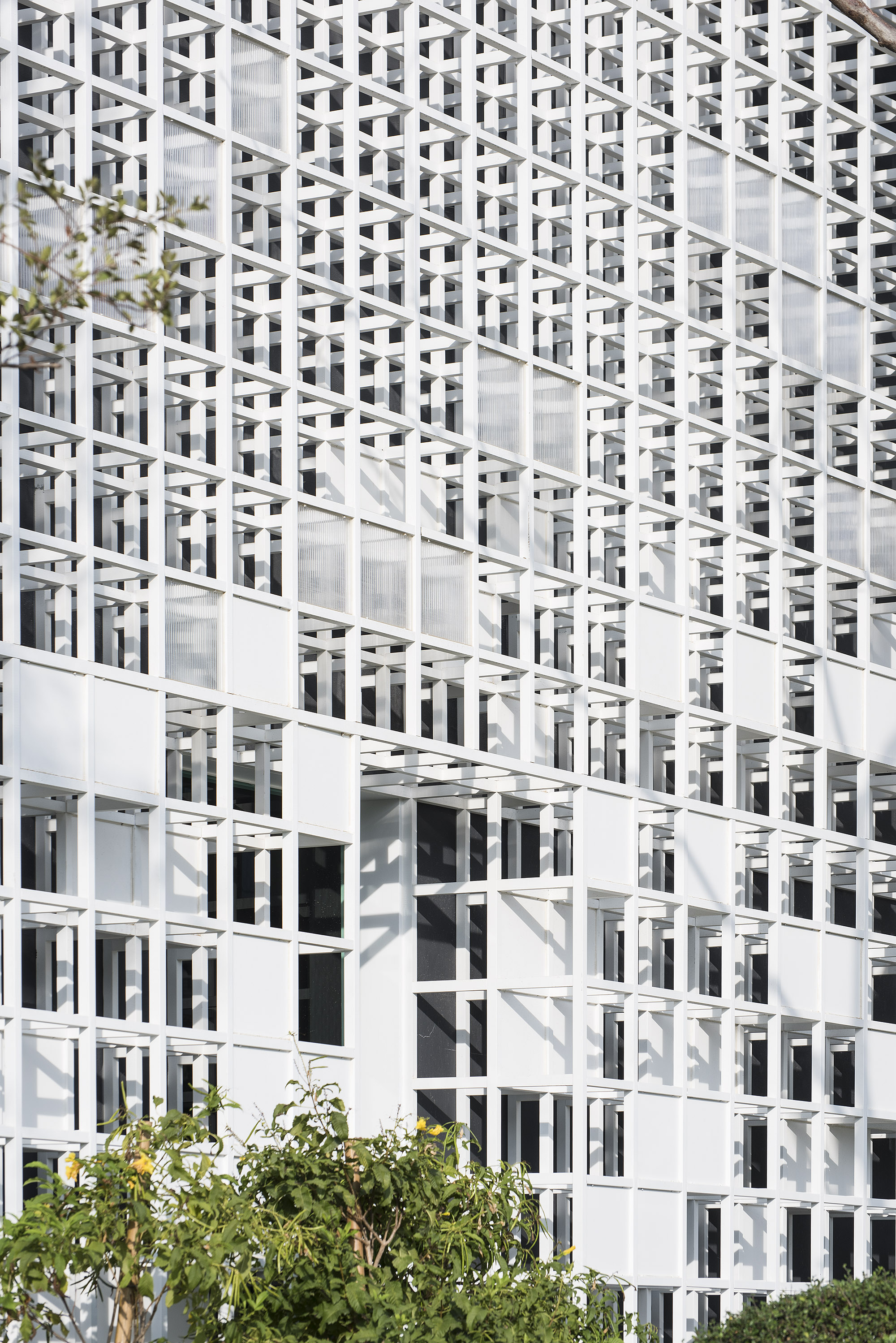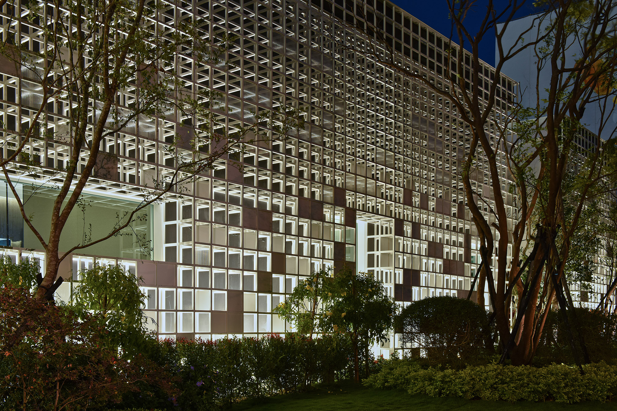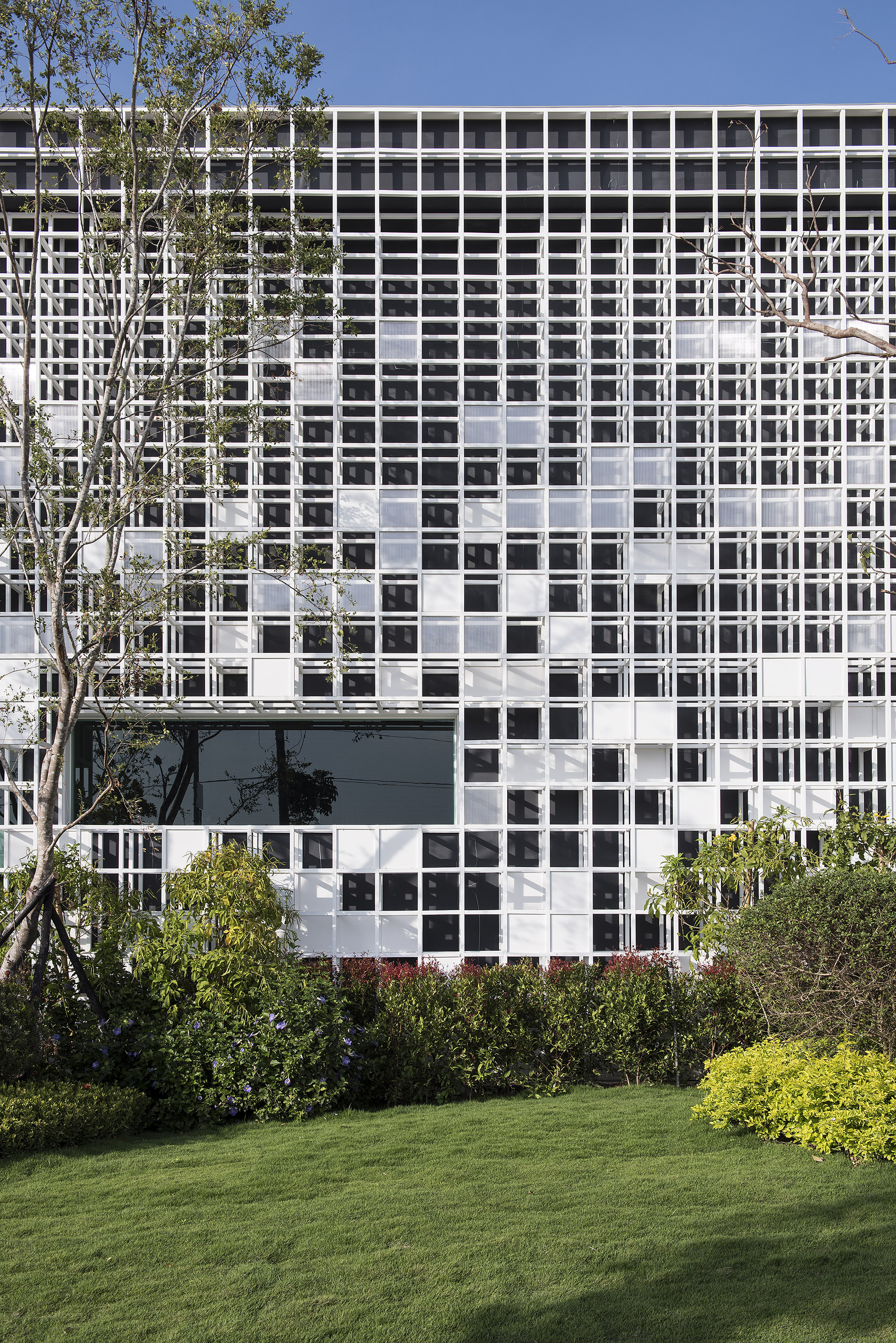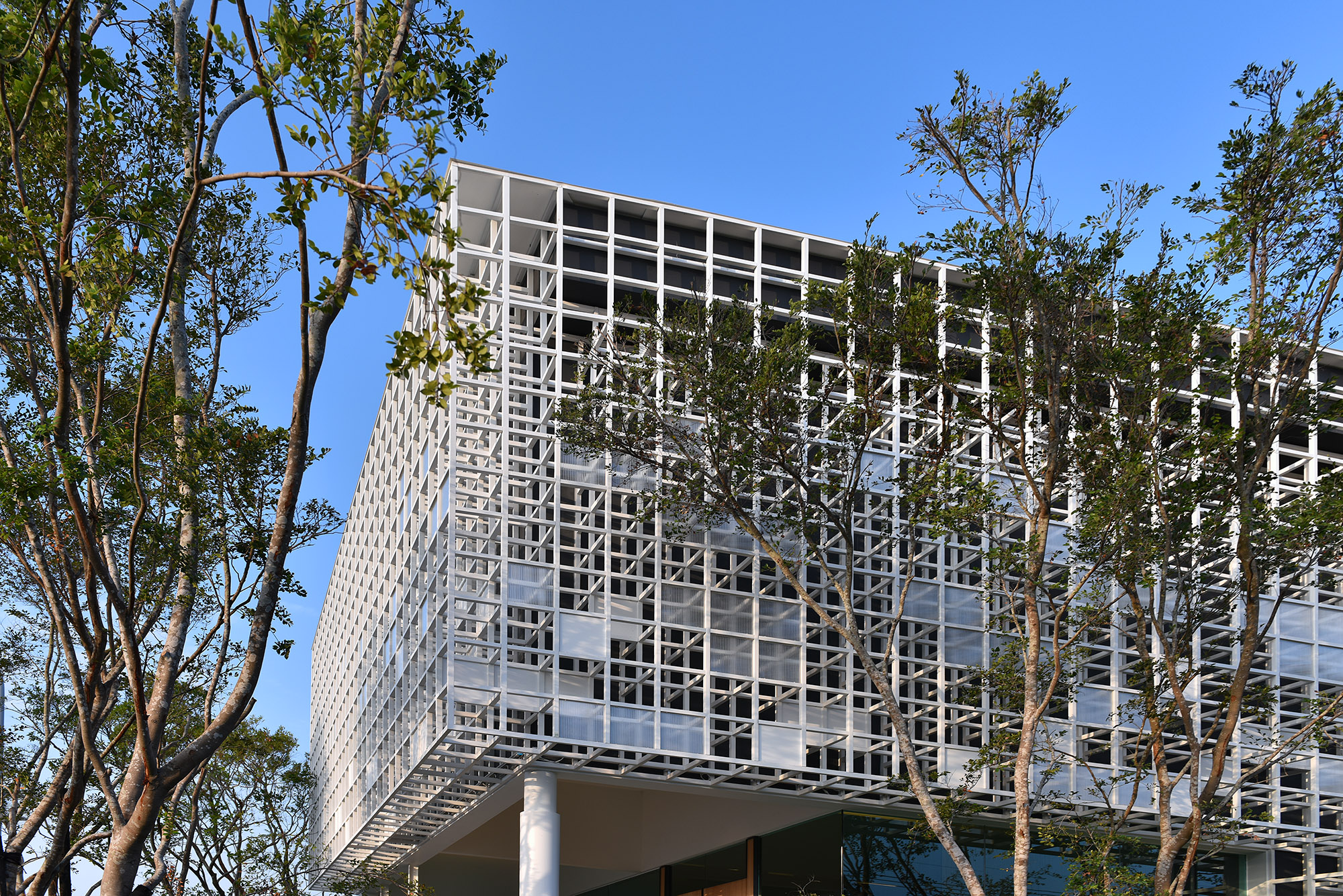 此次設計案作為接待中心,外觀以不規則矩陣的白色格狀構築而成,參差的立面設計,撇除獨特外觀,其建築體外部以不易吸收熱能的節能材質保留空氣層。庭園草木蒼翠的綠景,摘取自然的蹤跡,以其線條與律動,將建築外觀輕柔化,空間融於藍天與綠地之間,盡情體悟天地共生的感動。