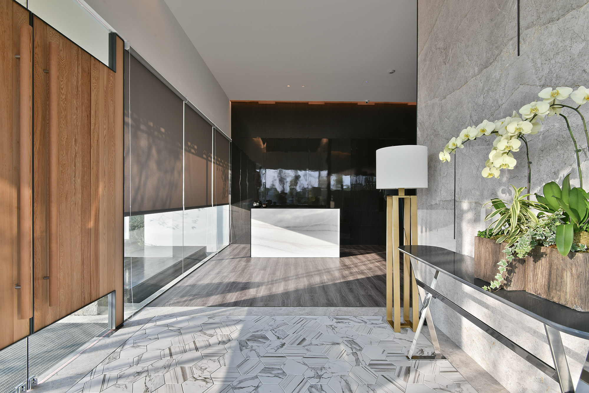 挑高列柱的入口,一旁綠景有如岳陽樓記文字中描述:「至若春和景明,波瀾不驚,上下天光,一碧萬頃」,美景浮現眼前,讓浮躁的心境得以沈澱。推開大門,素雅灰白的石材面與地面六角磚的拼接,加上落地玻璃映射的綠景,呈現出典雅大器的空間氛圍,室內中軸佈局為長型空間配置多處半獨立式洽談區,後側以樣品屋作為展示,使空間層次感更為提升,置身其中得以享有遠離塵囂的心靈體驗。