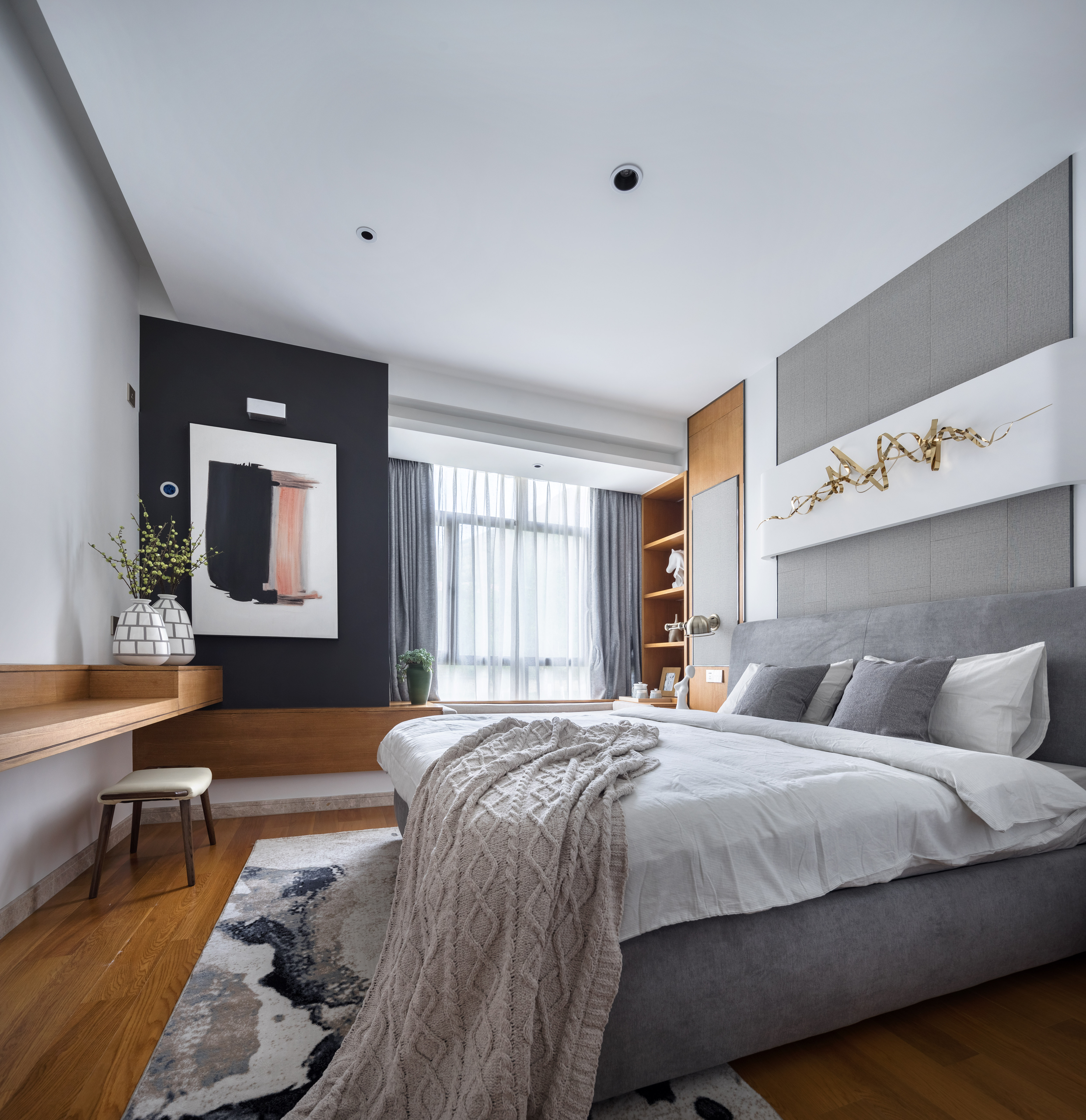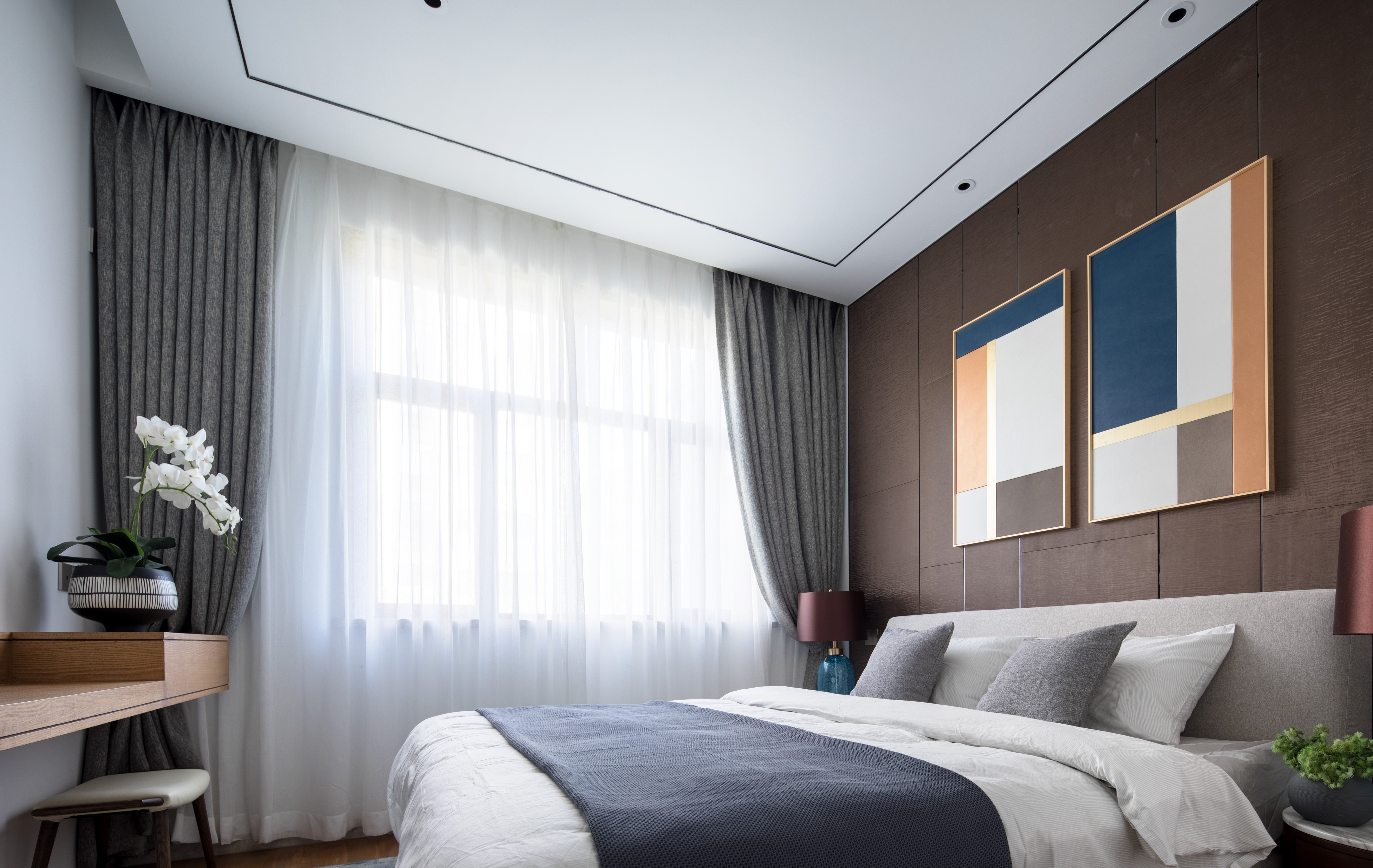设计选材:深色墙面的铺陈,原木的洗练,架构出主卧空间,金色几何线条的壁挂,抽象的艺术画,麻质的窗帘床品,精致的绿色花艺点缀无一不透露出业主的品味与对生活的的热爱。加上软装点缀的橙色与蓝色使整个空间沉稳中带有一丝年轻的气息。纯亚麻的床上用品空间增添一丝静谧的宁静感,能够为居住者带来良好的睡眠环境。