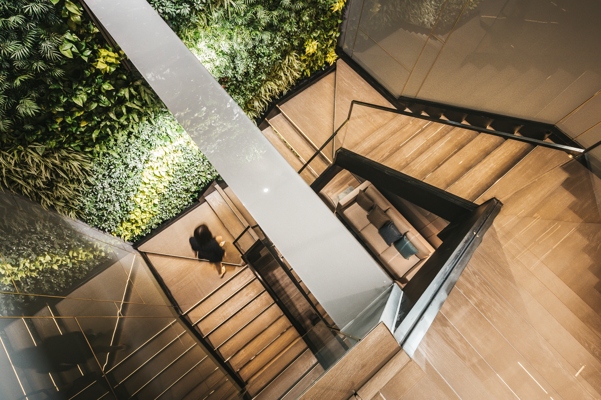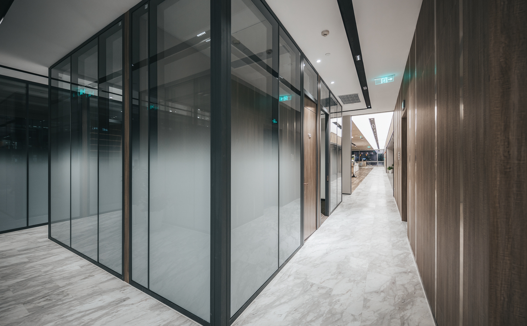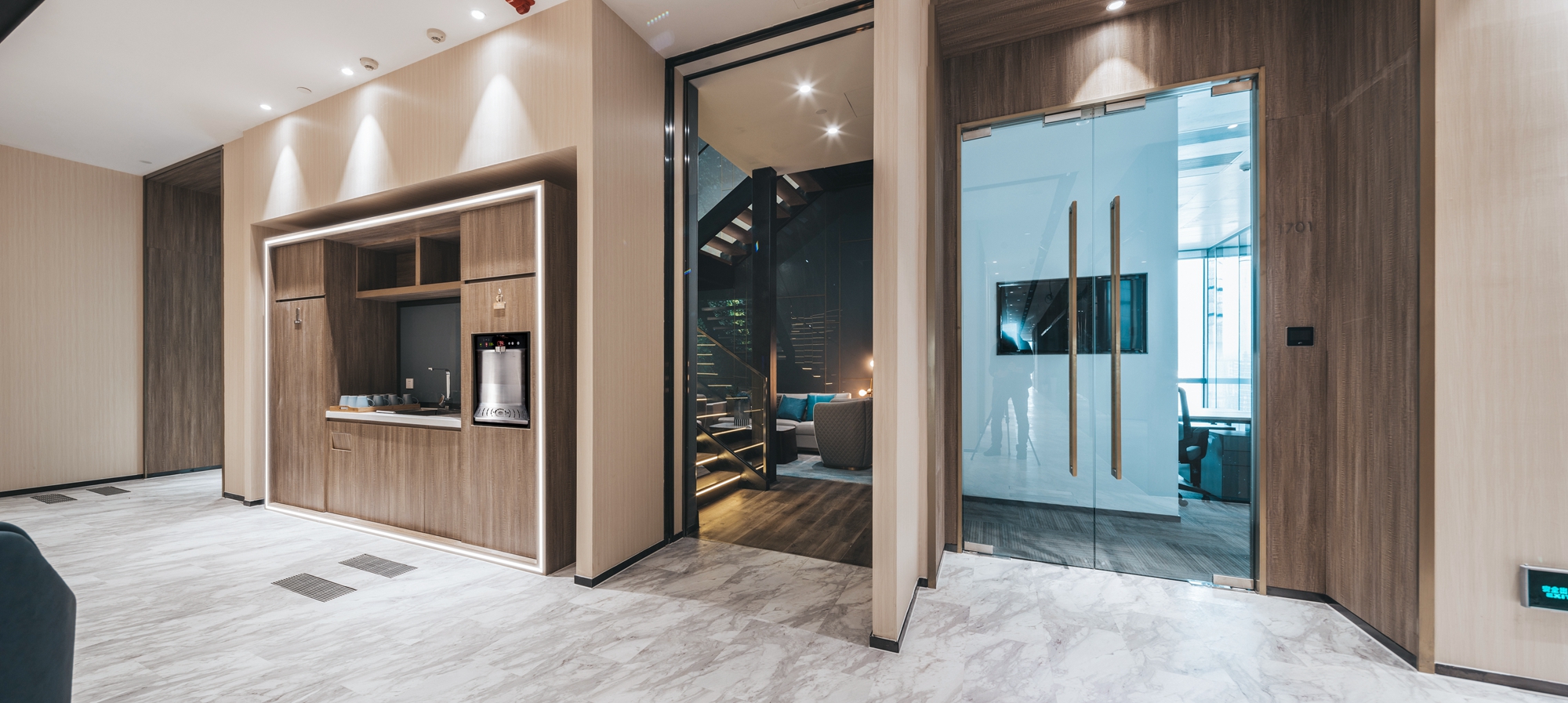 空间布局:空间设计布局上,Distrii办伴将17-18层打通,用楼梯联结上下,既扩大了空间视野,也加强了社交属性,促进空间内人员交流。考虑到金砖大厦办公空间金融企业居多,对灵活办公的需求更为强烈,因此在空间功能规划上,Distrii办伴以面向中大型企业,具有独立私密空间、独立走廊设计特性的超能办公室为主,配以少量小型具有格调独立办公室,进行多功能空间匹配,既保证空间的灵活性,又不失私密性。此外,金砖大厦空间还具有一个独特亮点——新型的地送风系统,这种新风净化系统,有助于加速办公空间中的空气流通、净化速度,并且还能
