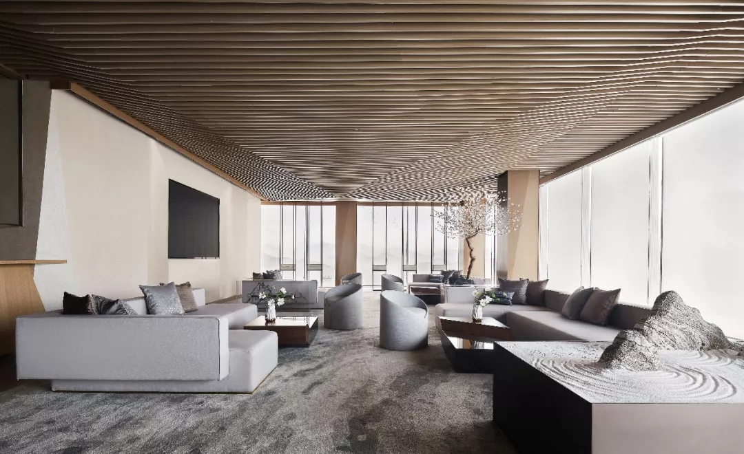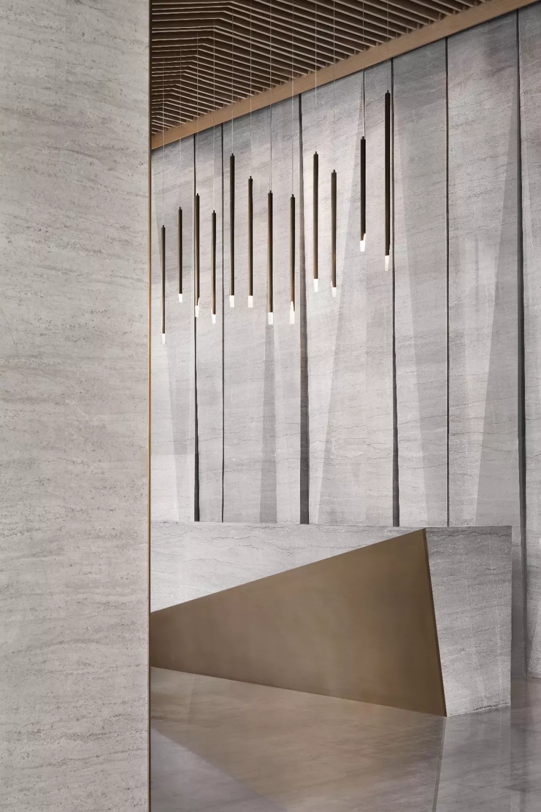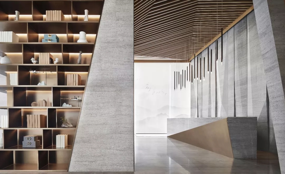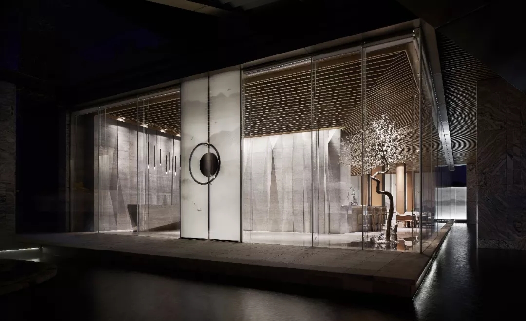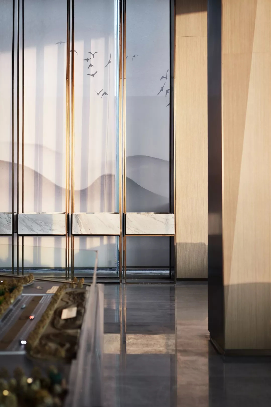 空间意境:步入空间,平沙落雁之景描于水墨画卷上,三五成群的大雁,空际盘旋,倏隐倏显,定格其间雅致素净的玄灰主调,近相呼应室外山水景观意境。设计师从棱角分明的雾凇切割面获取灵感,以几何立面体块的形式重构了空间造型,融注进当代艺术的气息,在视觉变幻中,展呈美学万象的不同截面。