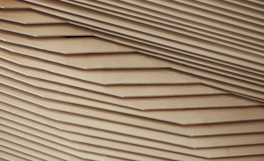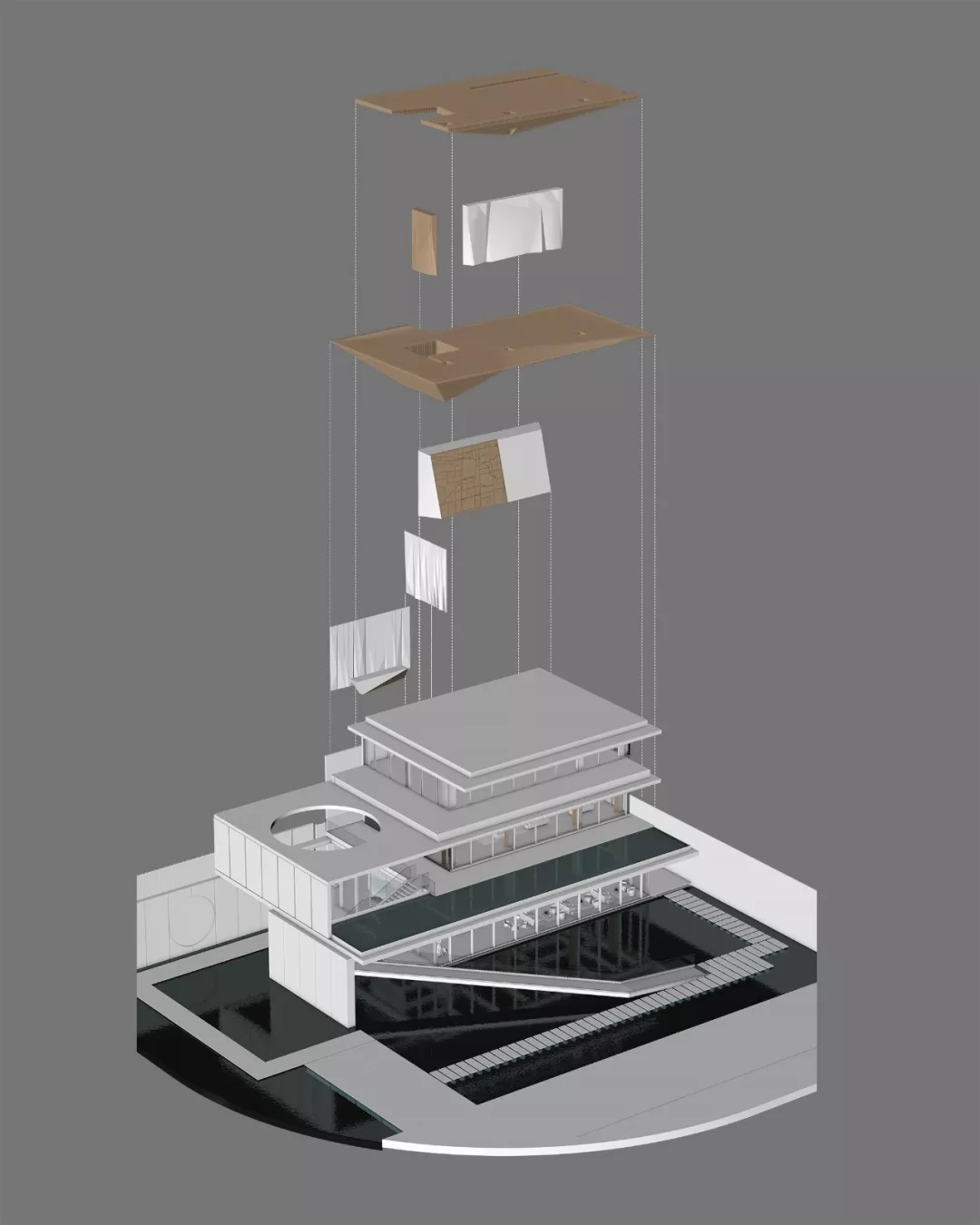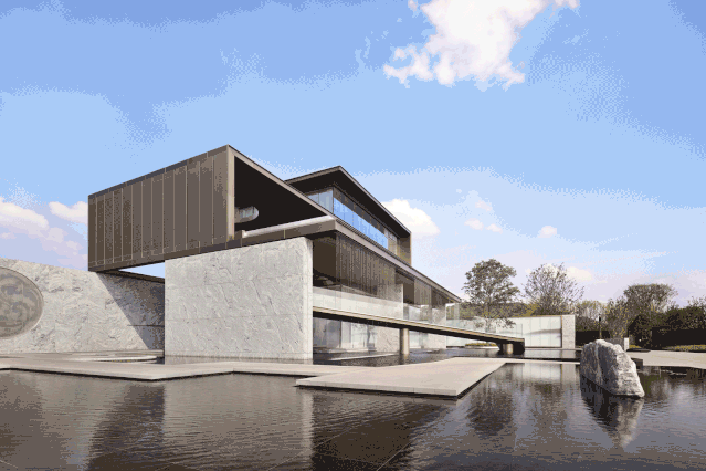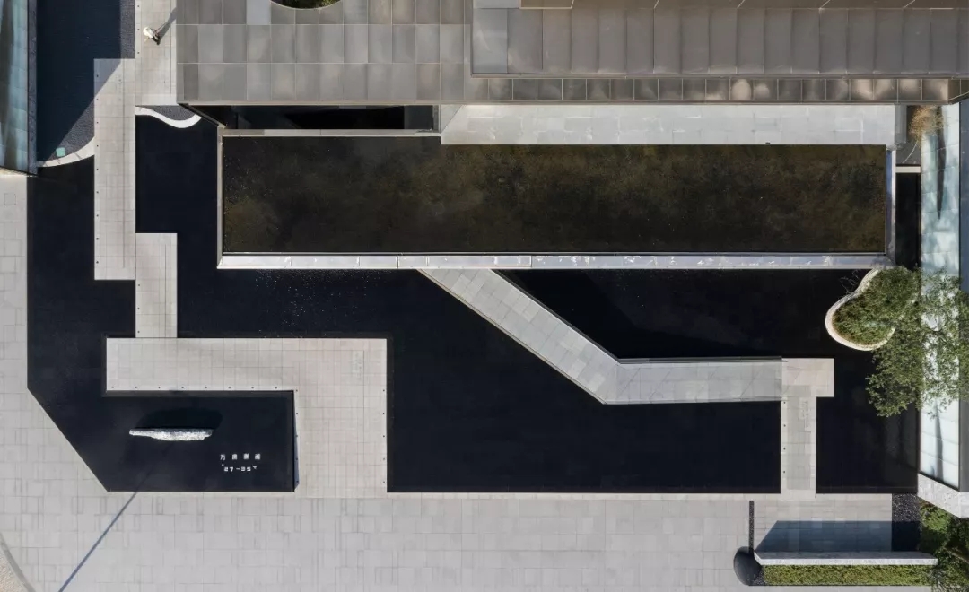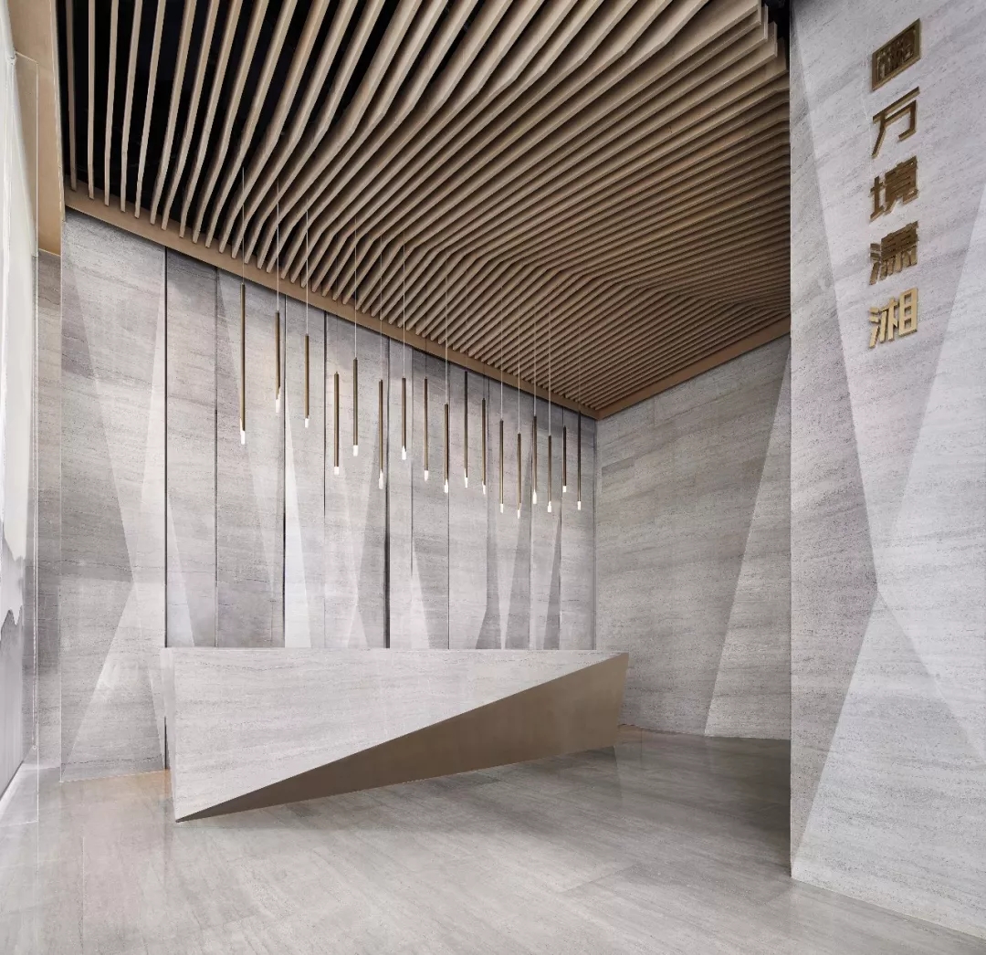 空间意境:步入空间,平沙落雁之景描于水墨画卷上,三五成群的大雁,空际盘旋,倏隐倏显,定格其间雅致素净的玄灰主调,近相呼应室外山水景观意境。设计师从棱角分明的雾凇切割面获取灵感,以几何立面体块的形式重构了空间造型,融注进当代艺术的气息,在视觉变幻中,展呈美学万象的不同截面。