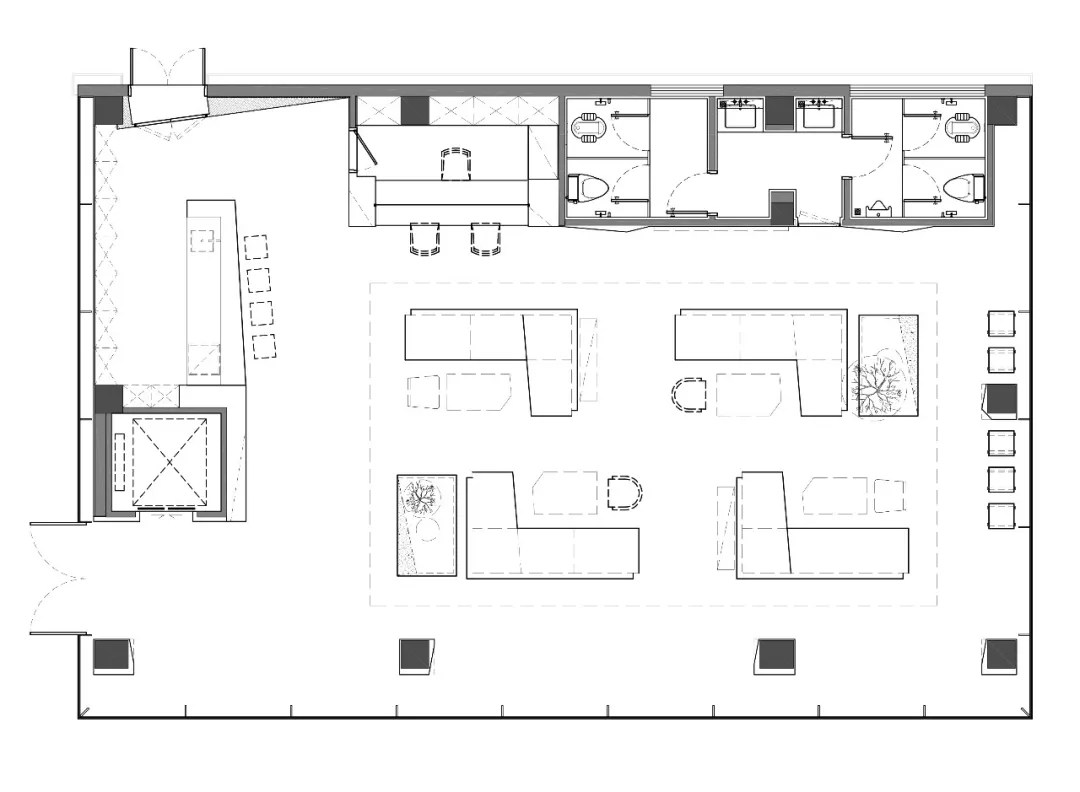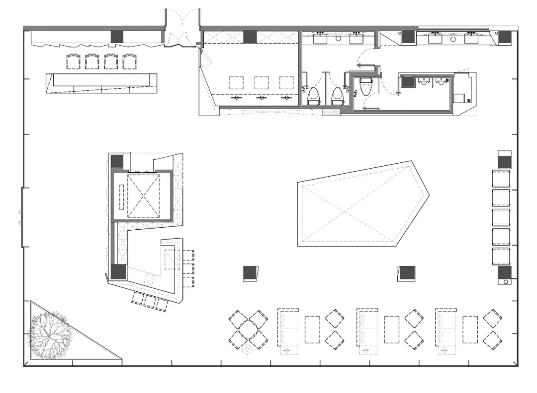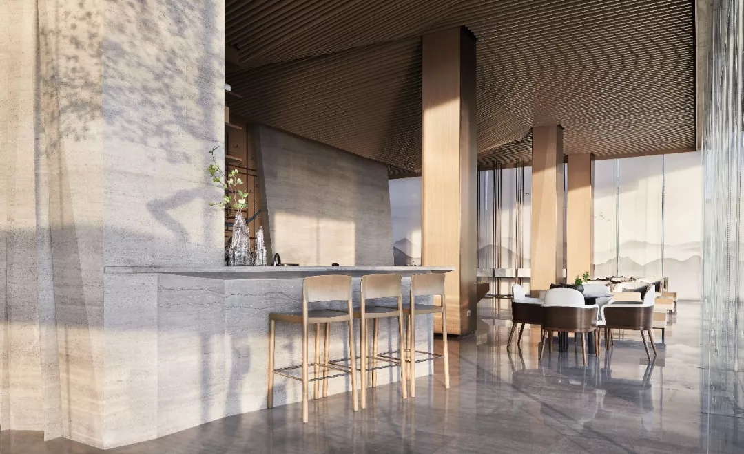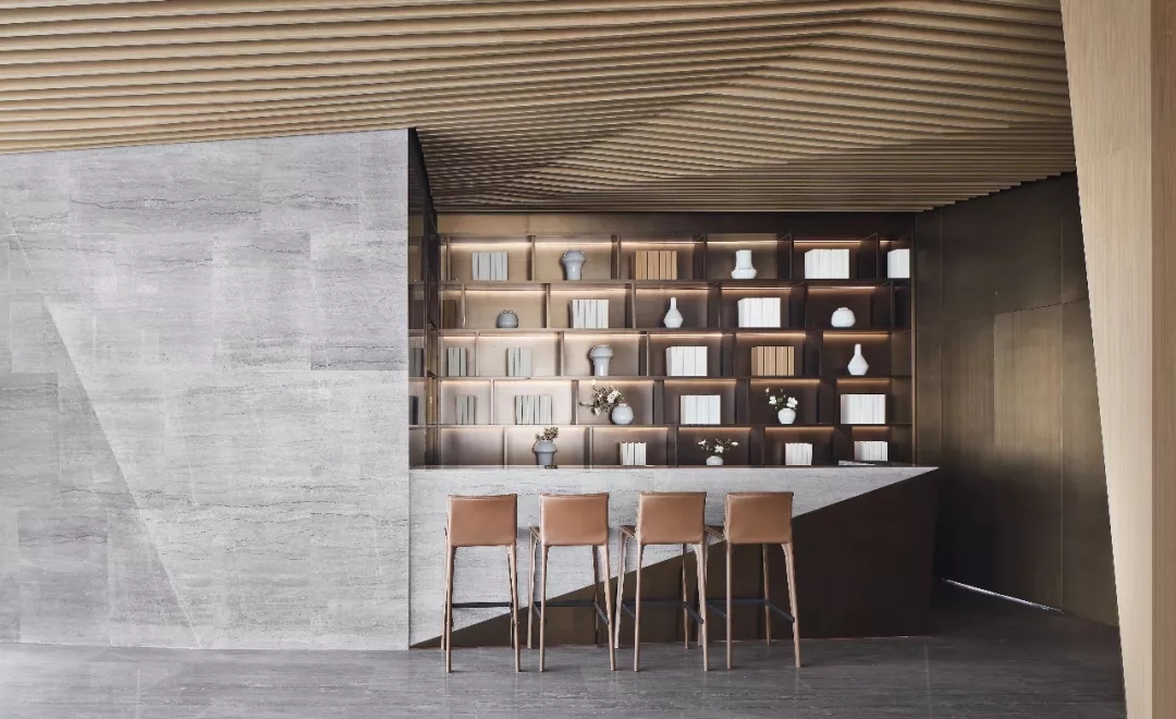 空间布局:空间布局上先藏后露,随之徐徐行进,感受几何块面带来的闭合与通透等变化,以及视野延伸下的物我状态。行至转角处,借助墙体前后块面的错落,大理石与木艺拼接出一个清静端雅的水吧空间,起承转合的雅棕与玄灰主调。