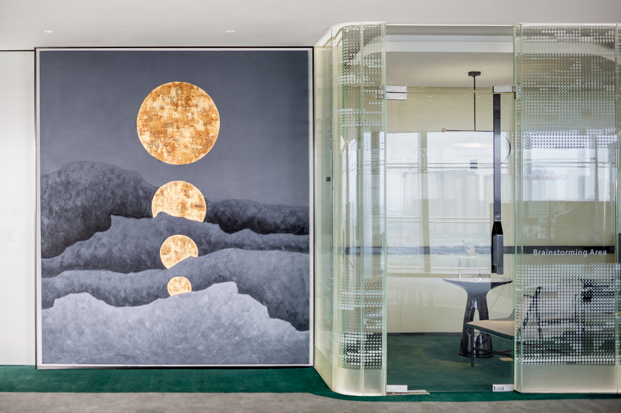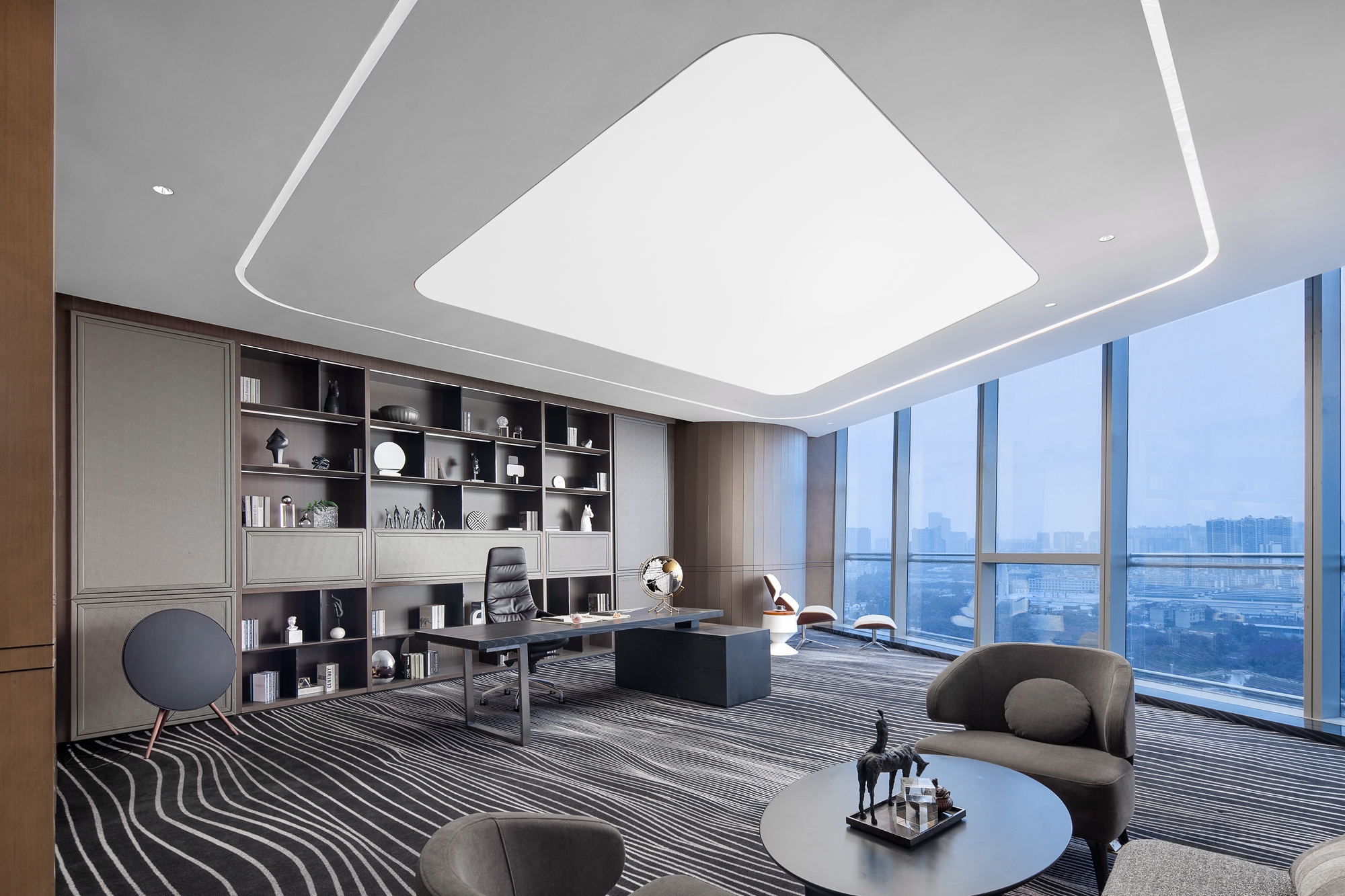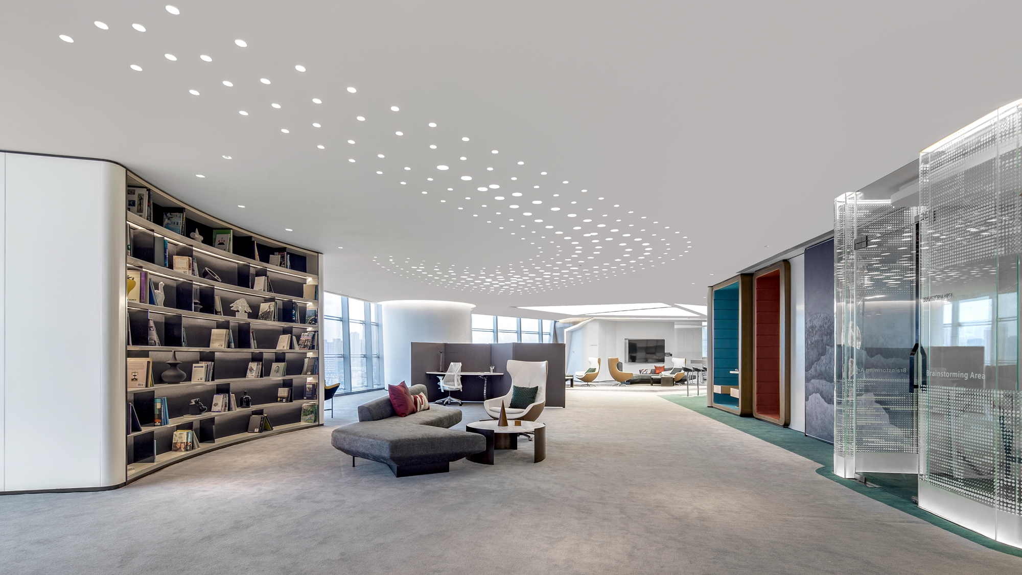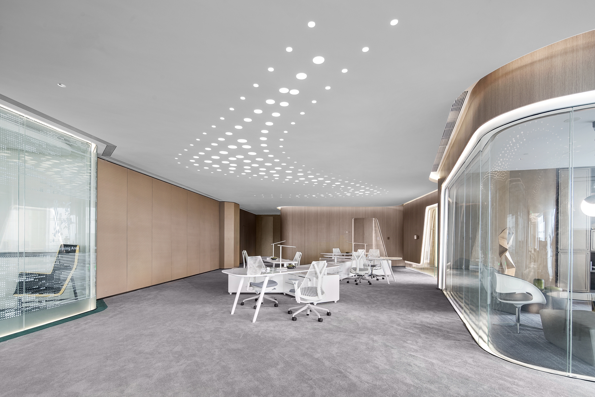 用户体验:共享、艺术、以及舒适的环境让办公可以更高效。结合功能和形体,打造出错落有致的光影空间。自由组合的办公形式随机散落在空间之中,并结合顶面分子流式造型灯把整个空间贯穿起来。独立功能区域我们以“盒体”的处理手法,错落布置在整个空间之中,形成了富有未来感和科技感的空间。