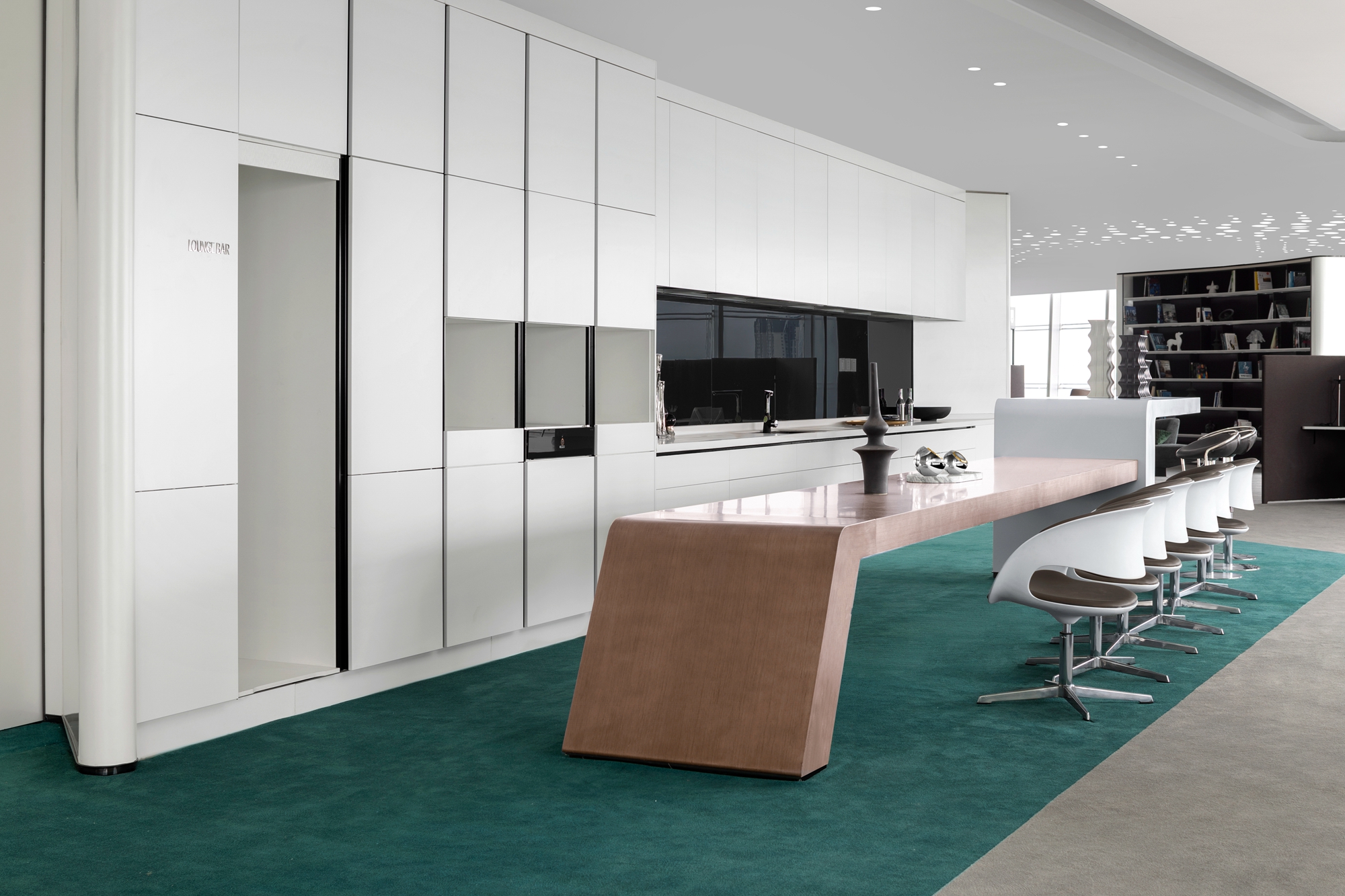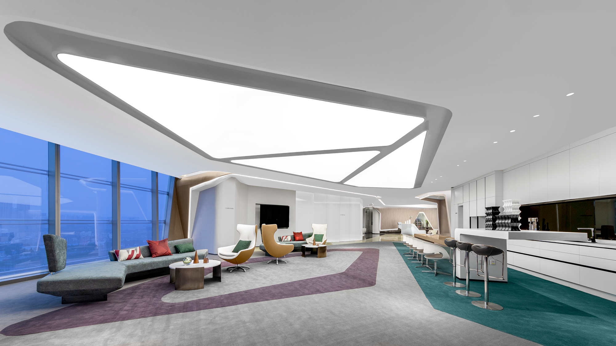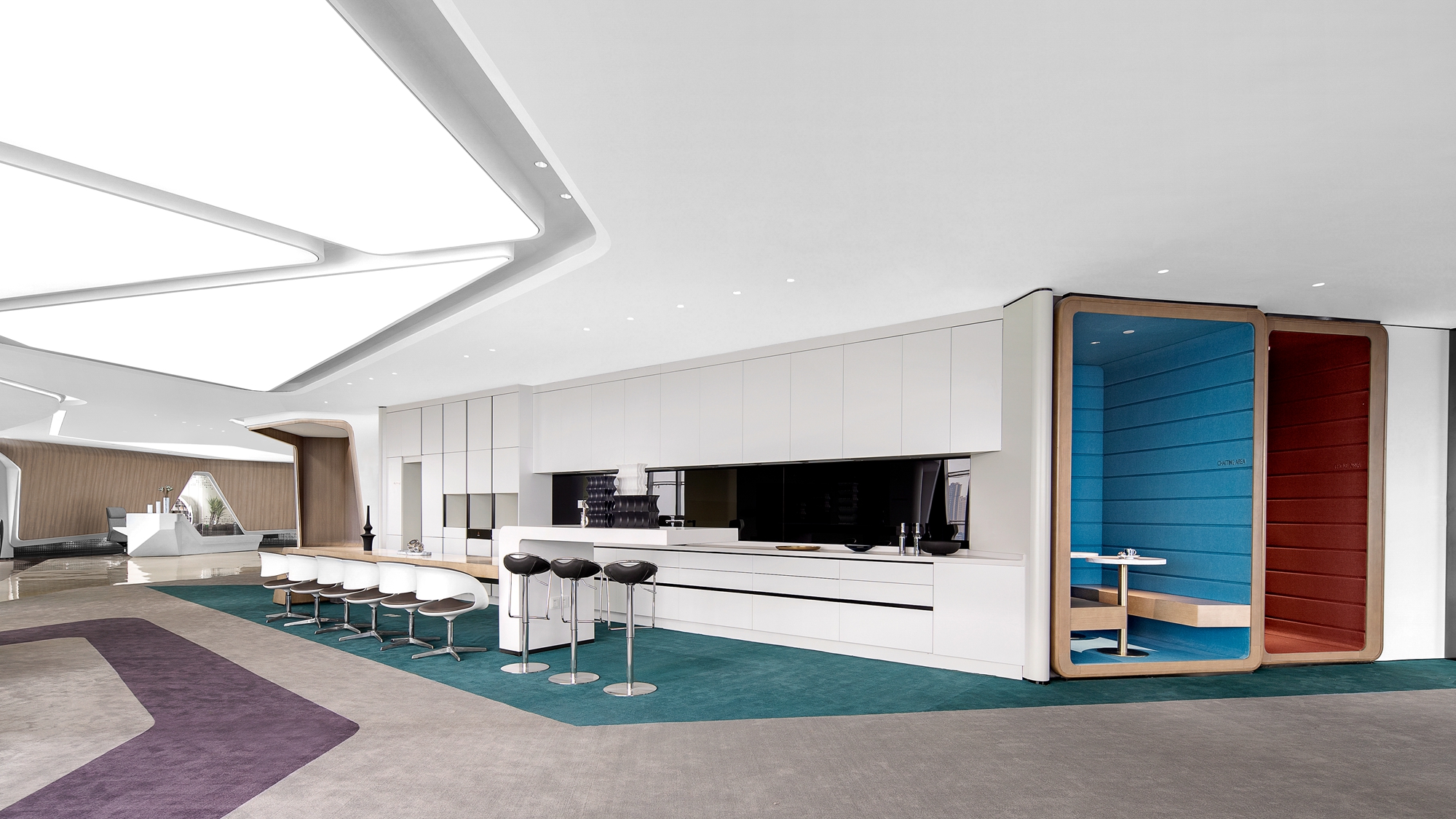 前厅接待空间,作为企业形象的窗口,超级前台的植入,其双层表皮的概念来自于生态元素演化,营造视觉上的悬浮状态,形成富有未来感和商务范的过渡空间。办公空间配置有兼具颜值与内涵的超级前台,包含访客登记、自助取卡、预约取卡、可视对讲、欢迎导览、信息发布等六大功能,能够毫无悬念地取代写字楼中功能单一、效率低下的传统 -