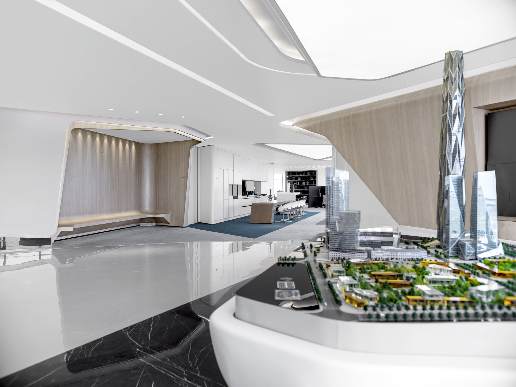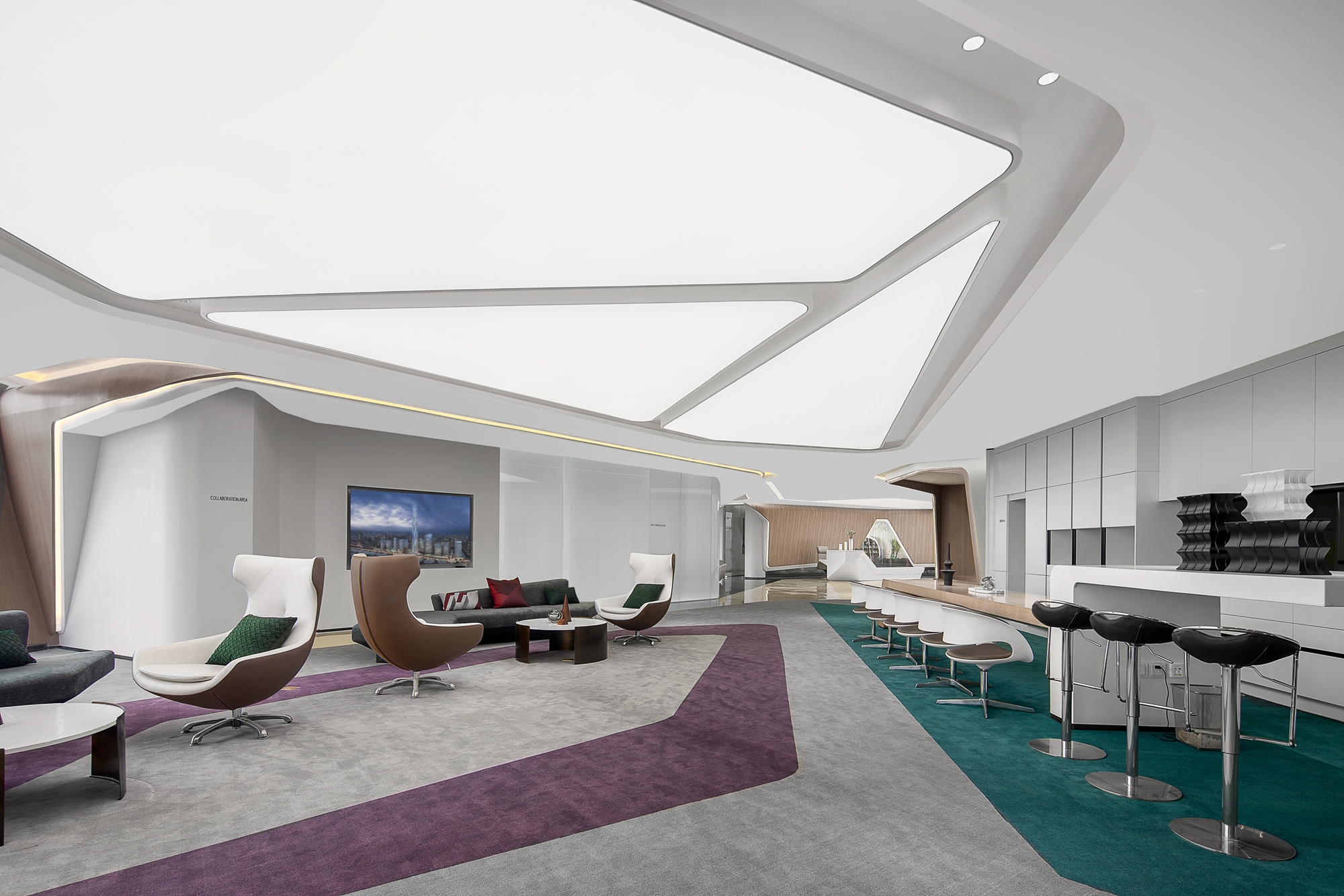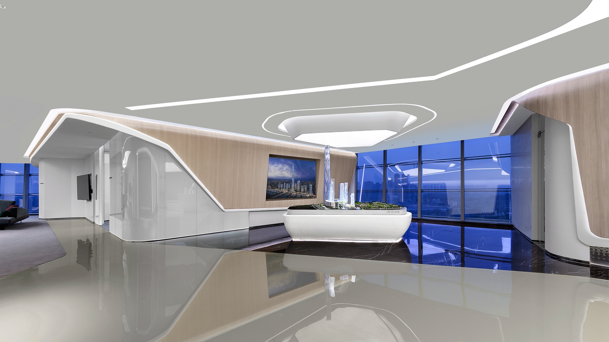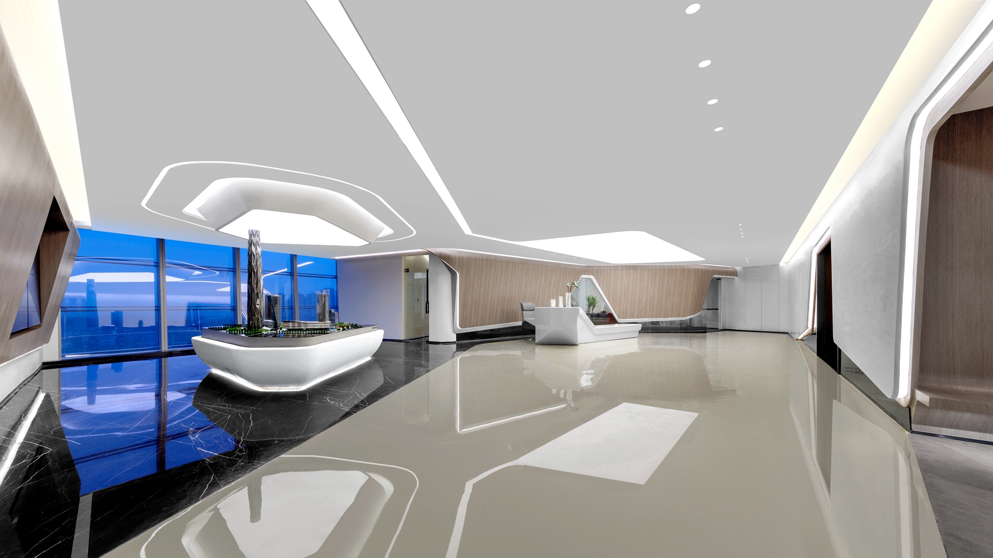 设计选材:我们运用一个弧形穿插的设计手法把接待区,等候区以及企业展示区等功能空间连接在一起,并结合线性灯光,形成统一的立面体系。空间的互通和穿插让整个空间更加灵动,曲面造型勾勒出不同区域造型线条,点与线,线与面相互交汇,重叠,形成不同功能空间之间的艺术对话。