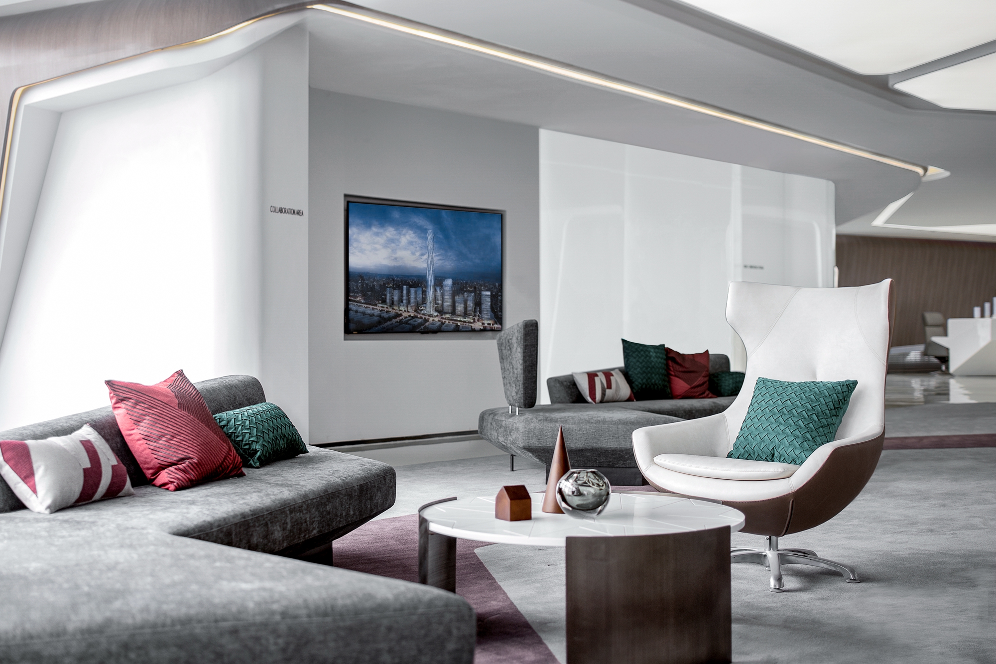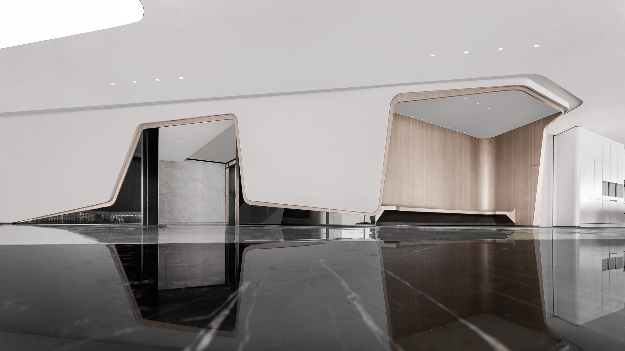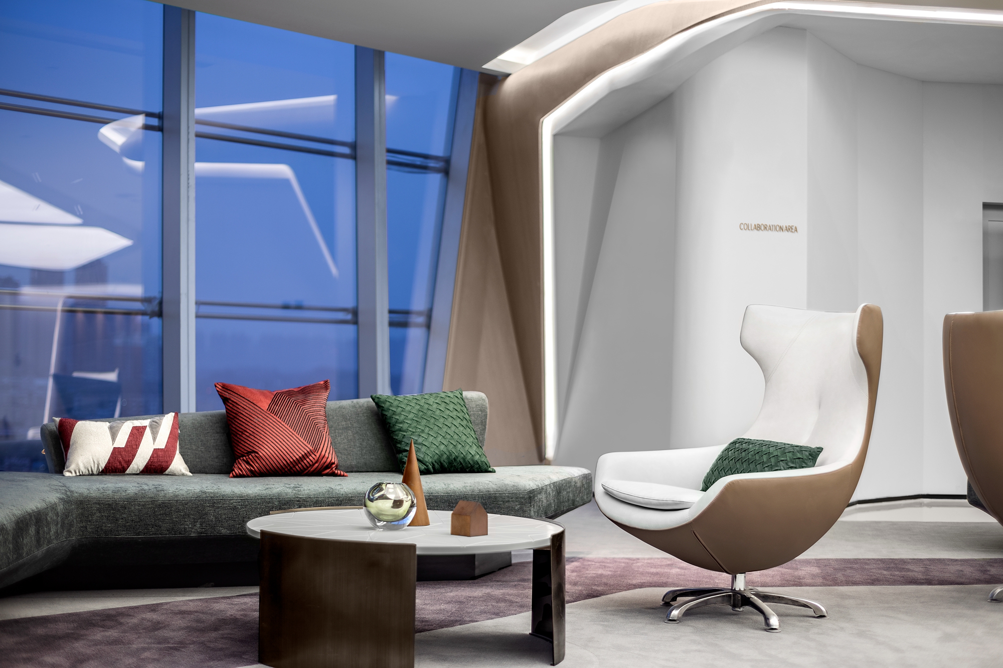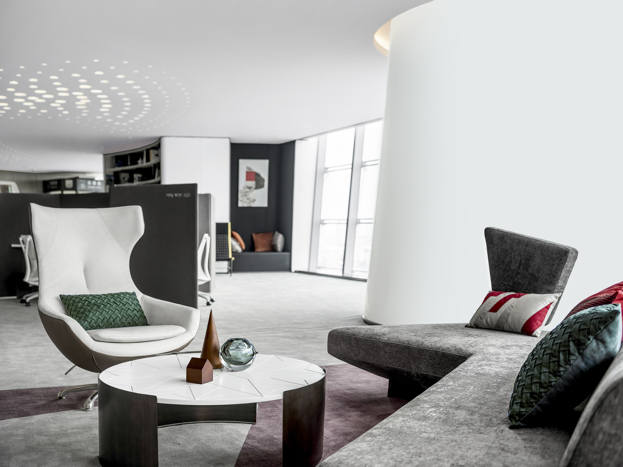 设计选材:我们运用一个弧形穿插的设计手法把接待区,等候区以及企业展示区等功能空间连接在一起,并结合线性灯光,形成统一的立面体系。空间的互通和穿插让整个空间更加灵动,曲面造型勾勒出不同区域造型线条,点与线,线与面相互交汇,重叠,形成不同功能空间之间的艺术对话。