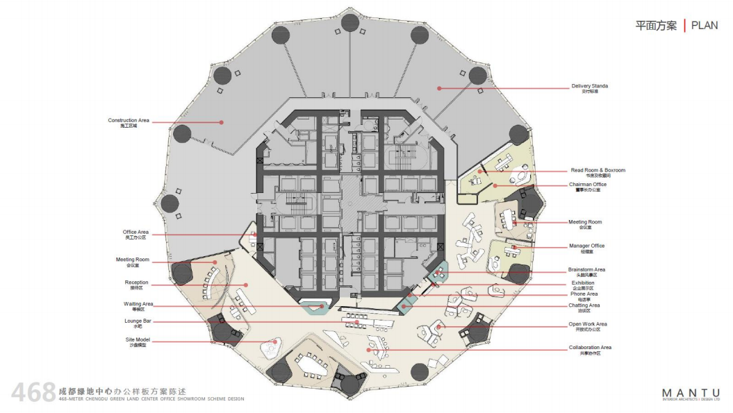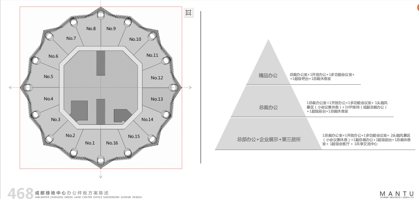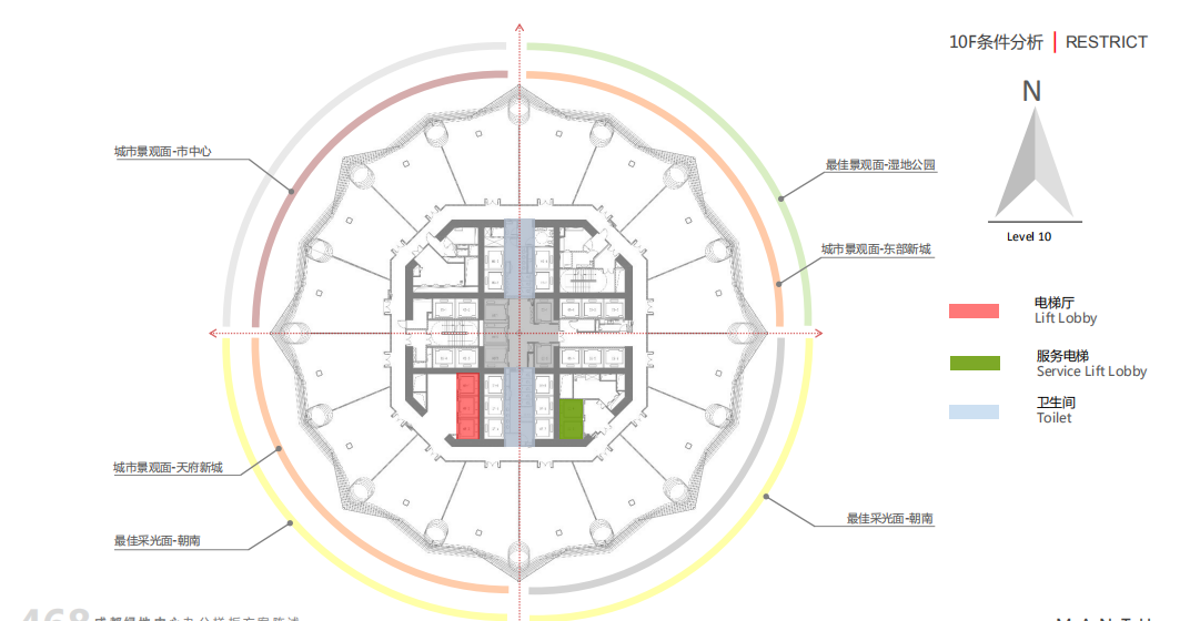 空间意境:468项目建筑设计取意于成都周边独特的雪山地貌,象征着城市蓬勃发展充满希望的未来。标志性塔楼如山峰映照天空,山谷反射大地,似一座360度映射的光雕塑屹立,融天地于一线之间。468米主塔楼按成都当地气候条件量身打造,为的是呈现出一座充满生机而又环保生态的城市标志。主塔楼将圆柱雕琢为收分棱状体形,在减少建筑表面积,均衡年日照热摄入量的同时,还优化室内环境,最大化获取自然光线。塔楼棱面阴阳交错,向着天空优雅的逐渐细化尺度。上倾面和下斜面在晴天强光时有效的分散阳光直射,在天色阴暗时更似钻石般漫反射周边环境光。随着