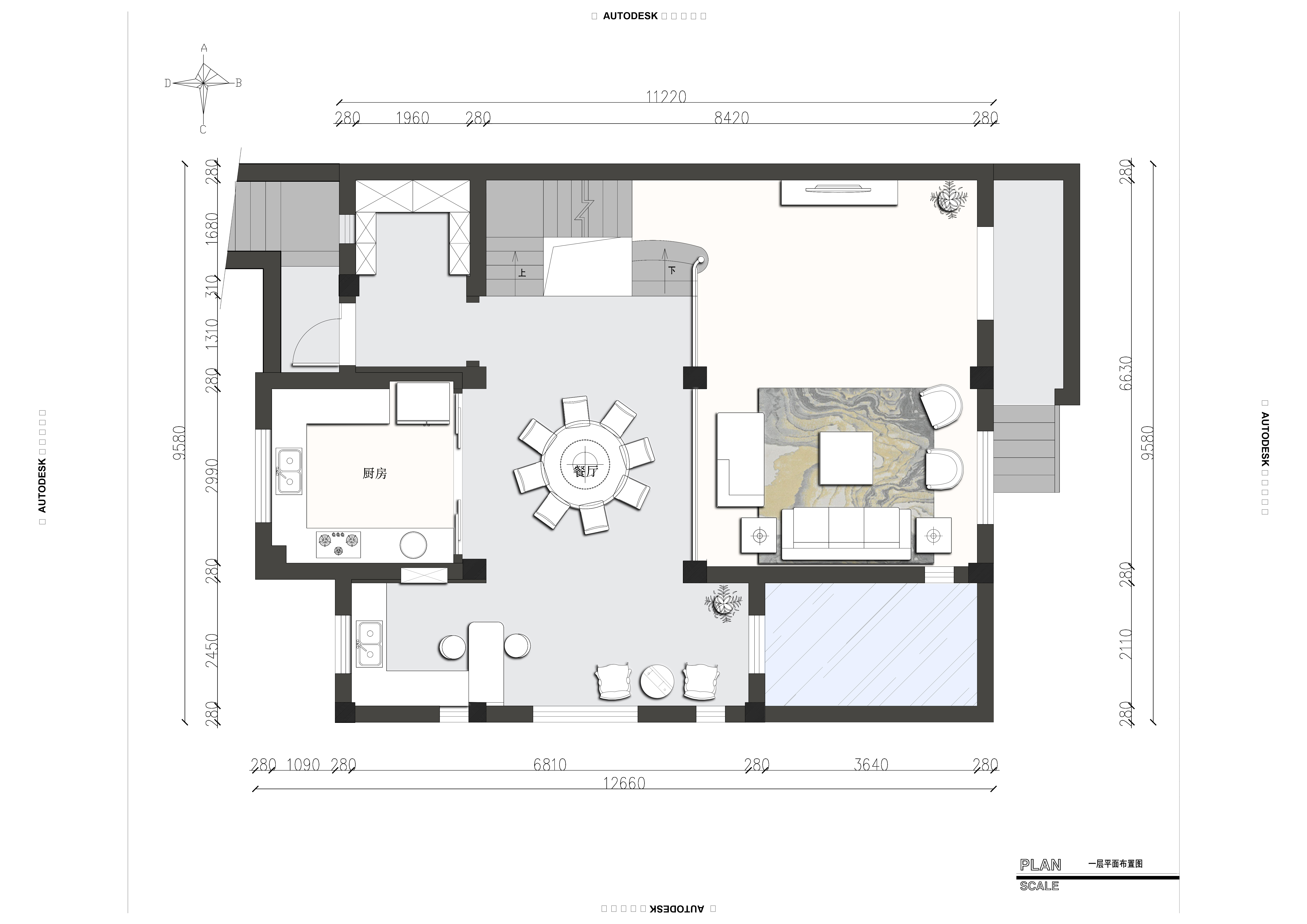 在整个空间布局上,客厅和餐厅的分区处理是设计师最为满意的布置。利用台阶的高度差自然的形成两个功能的分区,不仅将两个区域巧妙的分割开来,而且在视觉效果上产生不一样的错落感。将建筑与室内设计元素结合到恰到好处。