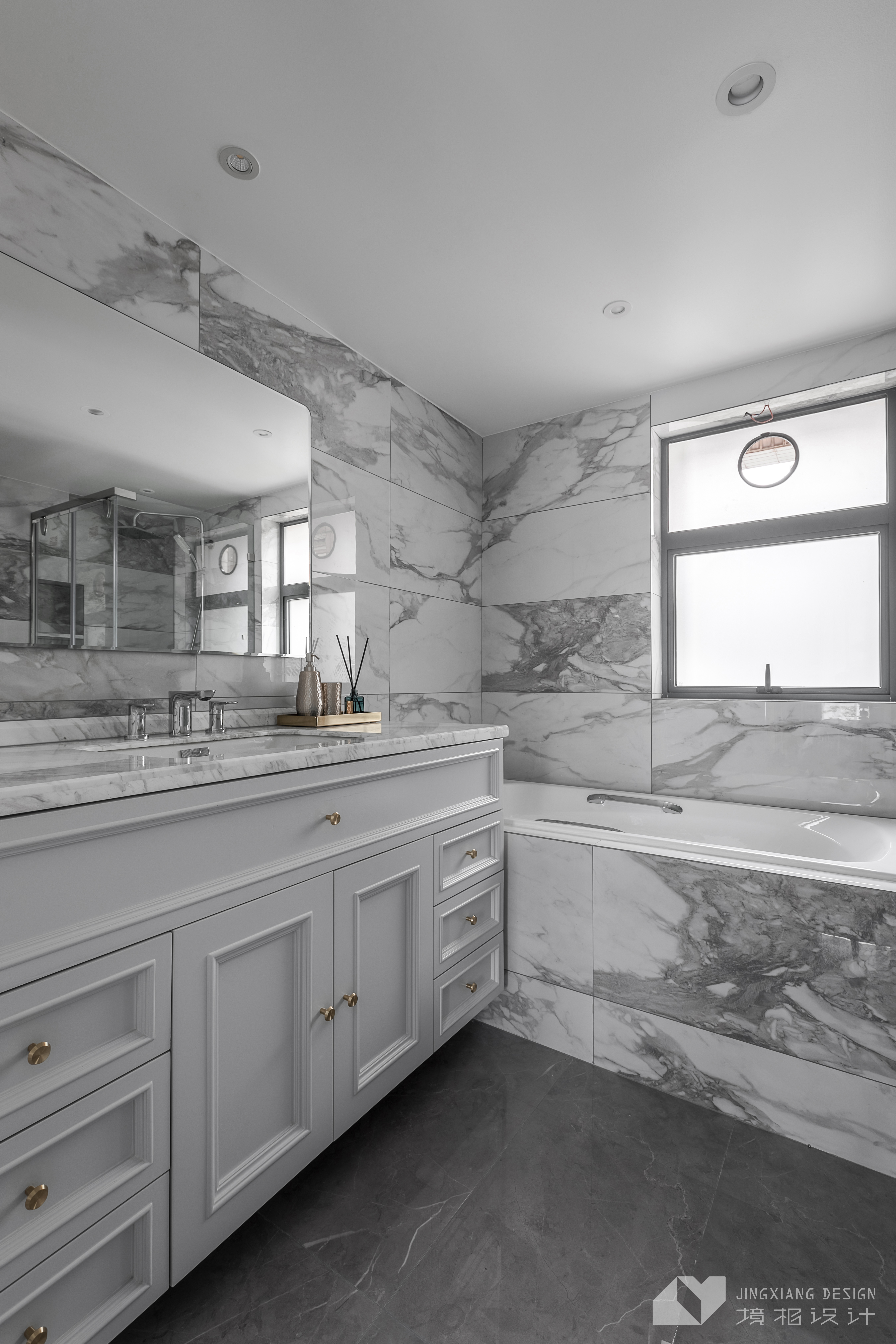 △给小朋友洗澡的话,浴缸是在合适不过了,于是便将卫生间设置成四分离式。干区的超长台面下面打造一排浴室柜用来放物品,旁边根据尺寸放置了合适的浴缸。墙上的大理石纹砖自然又干净,同时还方便打理。