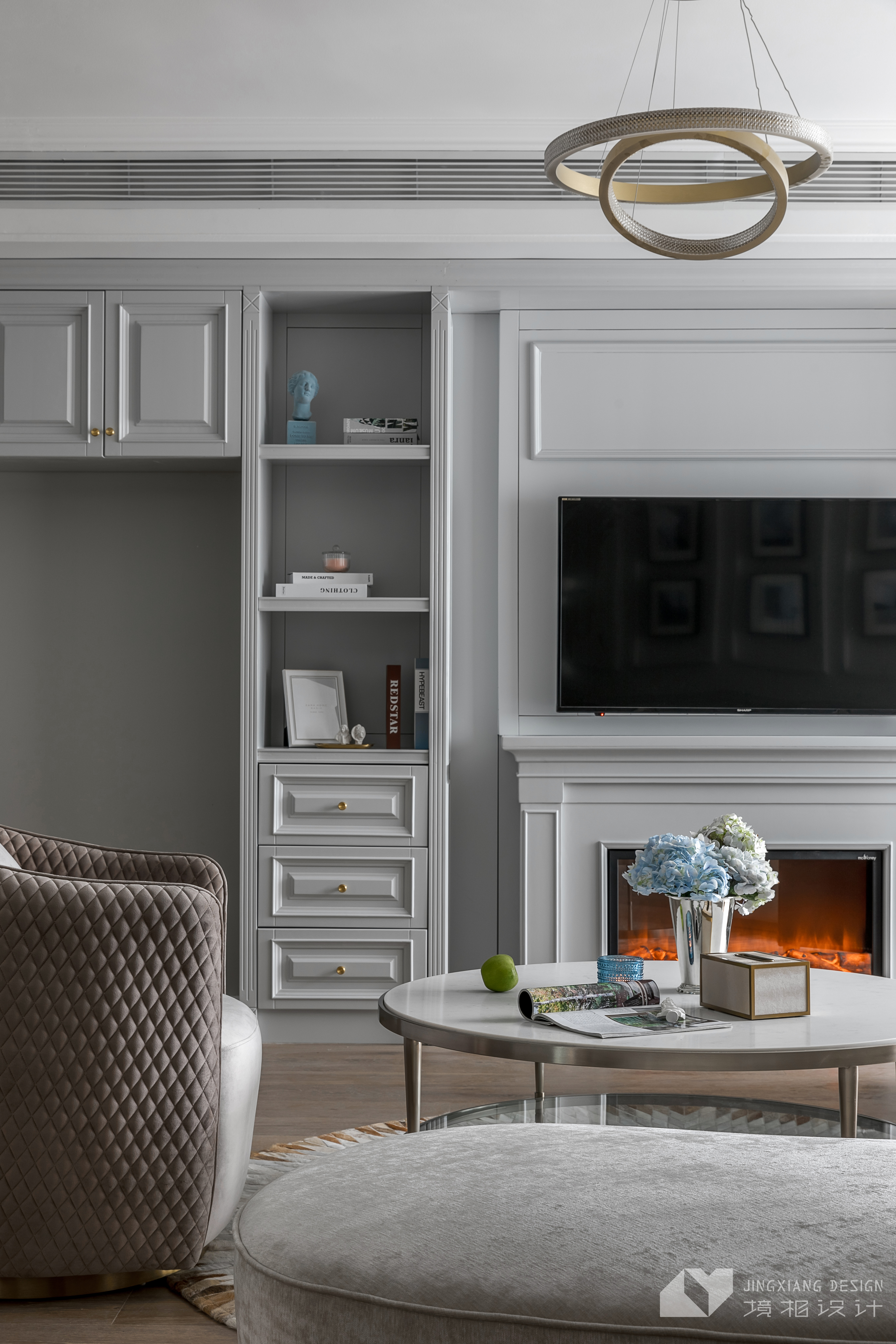 △电视背景墙则兼并了颜值与实用性,多种柜体组合满足屋主的书籍杂物存放。女屋主十分喜欢壁炉,所以在电视机下方设置了仿真壁炉。横平竖直的石膏线条十分流畅,透出些不凡的气质。