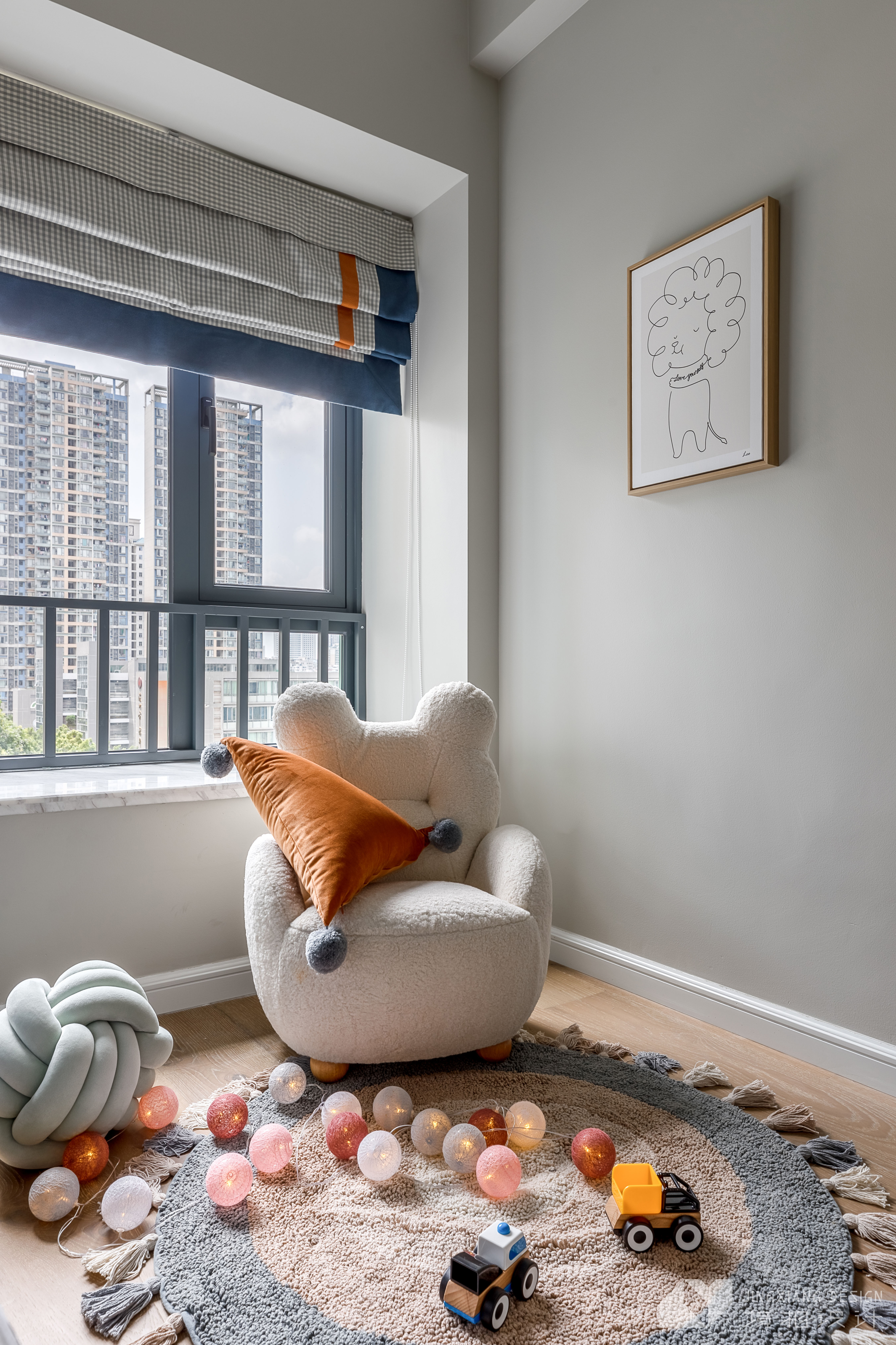 △为了让整体动线更加流畅,除了沙发选择弧形设计,还有各种茶几、地毯,包括椅子都存在一定的弧度,圆润的棱角也可以给宝宝的安全提供保障。