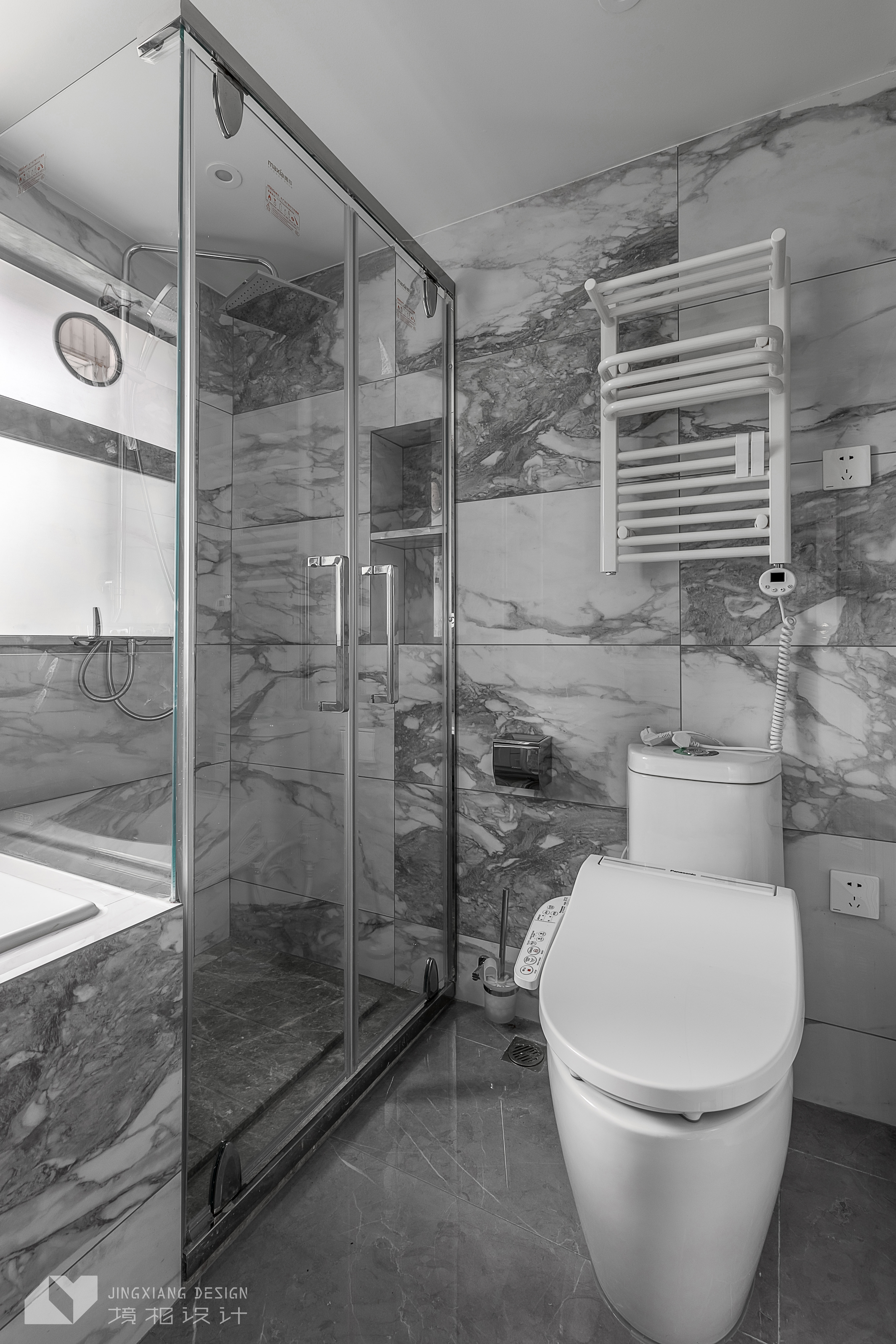 △用玻璃门隔断湿区,防止干区淋湿,还能提升整体的通透性。利用马桶上方安装了电毛巾架,让毛巾时刻保持干净清爽。