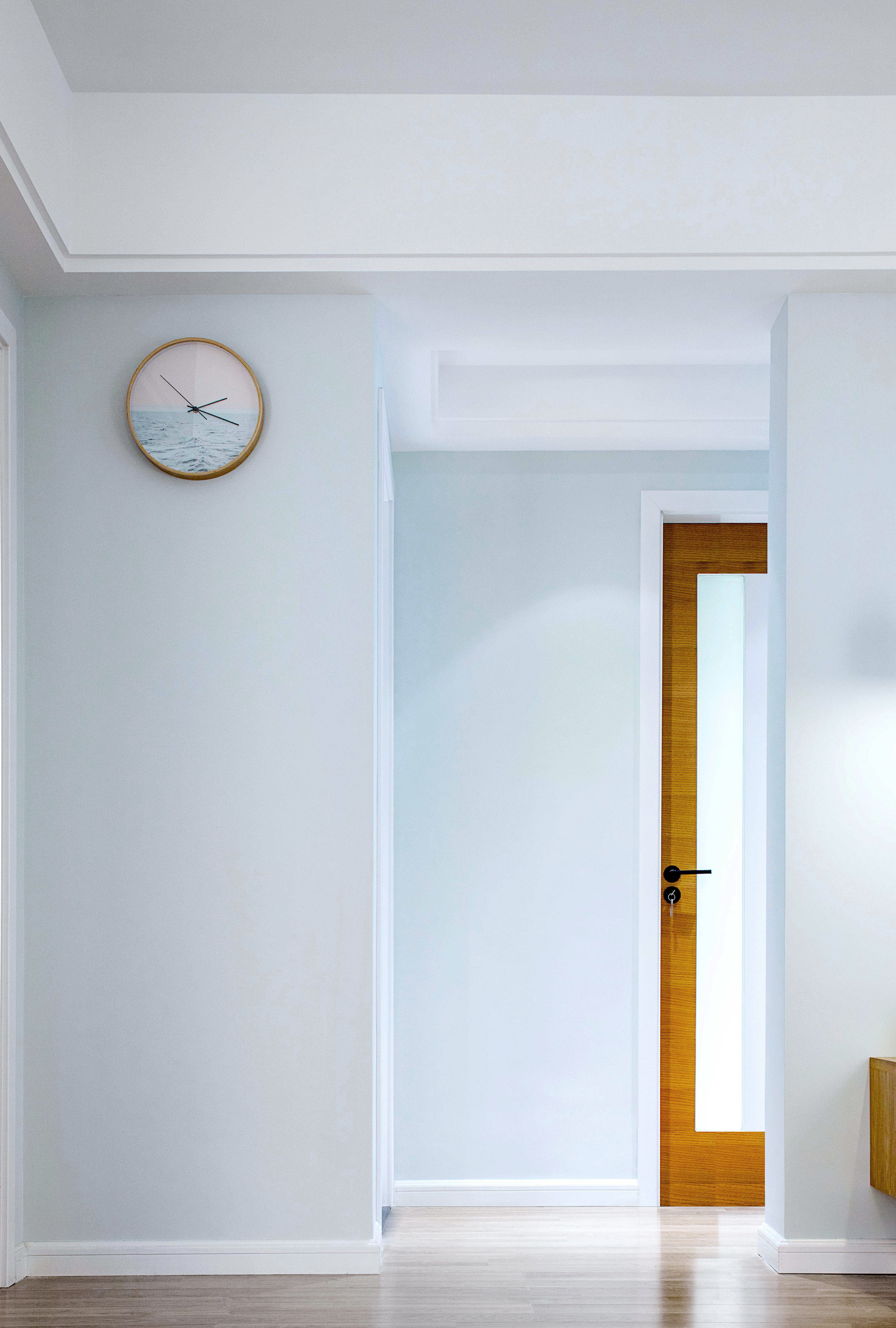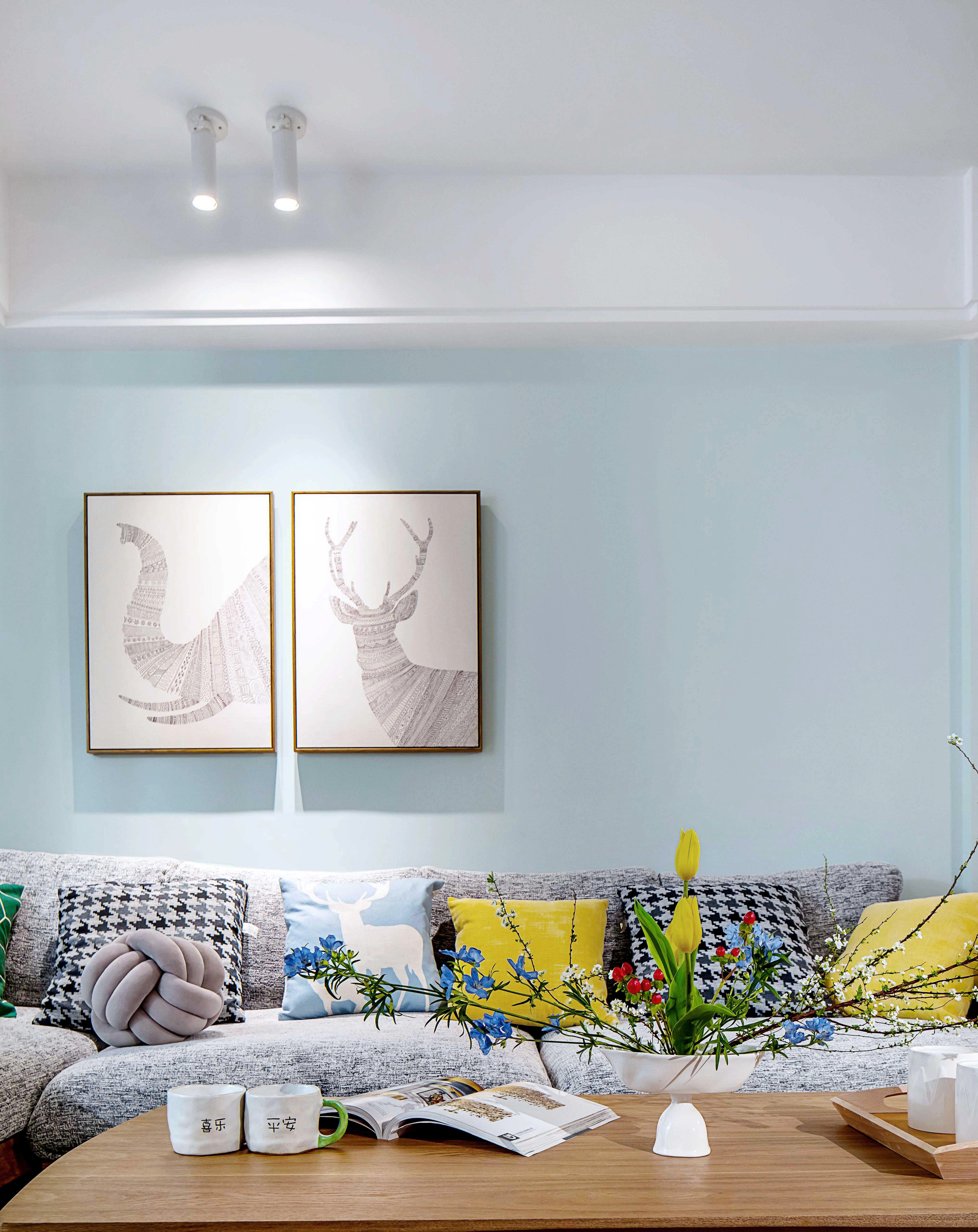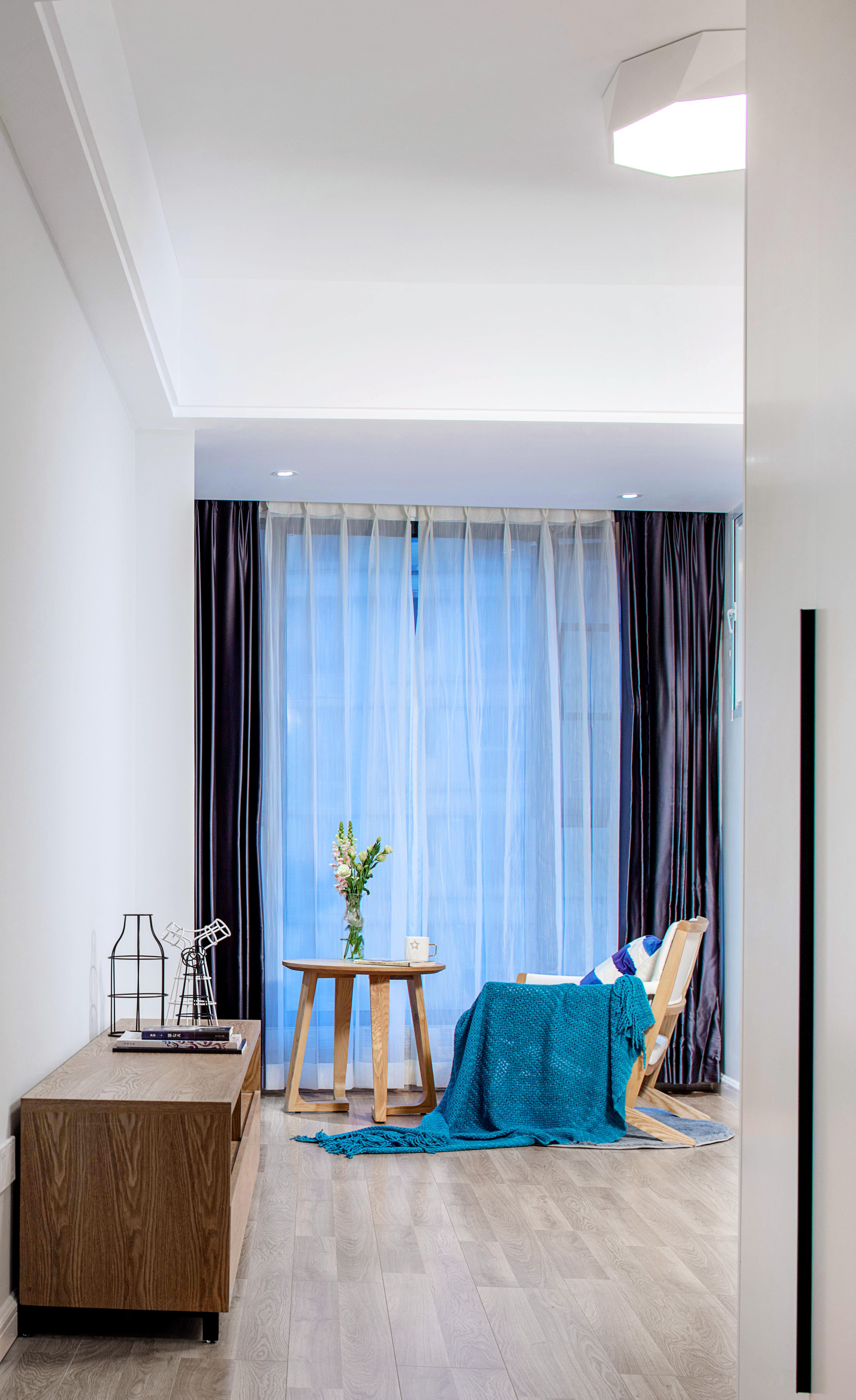 以柔和的天蓝色为主色调,木色家具陪衬,灰色布艺点缀,局部同色系深蓝碰撞,赋予空间北欧艺术的明快格调,对装饰与色彩的节制,剥离掉许多无谓的外在,以本真的雅致构设精神的悠然地带,能够让居者安于当下,心无杂念,享受现在。让空间剥离掉社会属性,让材料回归材料本身,让空间回归空间本身。