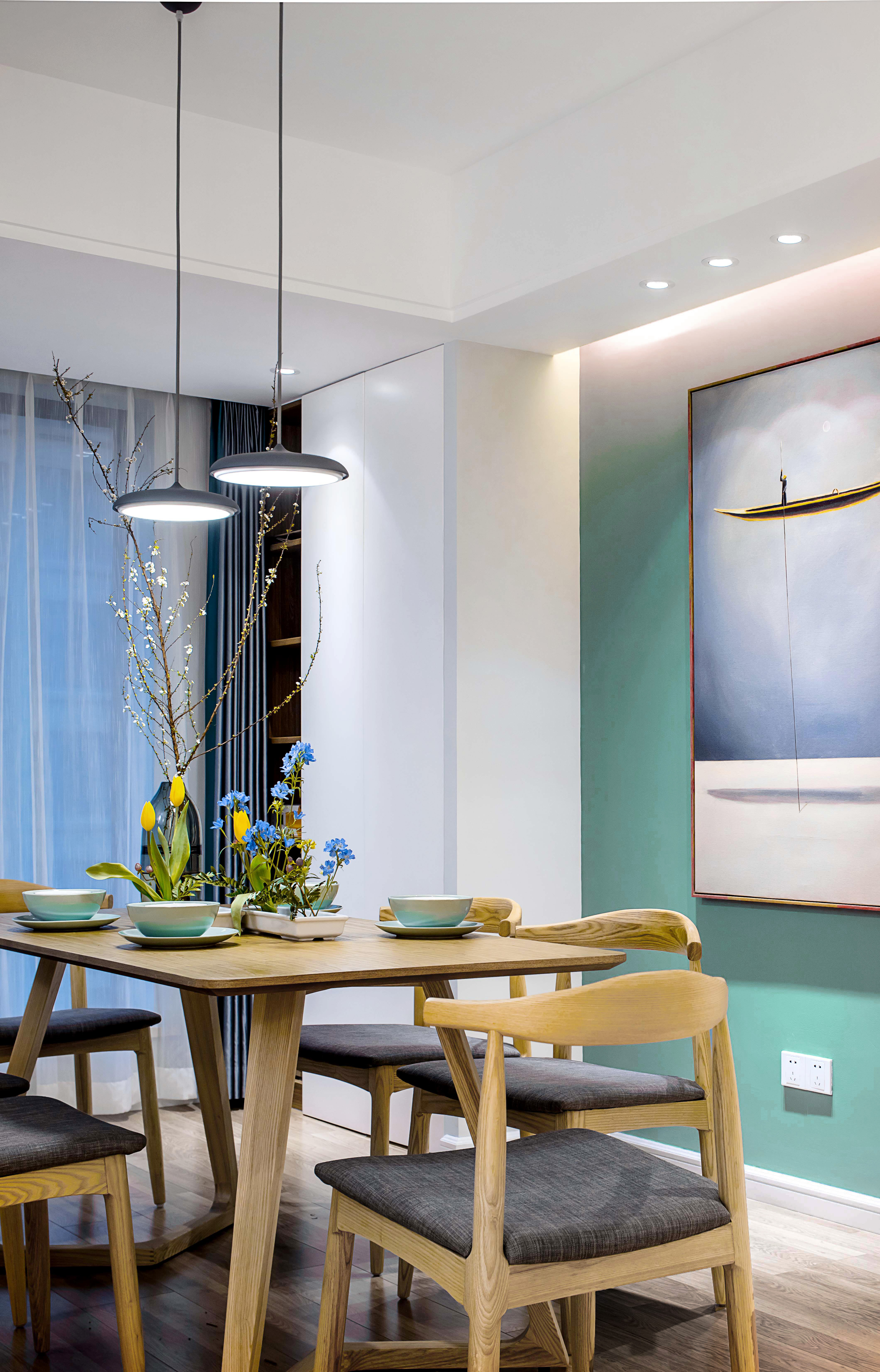 空间意境:繁杂忙碌的都市生活,家,给以悠然闲适的舒缓感受。与屋主交流,立意悠然,将“悠然”作为主体切入,以北欧风格的设计手法演绎出优雅而恬静的生活方式。整体线条简单,立面干脆,唯有光影交错和色彩跳跃作为辅助,用精致的细节诠释生活的雅致。