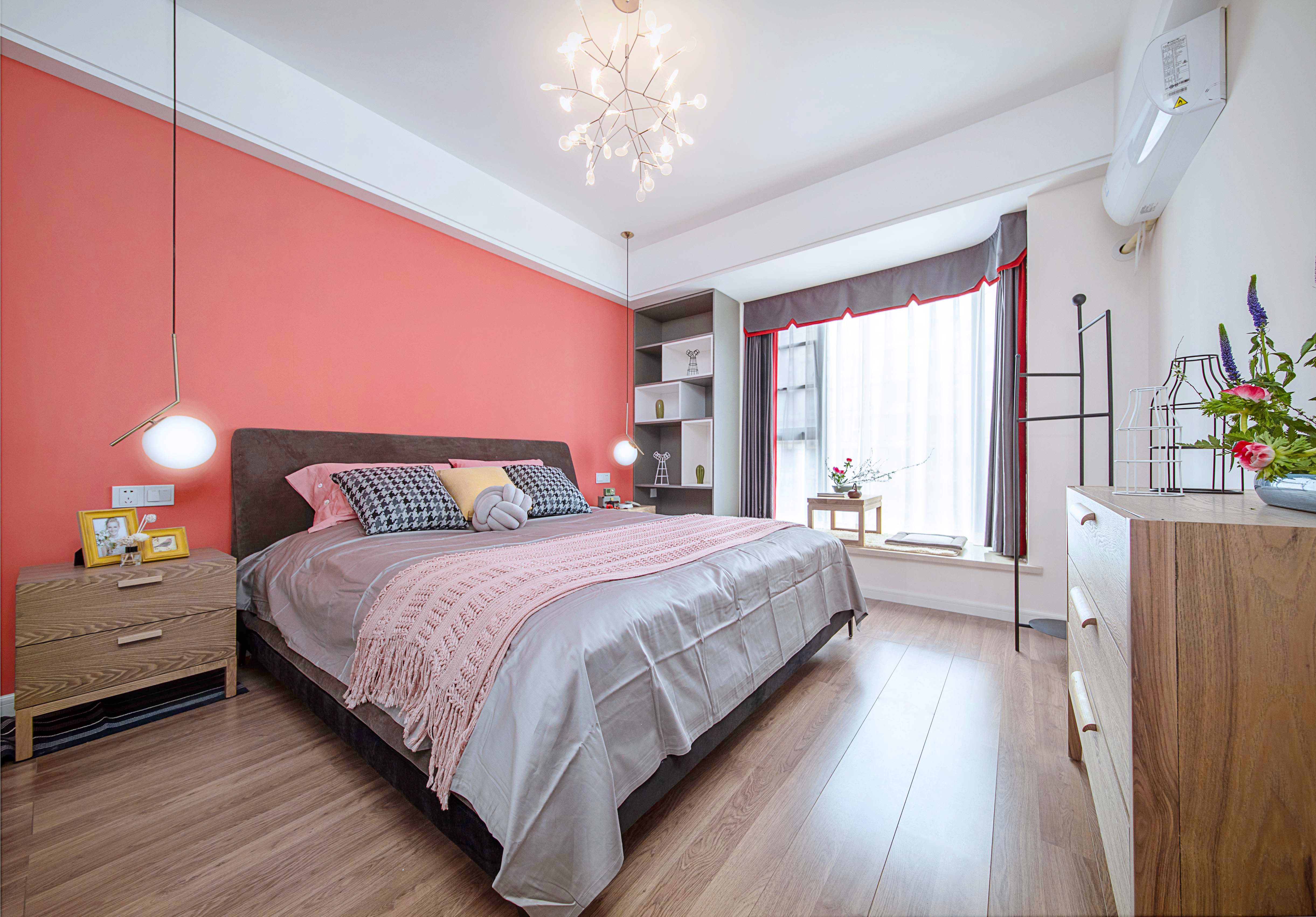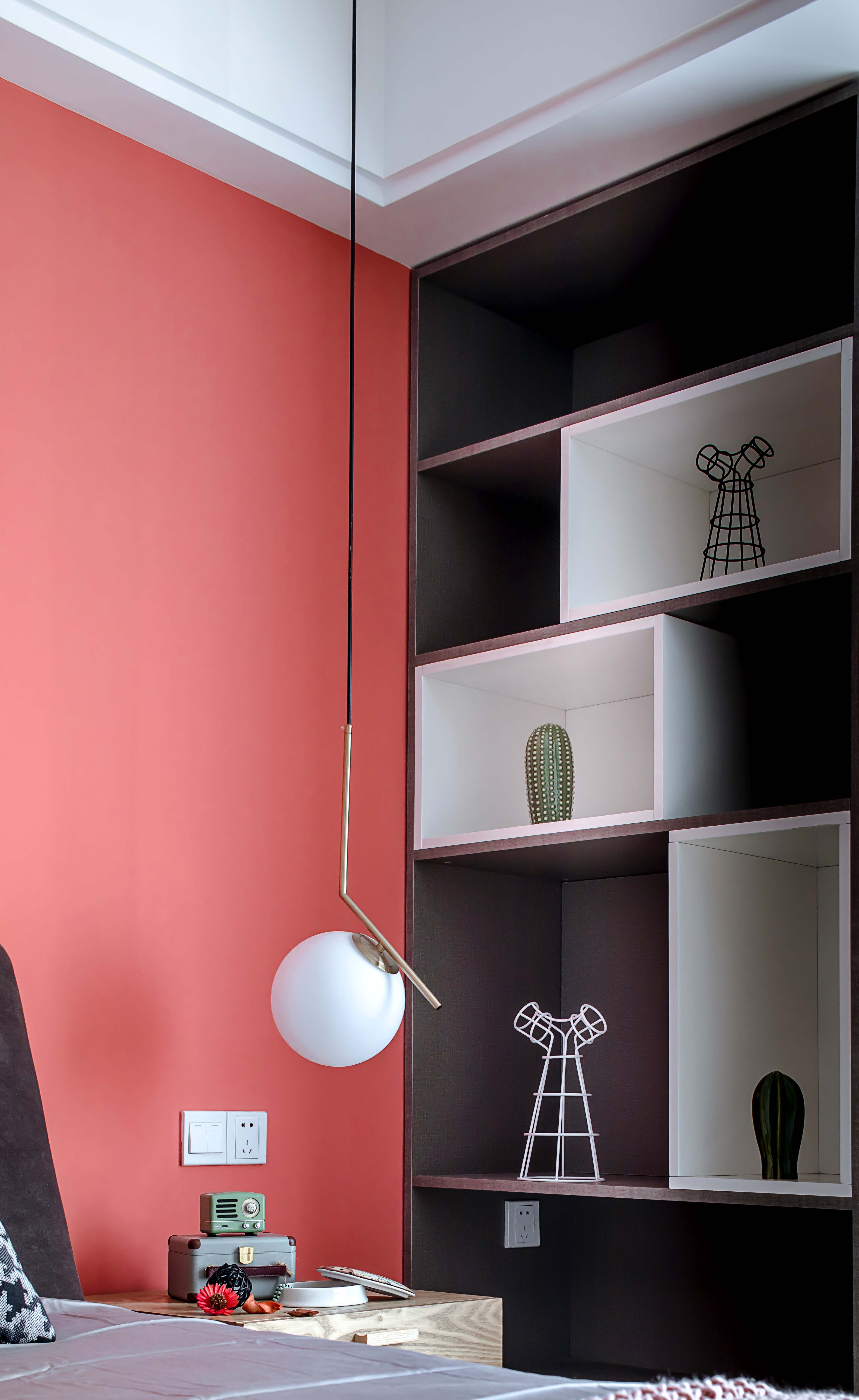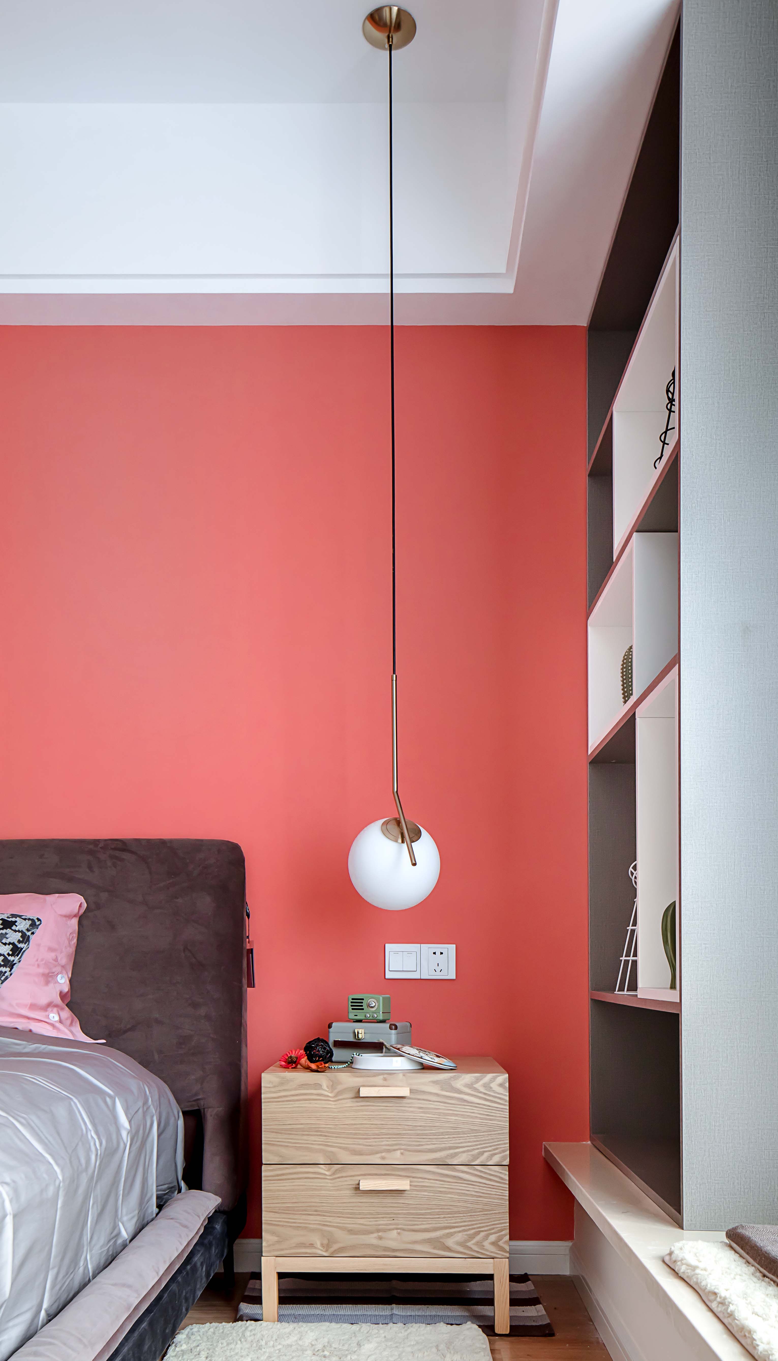 设计选材:乳胶漆(天蓝/深蓝/深灰红/粉色) 光源设计 木色家具