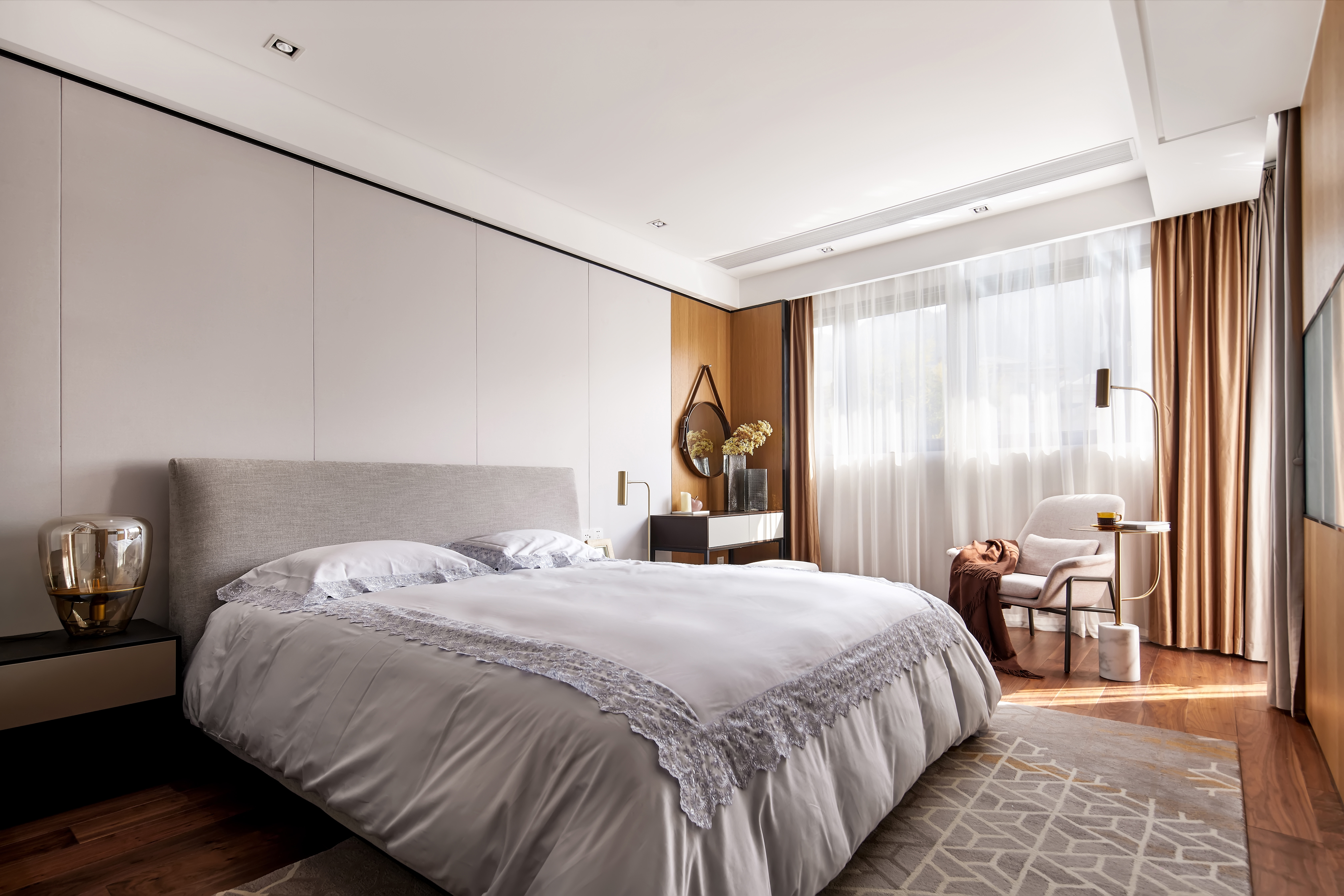 312.主卧更多的是基于女主人的性情和喜好,一切以自然安静温馨为主,家具床品均以棉麻为主,色彩以大地色铺陈,充分表达了女主人安然于心,安之若素的内在品味和最温柔的心意。