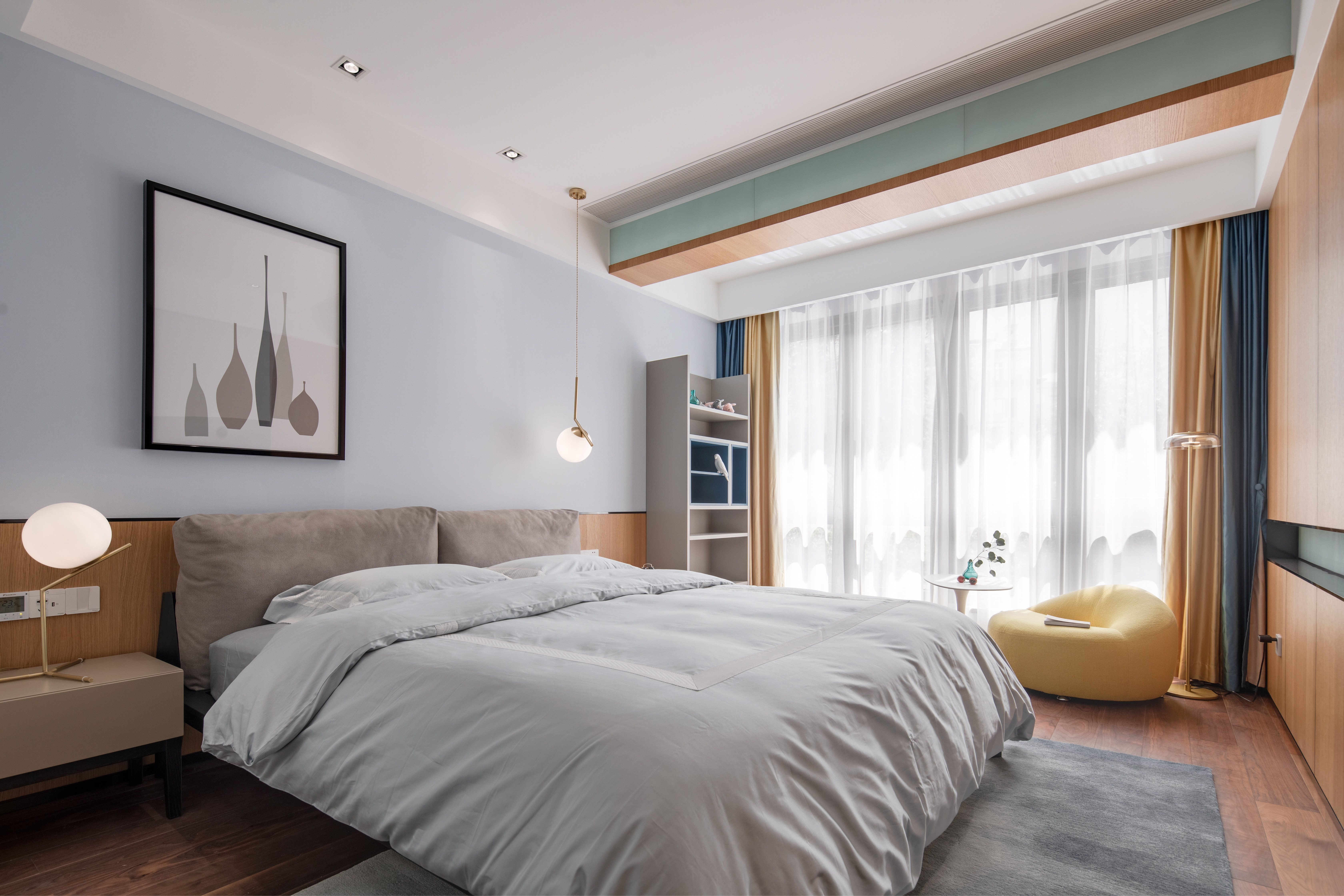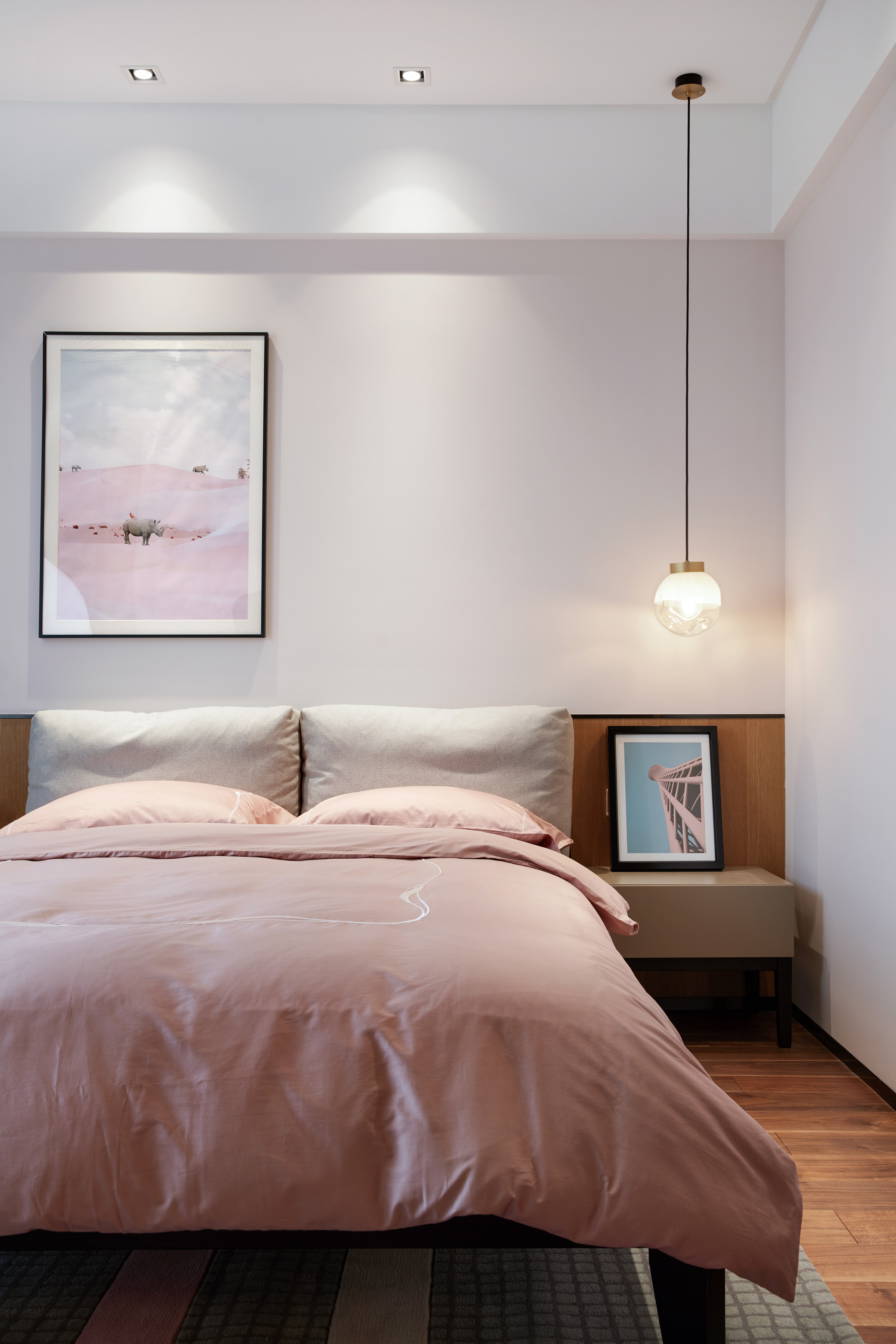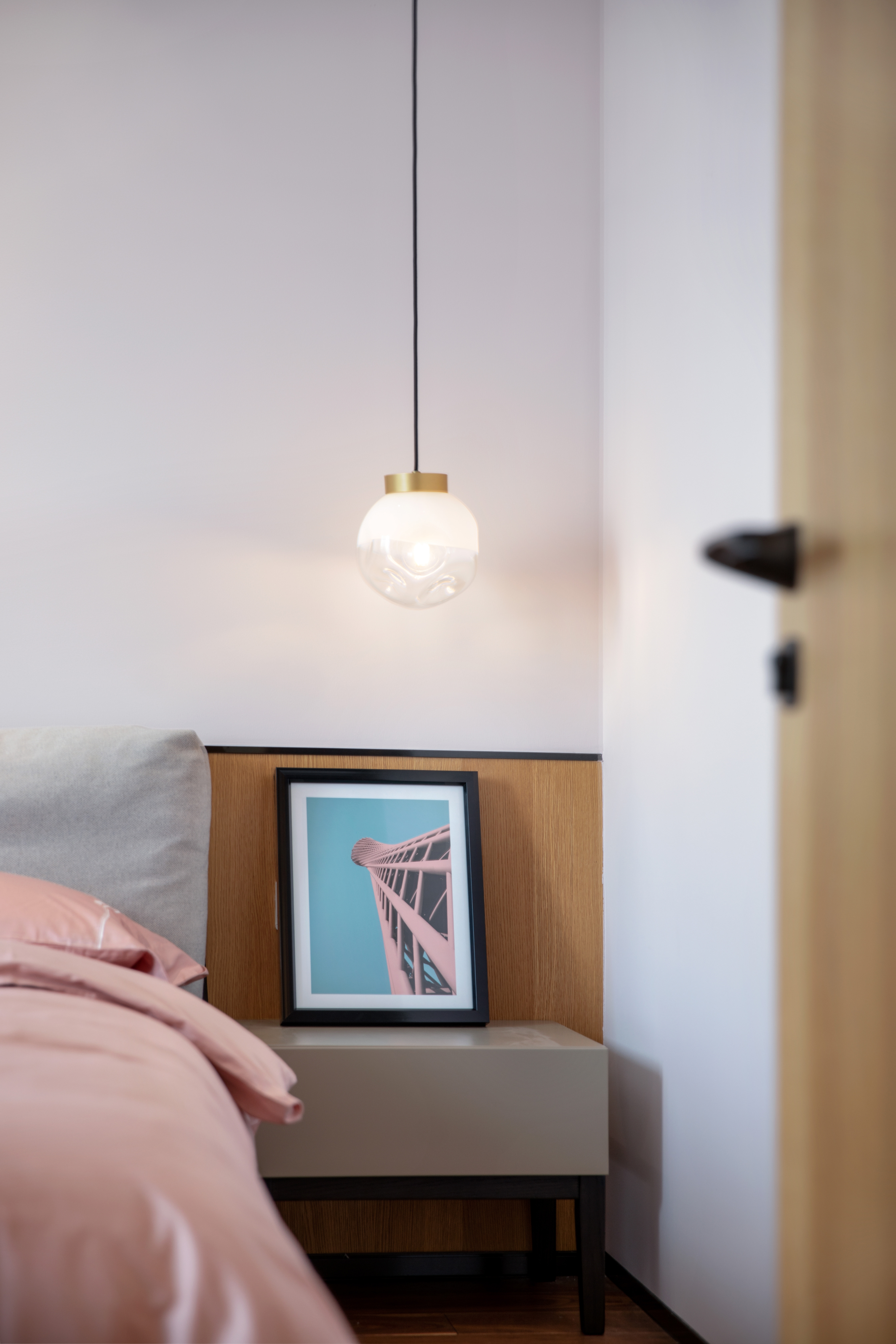 314.父母是孩子的终身老师,父母的基因在儿子身上完全体现,低饱和度的莫兰迪色和床头的一幅莫兰迪作品,显示出了九岁儿子的温和性情。床头一边的吊灯又让这个空间多了些许的灵气。