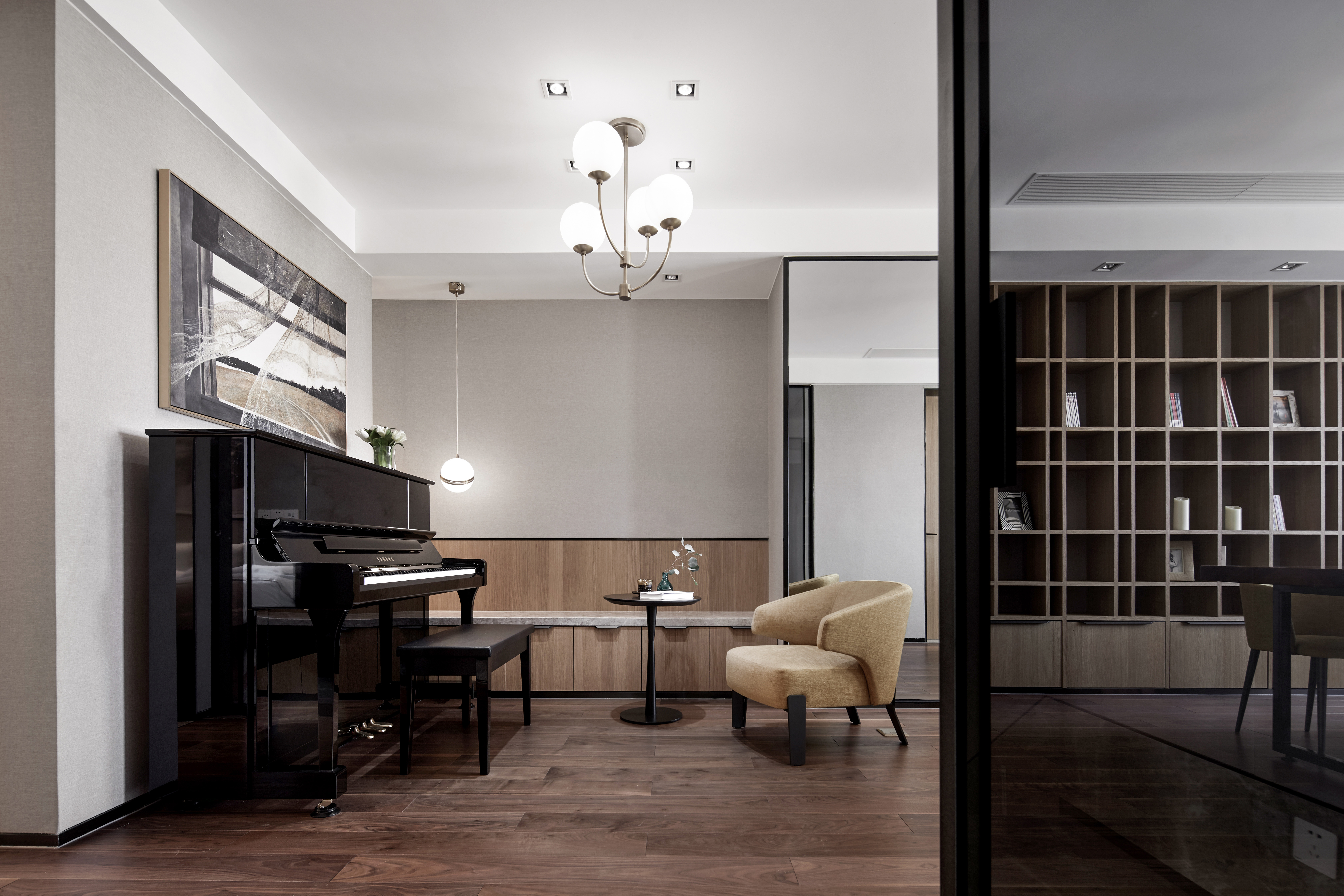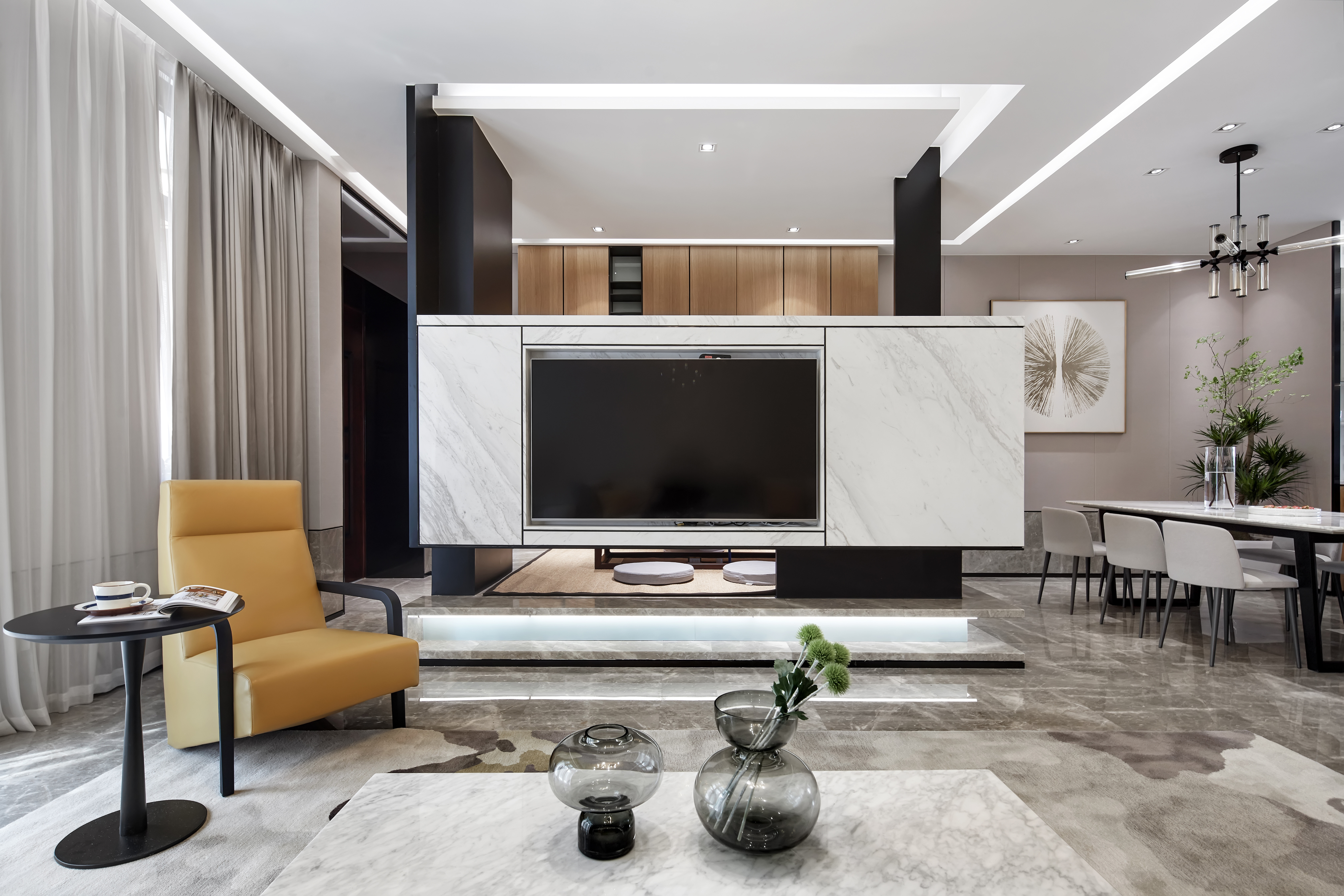 302.电视背景墻隔开了客厅和苶室, 。一张单人沙发的陈列方式架起了客厅和苶室之间的对话一动一静 经纬分明又合谐共处。