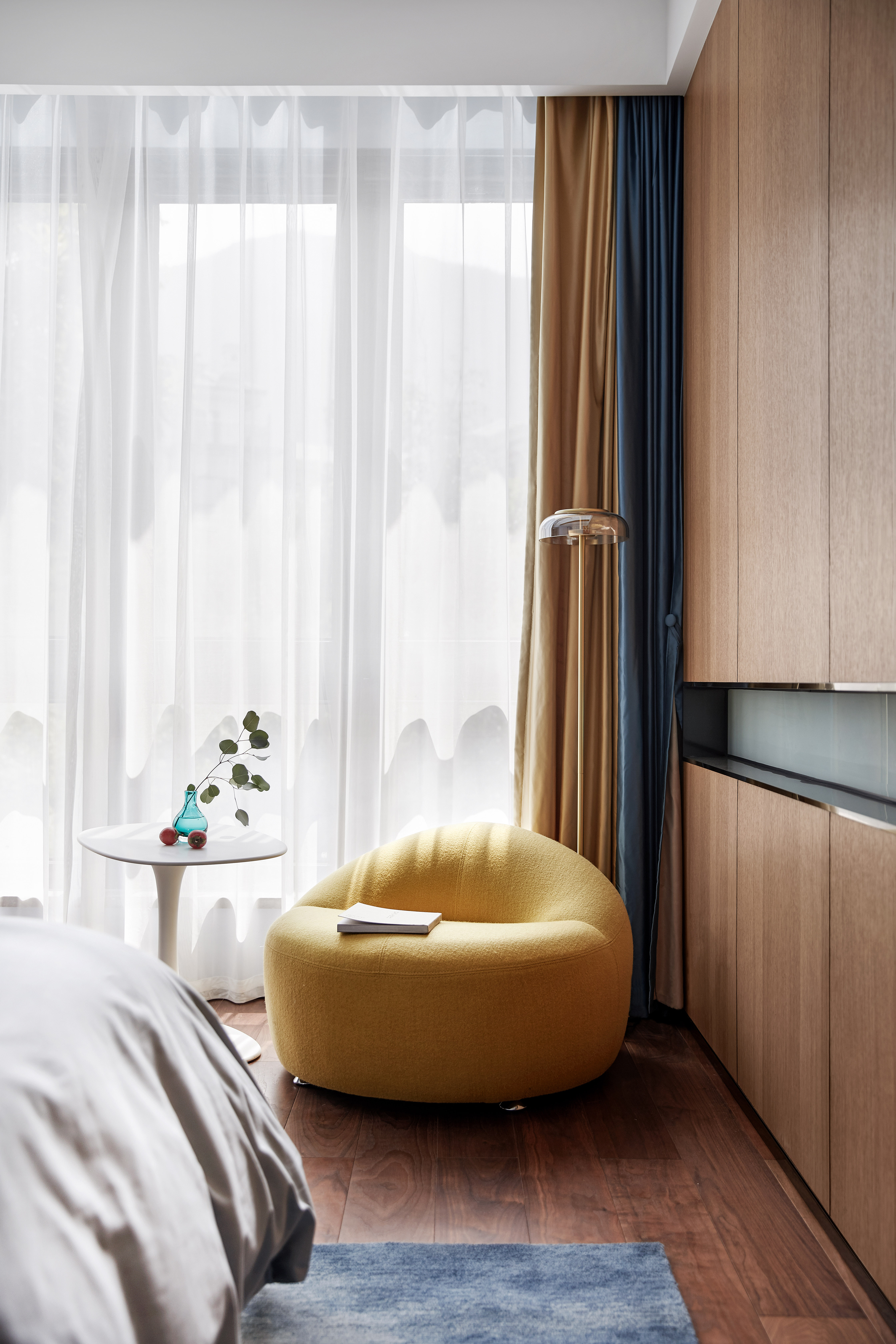 304.黄色单人沙发做为空间的点缀色,让简约的空间有了层次,加上一角的落地灯,丰富了视觉感受又让空间显得更加的温馨温暖,助兴了一天的欢容。