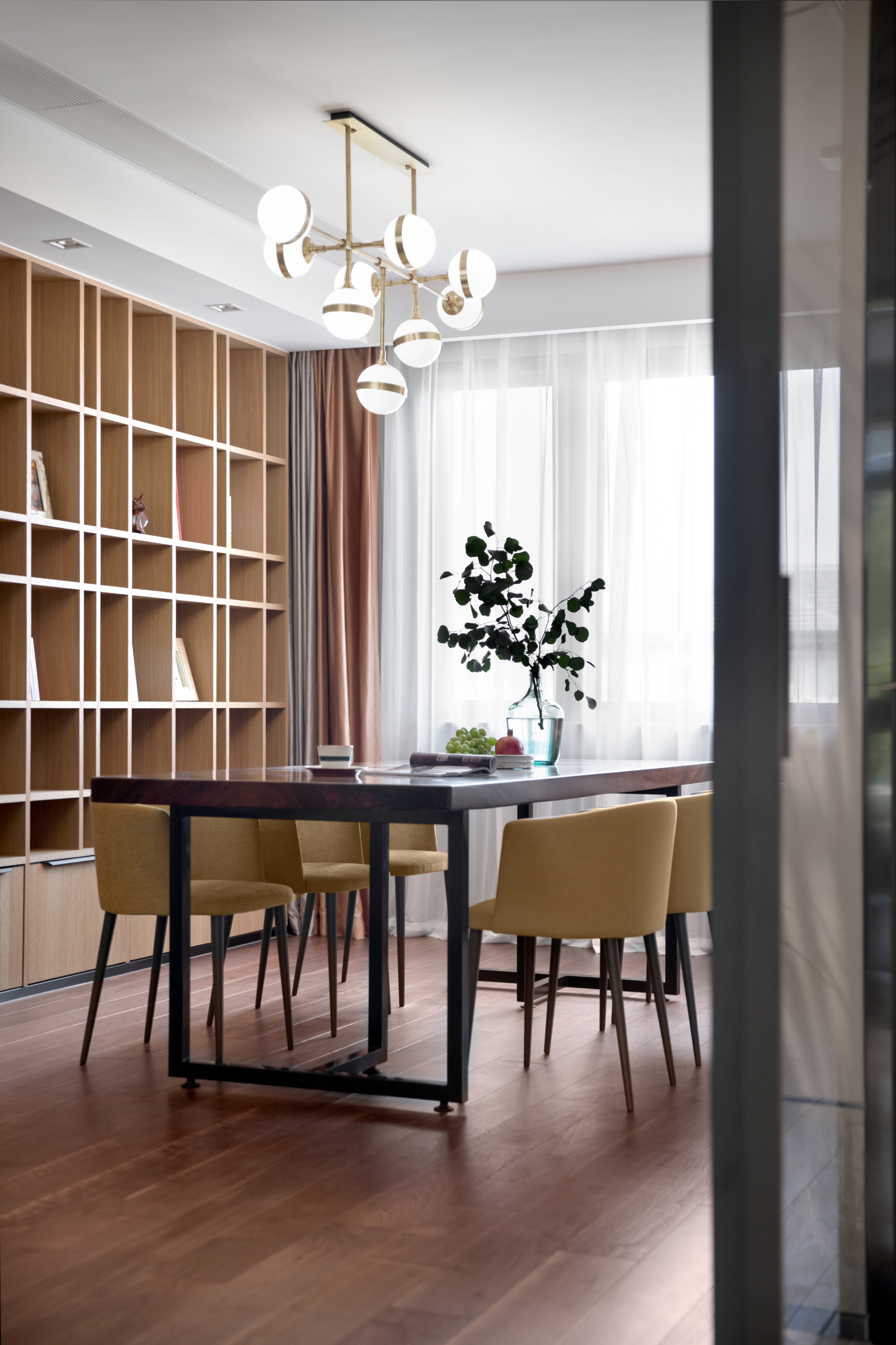 306.柿子寓意着丰收的季节,和客厅的金色禾麦挂画给业主寄于了最美好的祝福。安静的午后一苶一书,餐厅既是用餐亦可休闲。