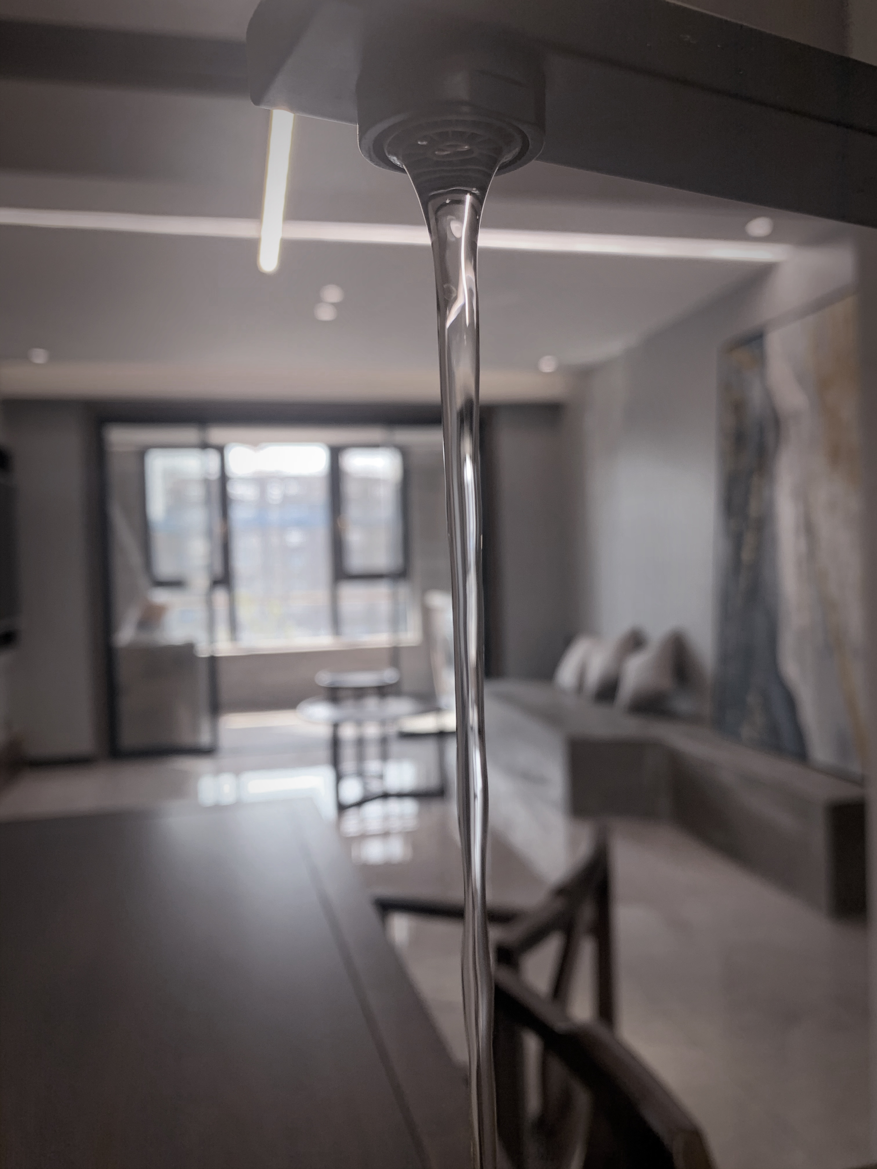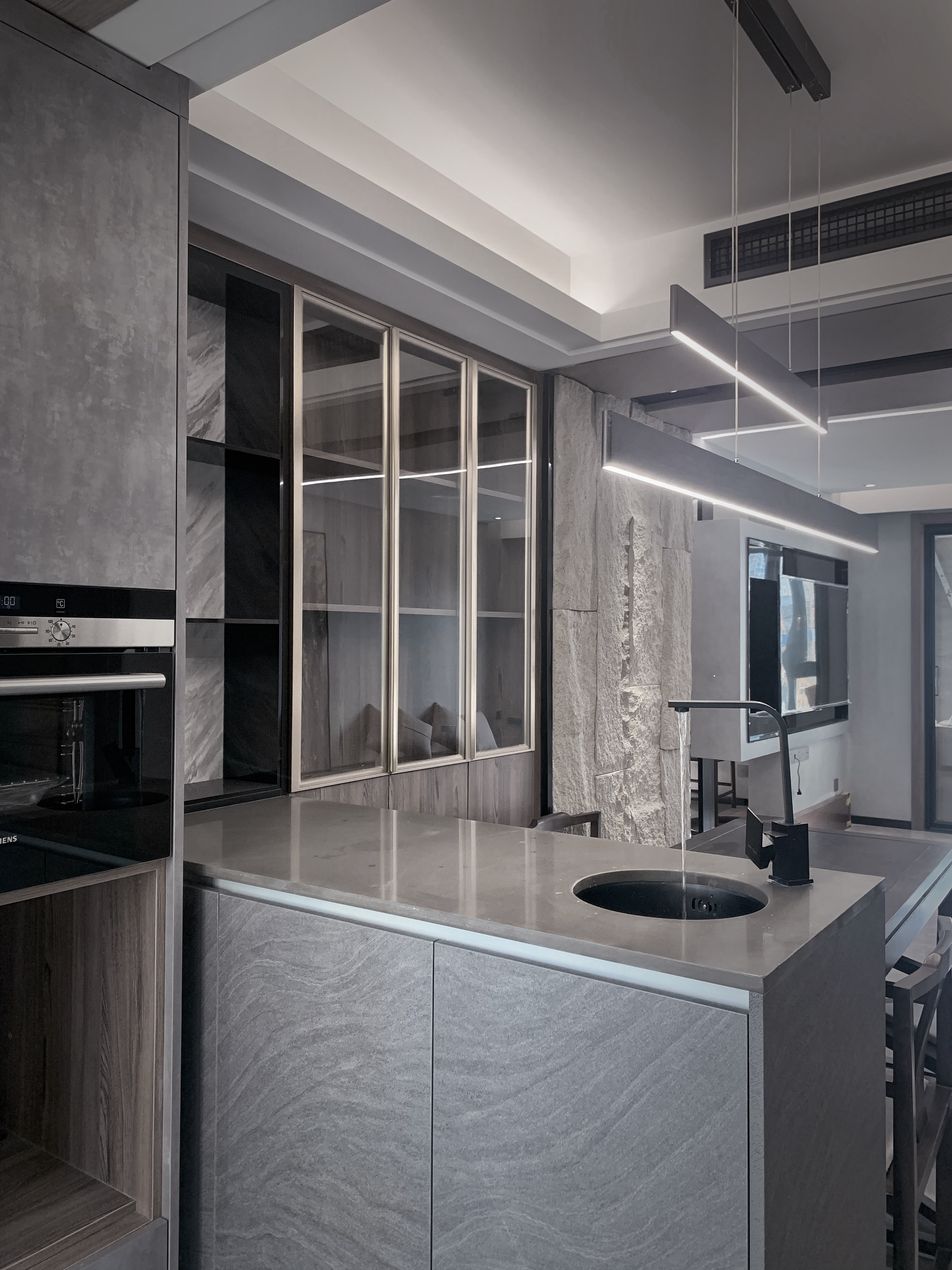 空间布局:把原本的过道整体往南挪动,形成了自然的玄关区,从而餐厅可以结合水吧西厨的功能,使得生活更加多样化和便利化。客厅和茶室的结合,运用借景的方式使得空间感更加宽阔,