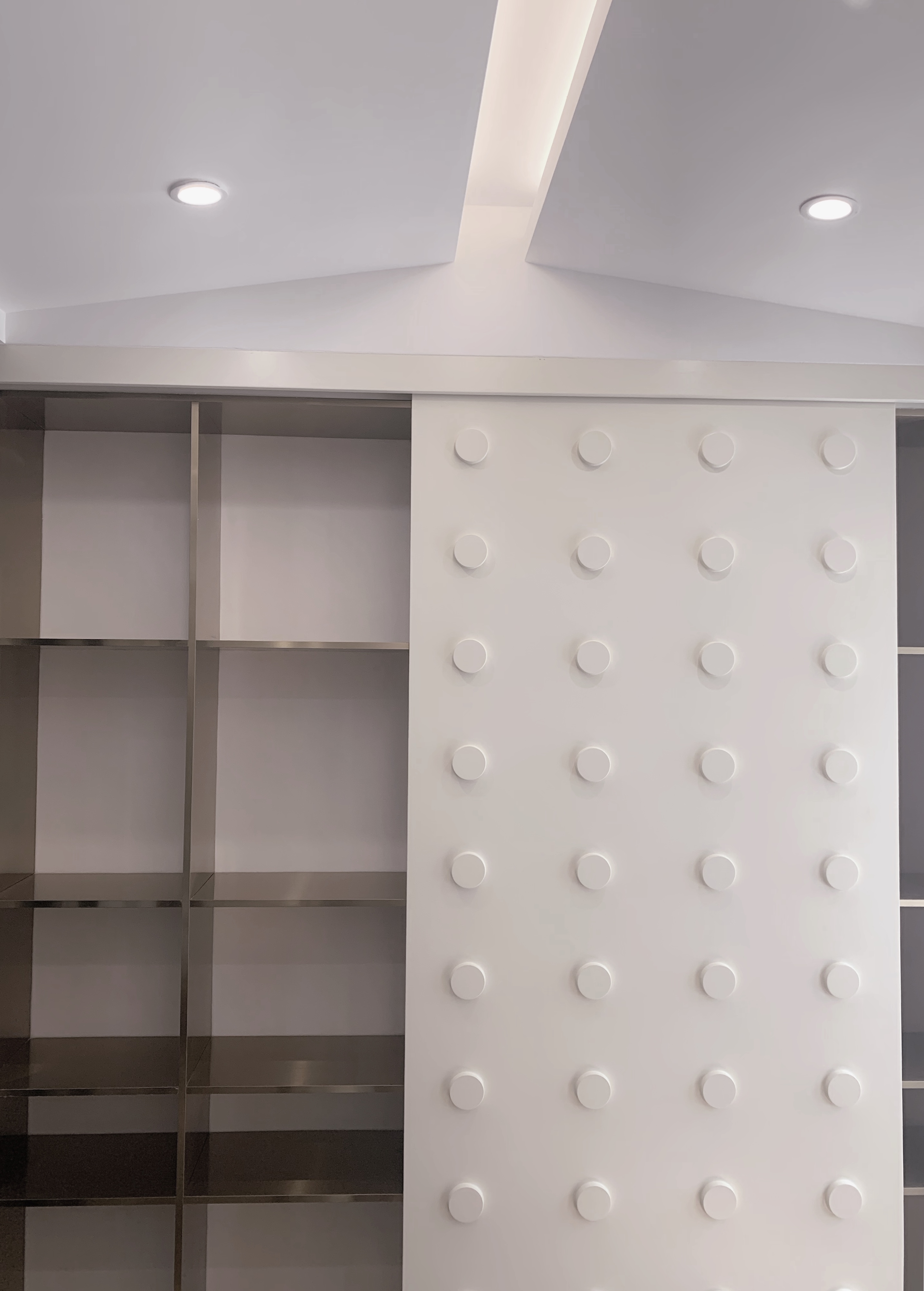 设计选材:入门玄关的pu石代替真正的石头,不仅降低层板受重的负荷,减少辐射,更降低了成本,而且效果很棒!顶部科定饰面板的使用不仅形成了麦穗顶的造型体现收获的主题,更提升了层高!家居金属装饰柜的使用,不仅提倡了减少伐木,更呼吁环保!