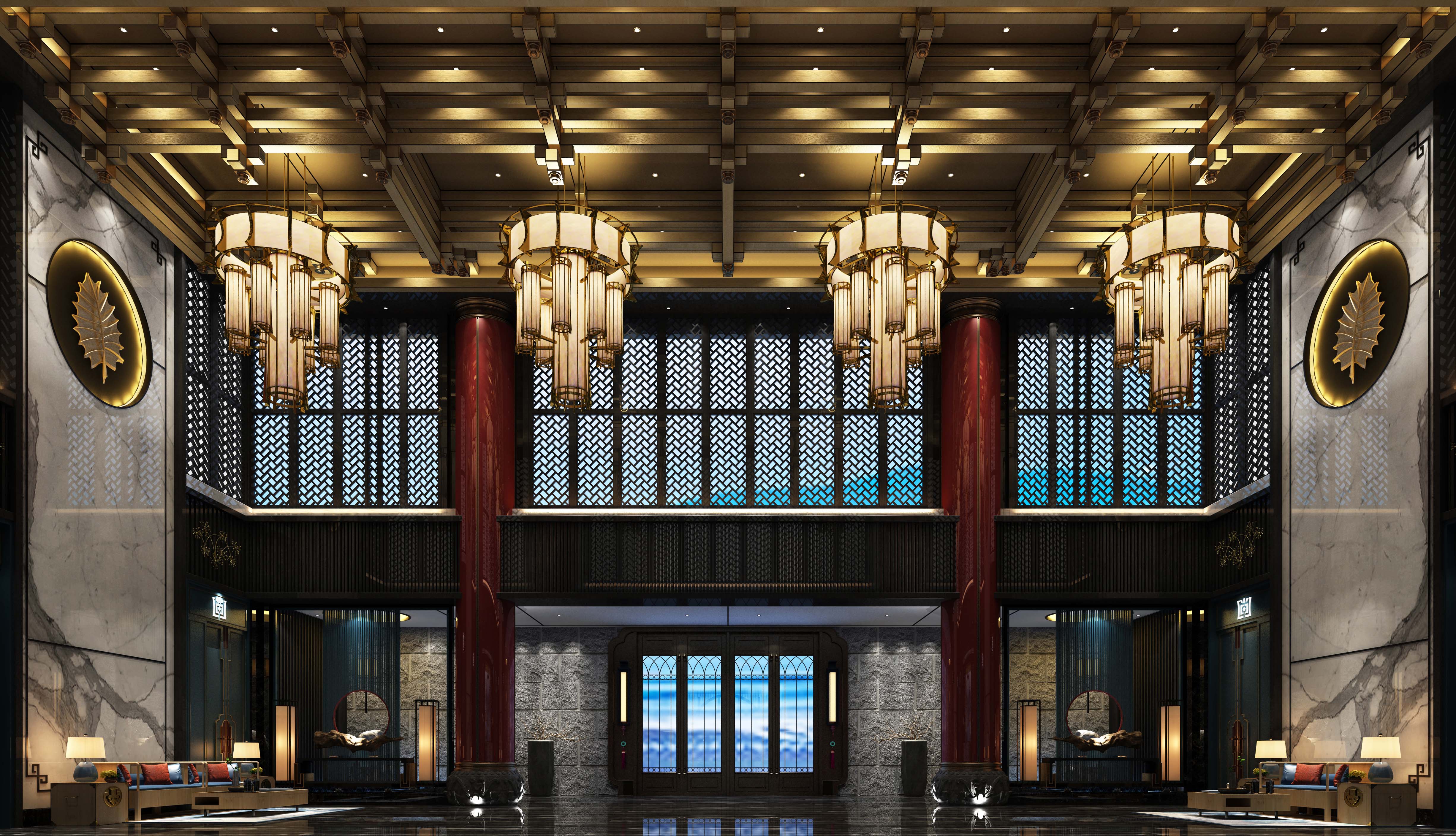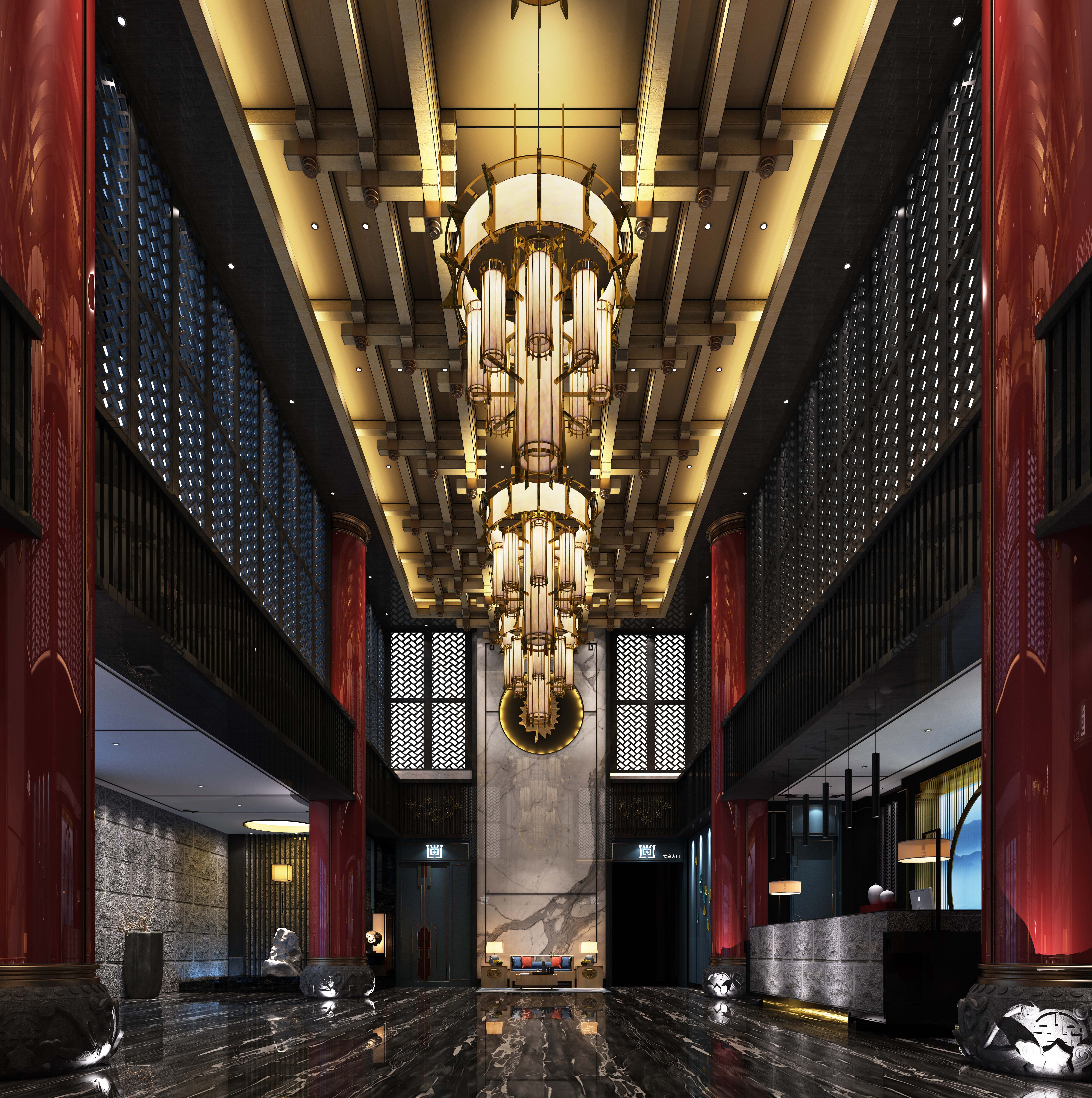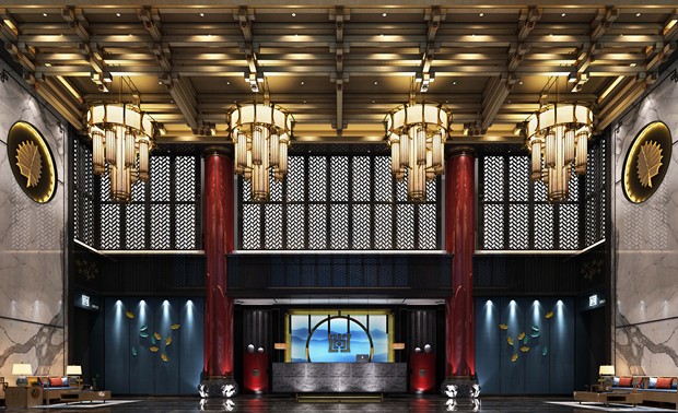 空间布局:大堂入口处其空间上讲究层次,多用隔窗、屏风来分割。天花以木条相交成方格形,上覆木板,造型简单的环形吊灯,层次清晰、优雅、庄严,我们以浓烈而深沉的色彩来装饰,喜欢用接近深色的黑与红装饰色彩对称的布局方式,格调高雅,造型简朴优美,色彩浓重而成熟。