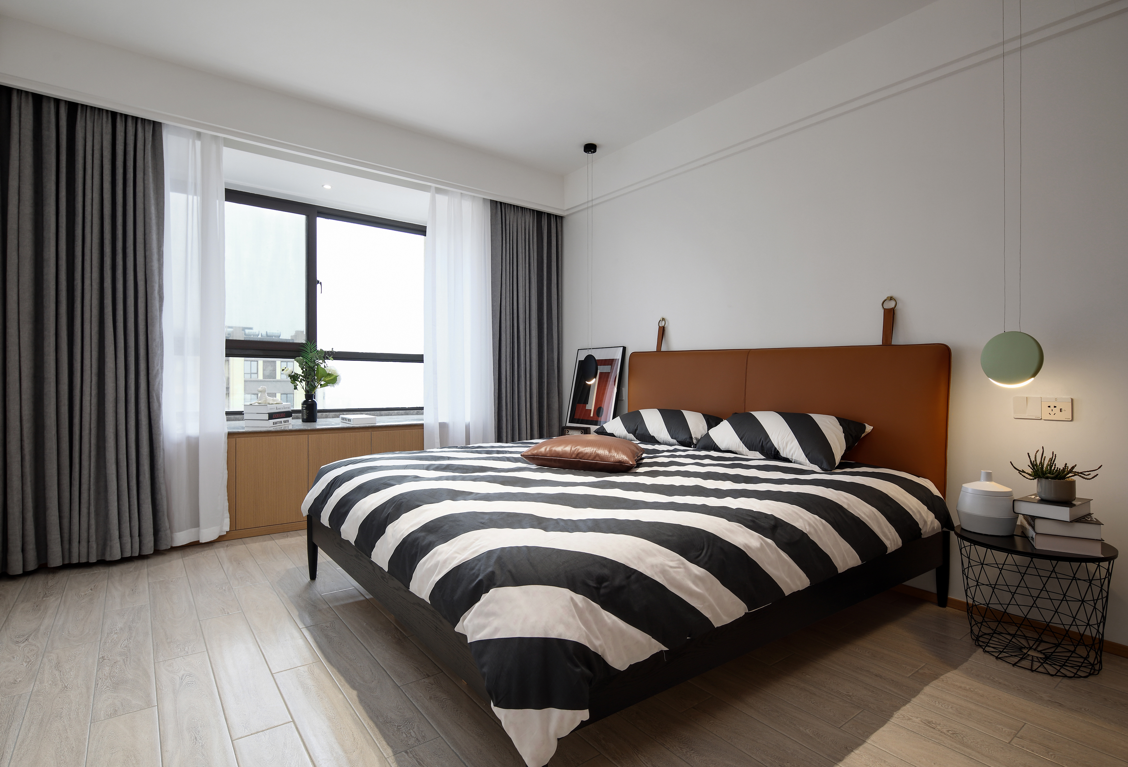 主卧床头摒弃一切无关的装饰,黑色的床体、浅棕色的皮艺靠背搭配黑白条的床品,沉稳中透露出主人不羁的自由自在。吊挂的床头照明,既有年轻人的独特风格,也有充满现代的时尚感。