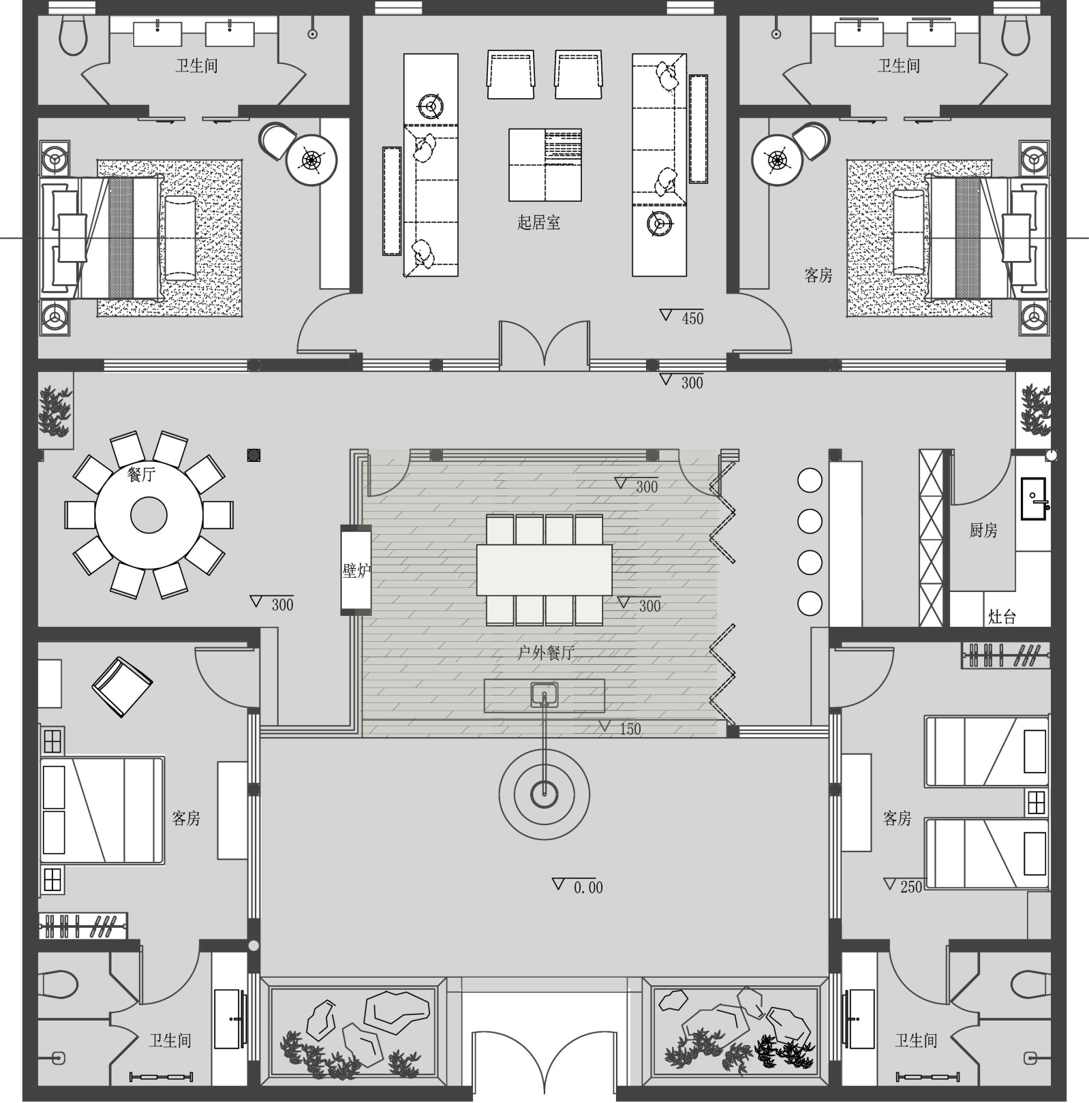 空间意境:以明确设计风格区别于当地其他民宿酒店以当地文化为设计背景,营造一处悠闲,雅致,趣味的雅居