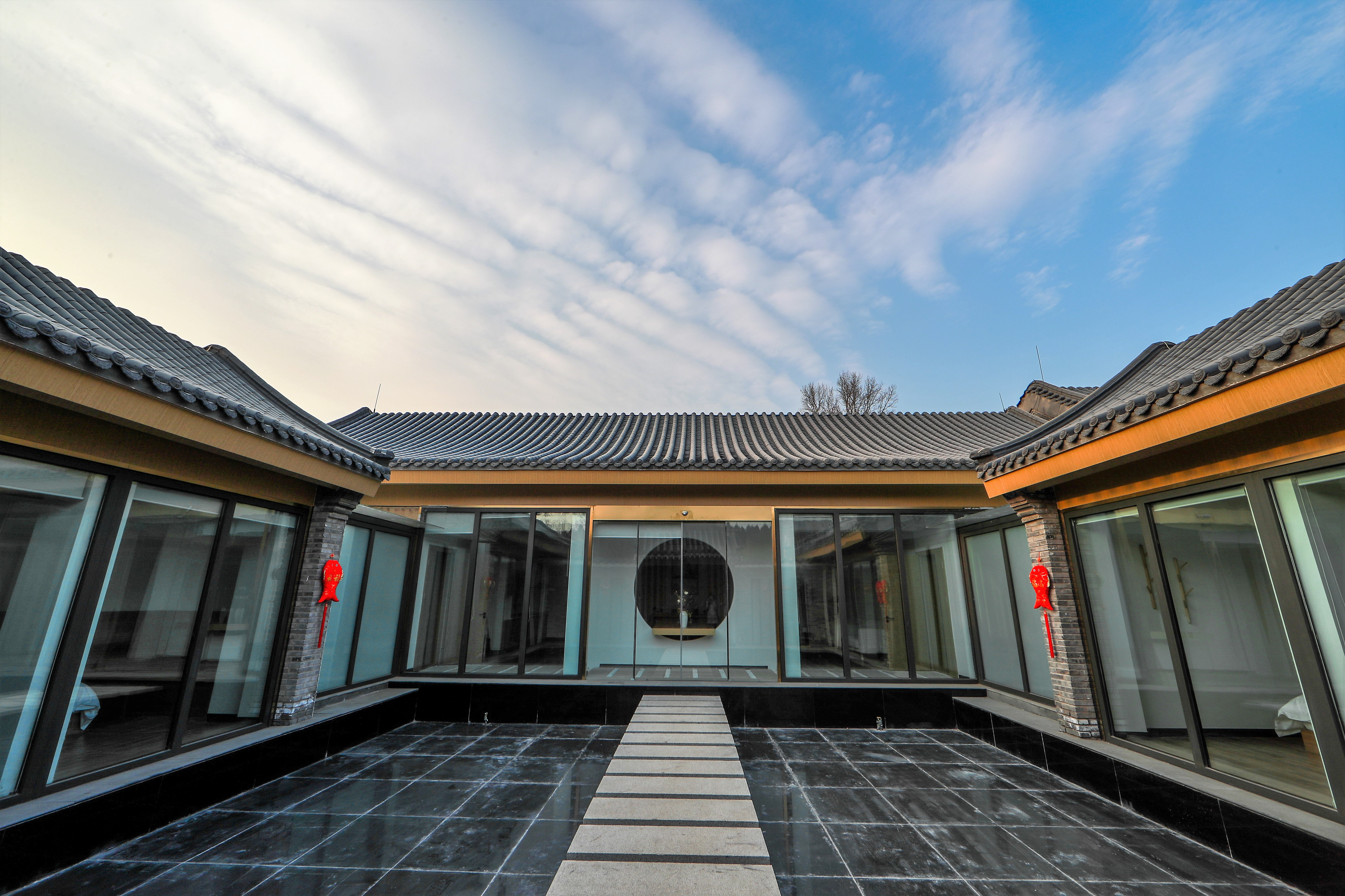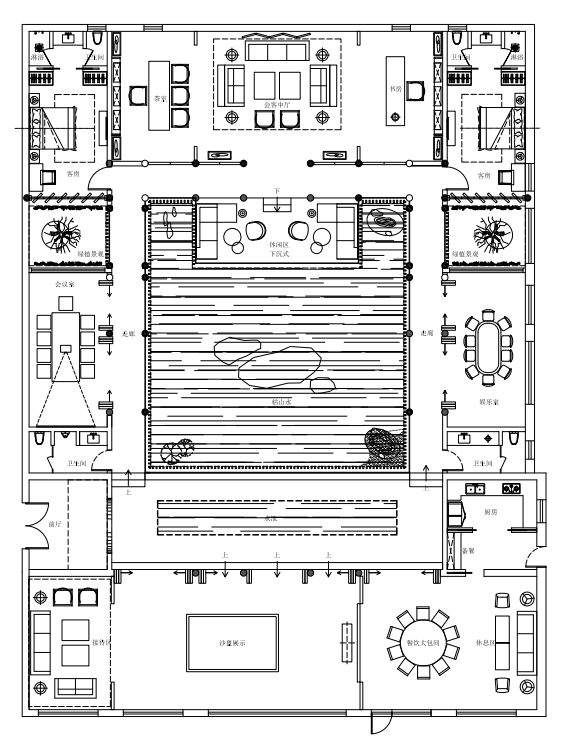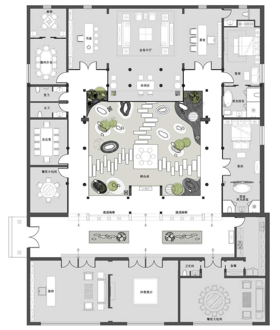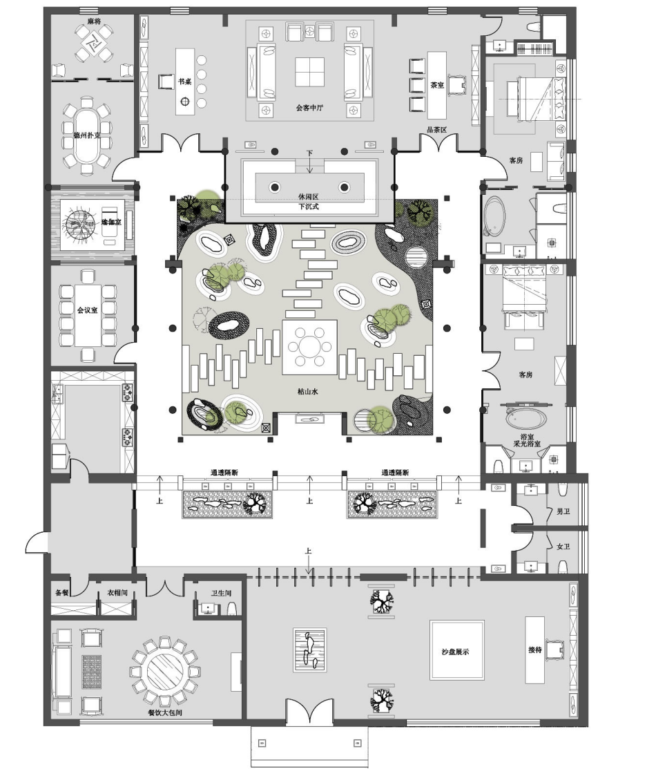 项目定位:功能性与实用性融合,室内环境与室外环境融合,中式四合院文化与现代文化融合,会所的尊贵、典雅与四合院特色融合。
