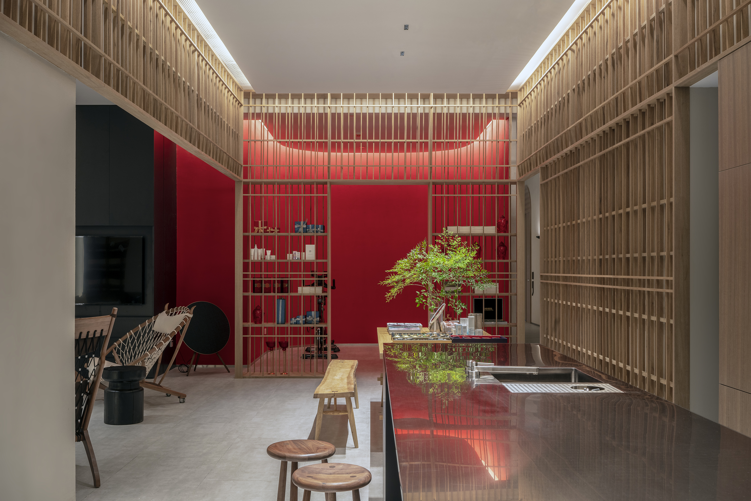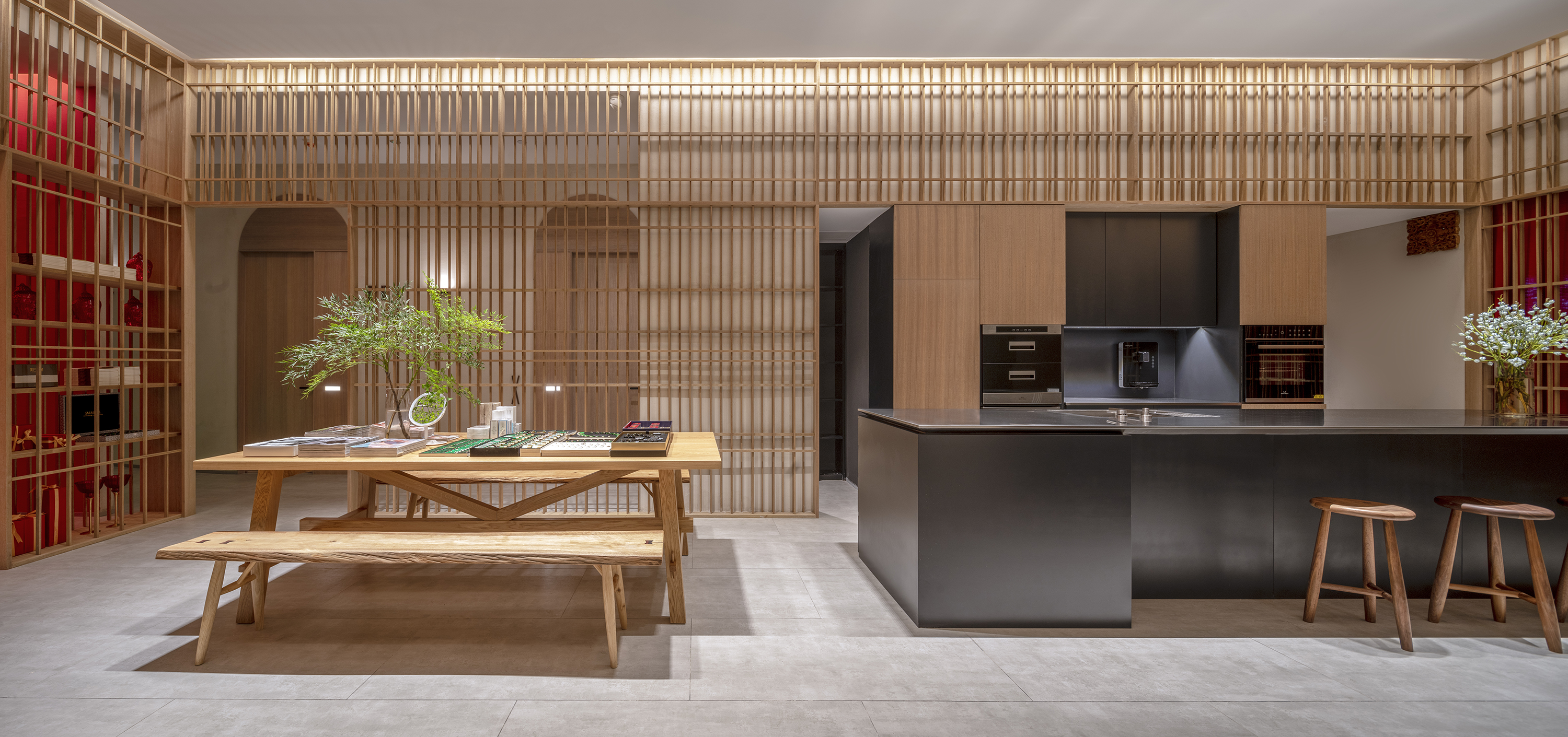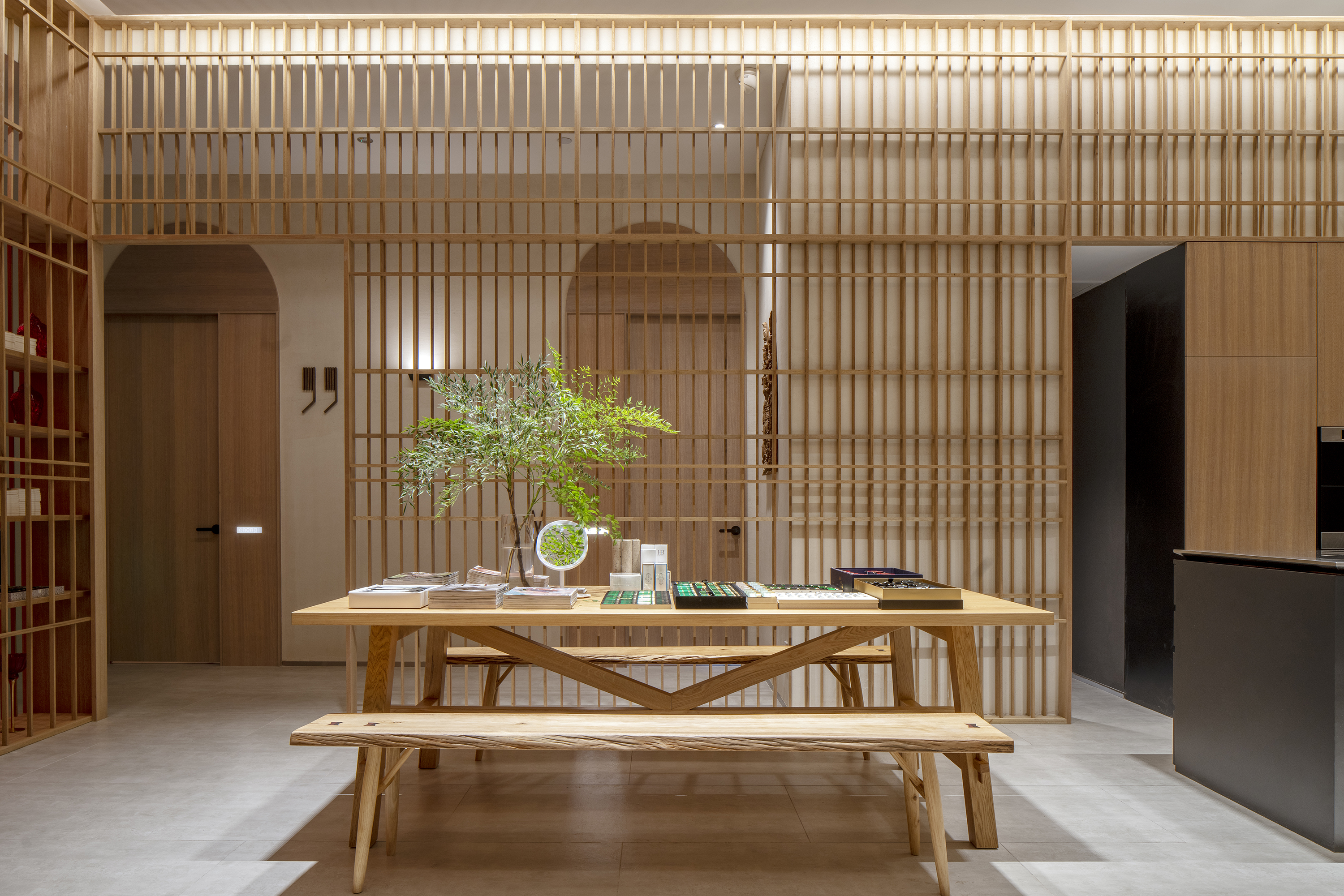 打破旧有布局的局限,重塑全新的空间关系。原接待大厅变为拥有餐厅、厨房、客厅、书房、健身等功能的互动体验空间,客人可以选择喜欢的方式:品酒,喝茶,聊天,看书,听音乐……就如在自家一样轻松自在。