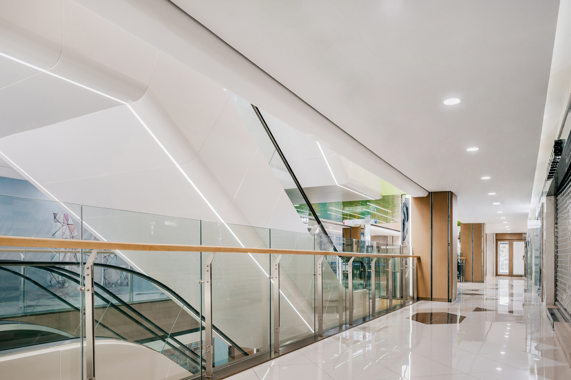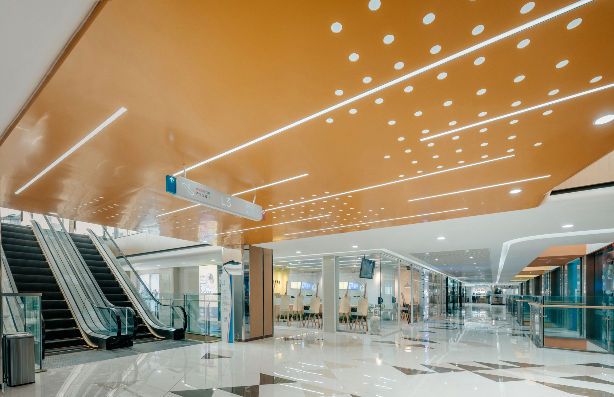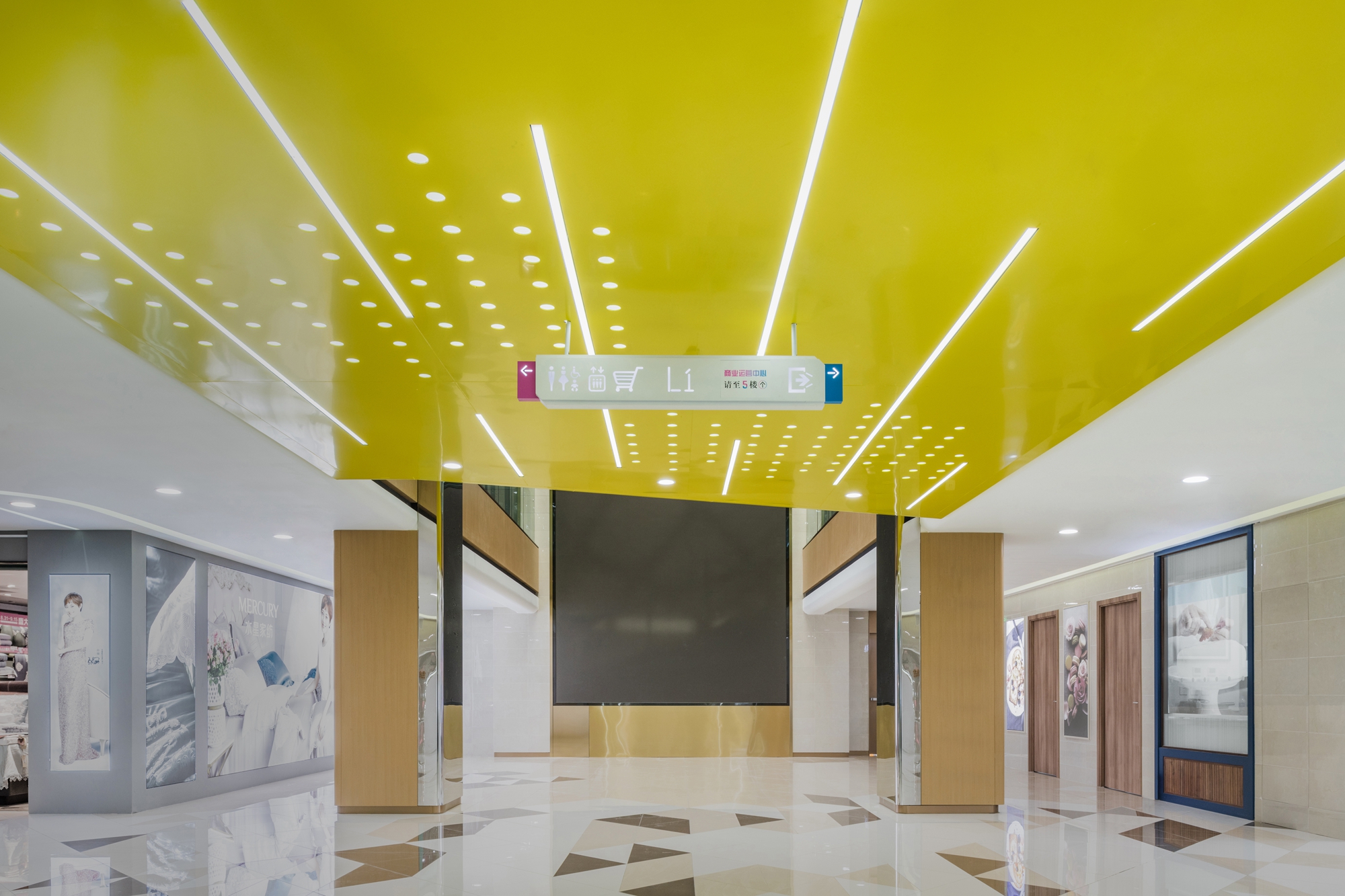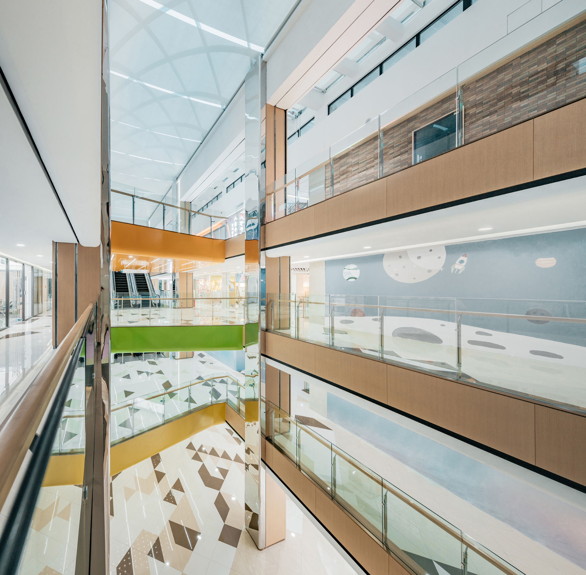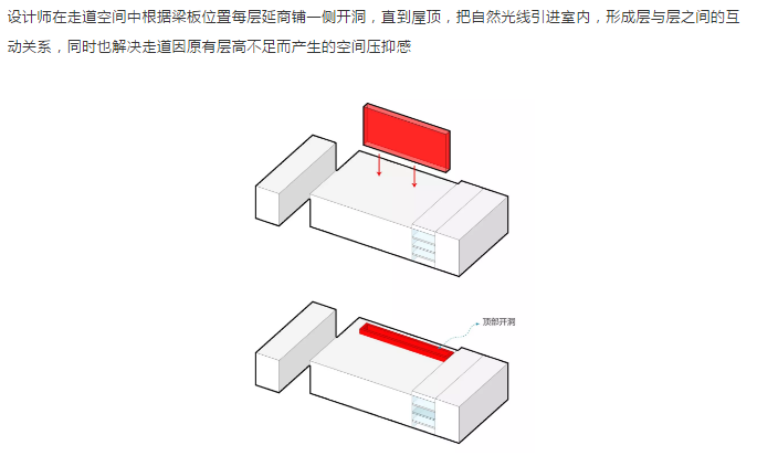 设计选材:设计师在走道空间中根据梁板位置每层延商铺一侧开洞,直到屋顶,把自然光线引进室内,形成层与层之间的互动关系,同时也解决走道因原有层高不足而产生的空间压抑感。开洞顶部以彩虹为渐变色为装饰,让光影和色彩随着阳光的照射不断变化,能把感受者引入到一个想象的空间境界。在空间中,色彩不仅对人们的视觉环境产生影响,还直接影响着人们的情绪和心理,明度适中的色调能使人心情放松,精神舒缓