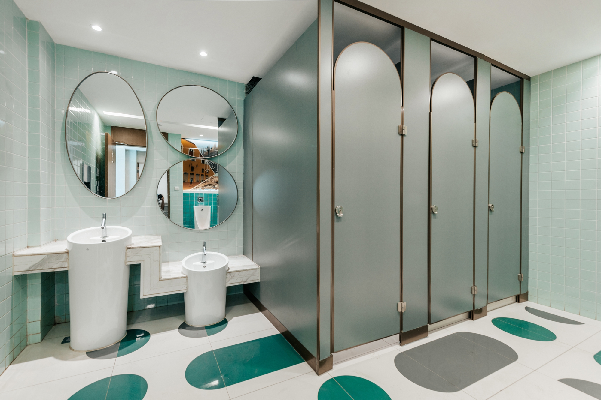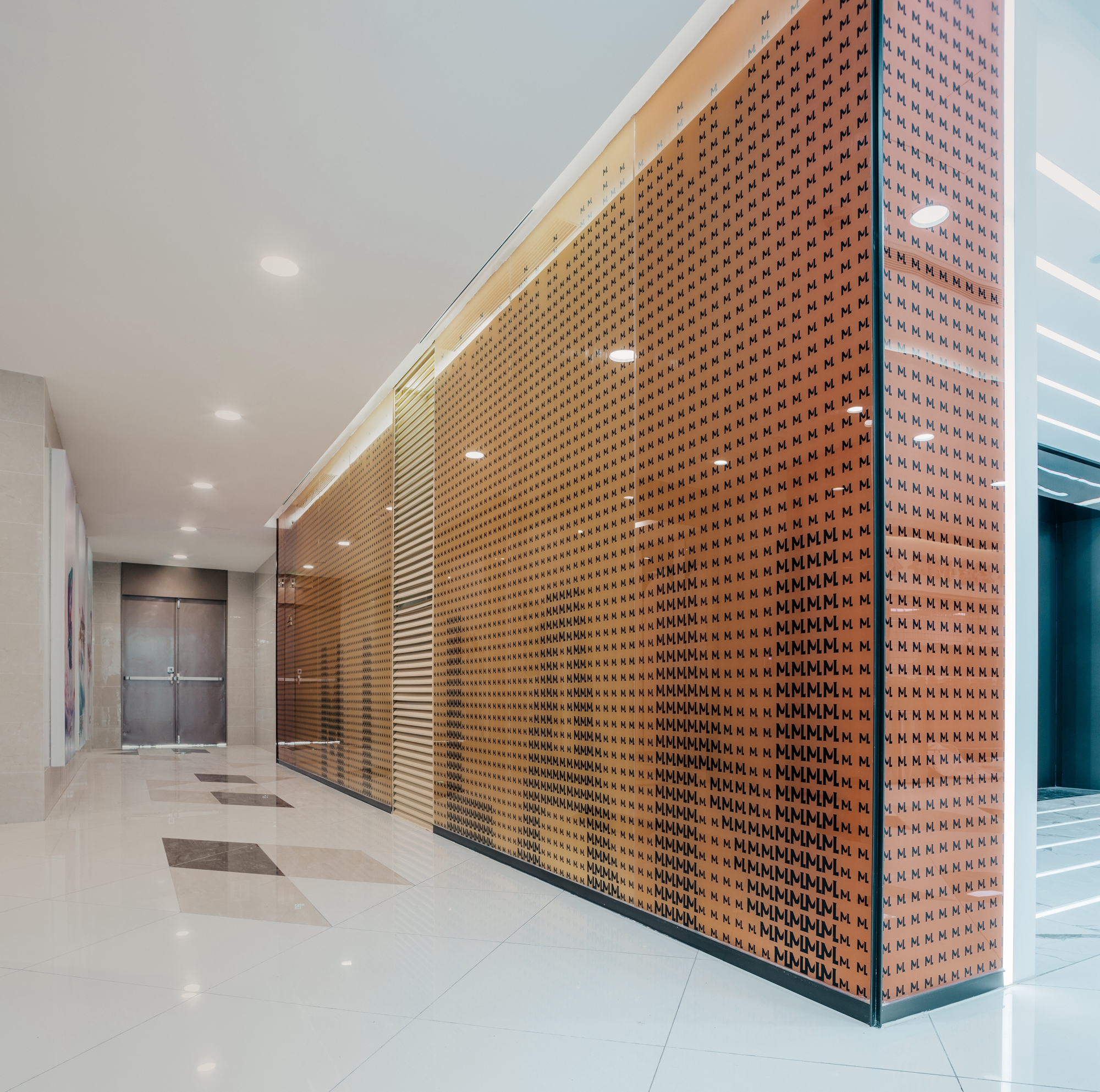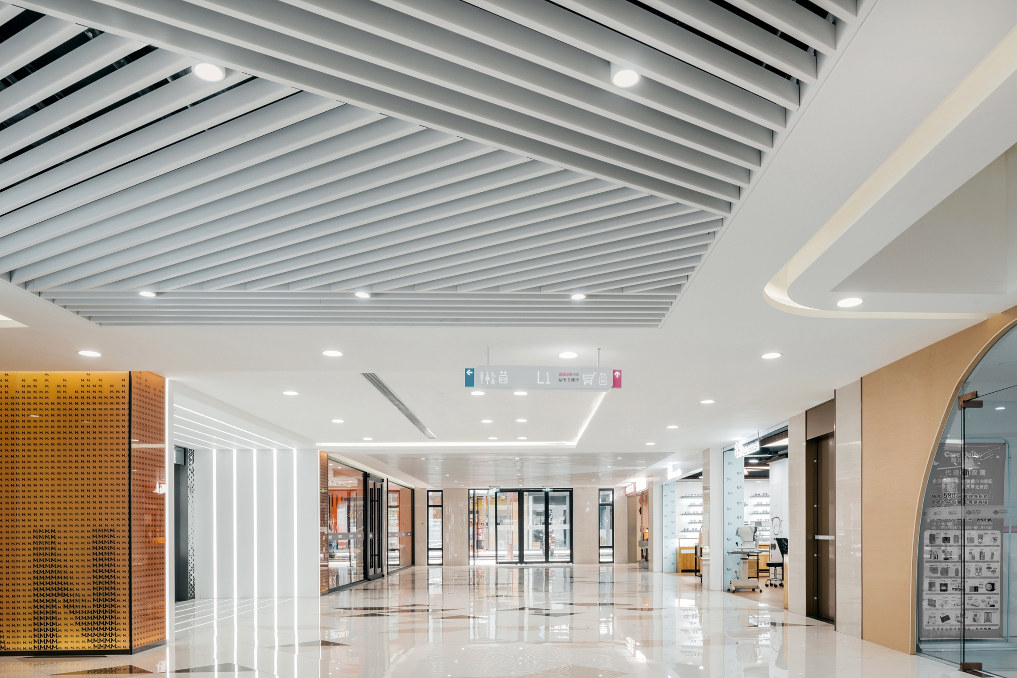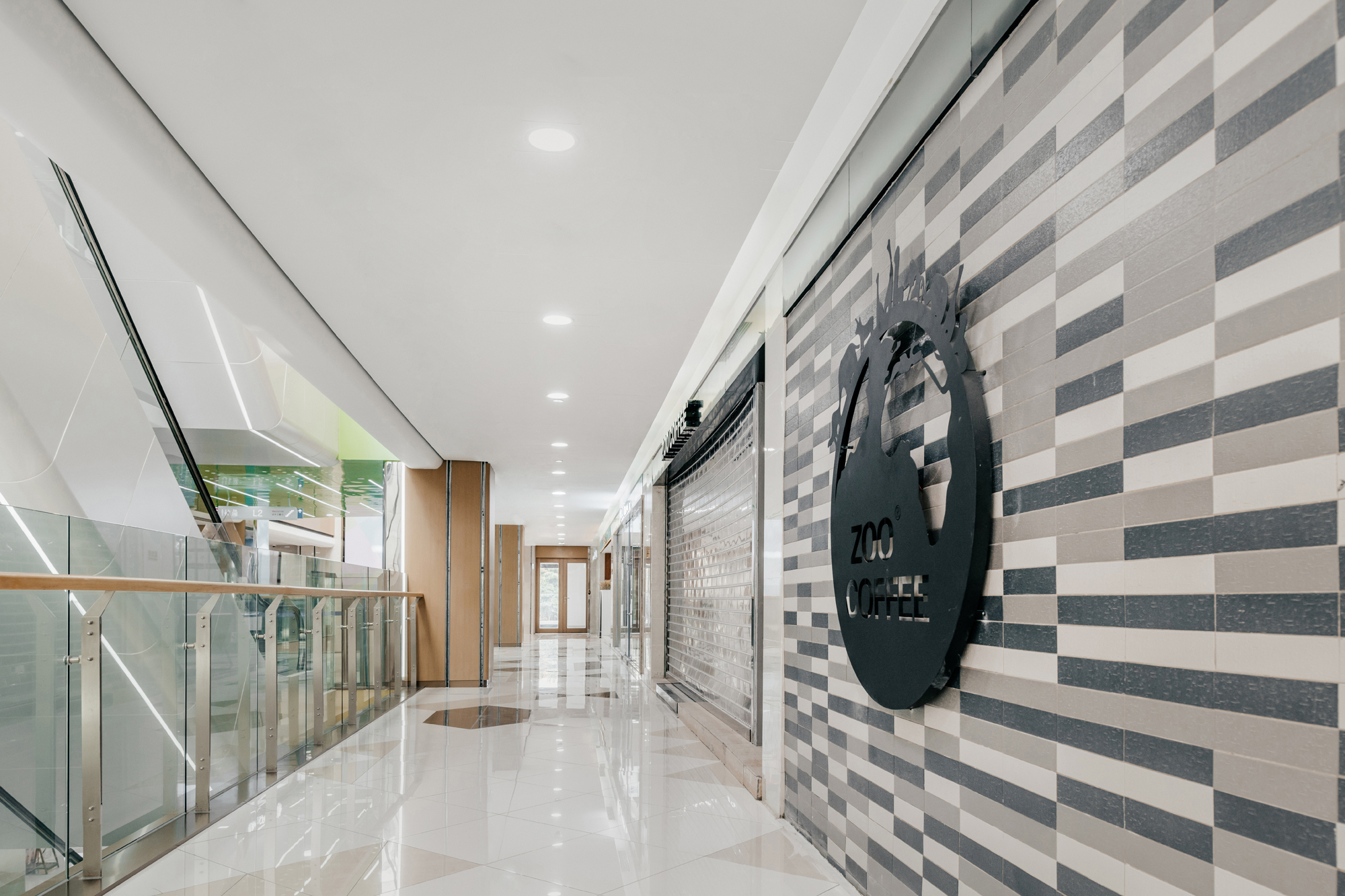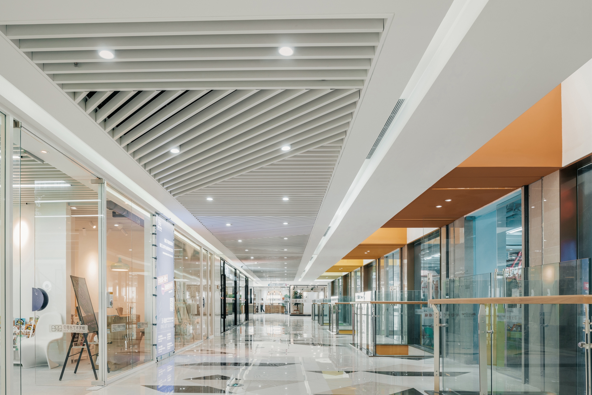 设计选材:设计师在走道空间中根据梁板位置每层延商铺一侧开洞,直到屋顶,把自然光线引进室内,形成层与层之间的互动关系,同时也解决走道因原有层高不足而产生的空间压抑感。开洞顶部以彩虹为渐变色为装饰,让光影和色彩随着阳光的照射不断变化,能把感受者引入到一个想象的空间境界。在空间中,色彩不仅对人们的视觉环境产生影响,还直接影响着人们的情绪和心理,明度适中的色调能使人心情放松,精神舒缓