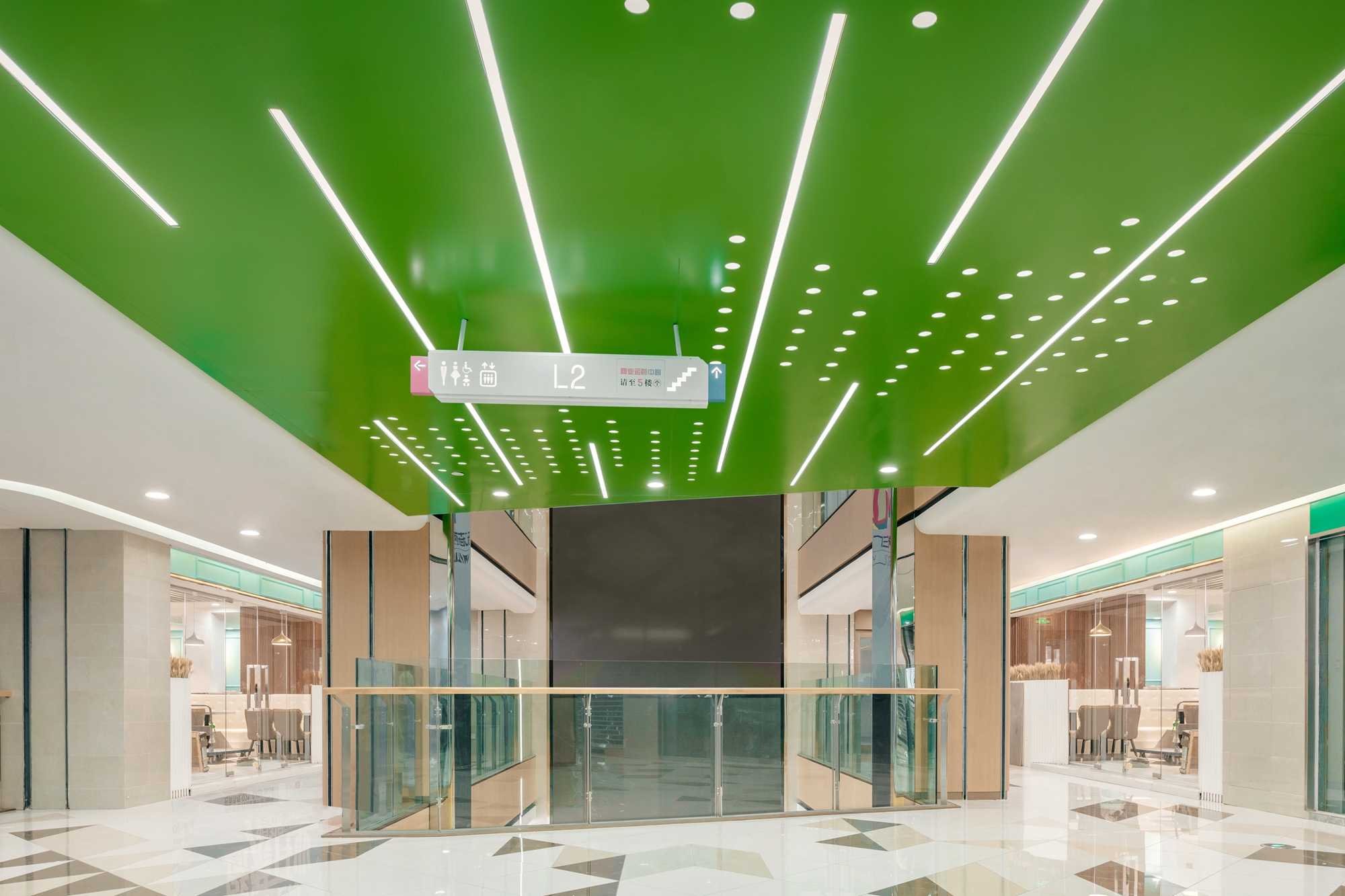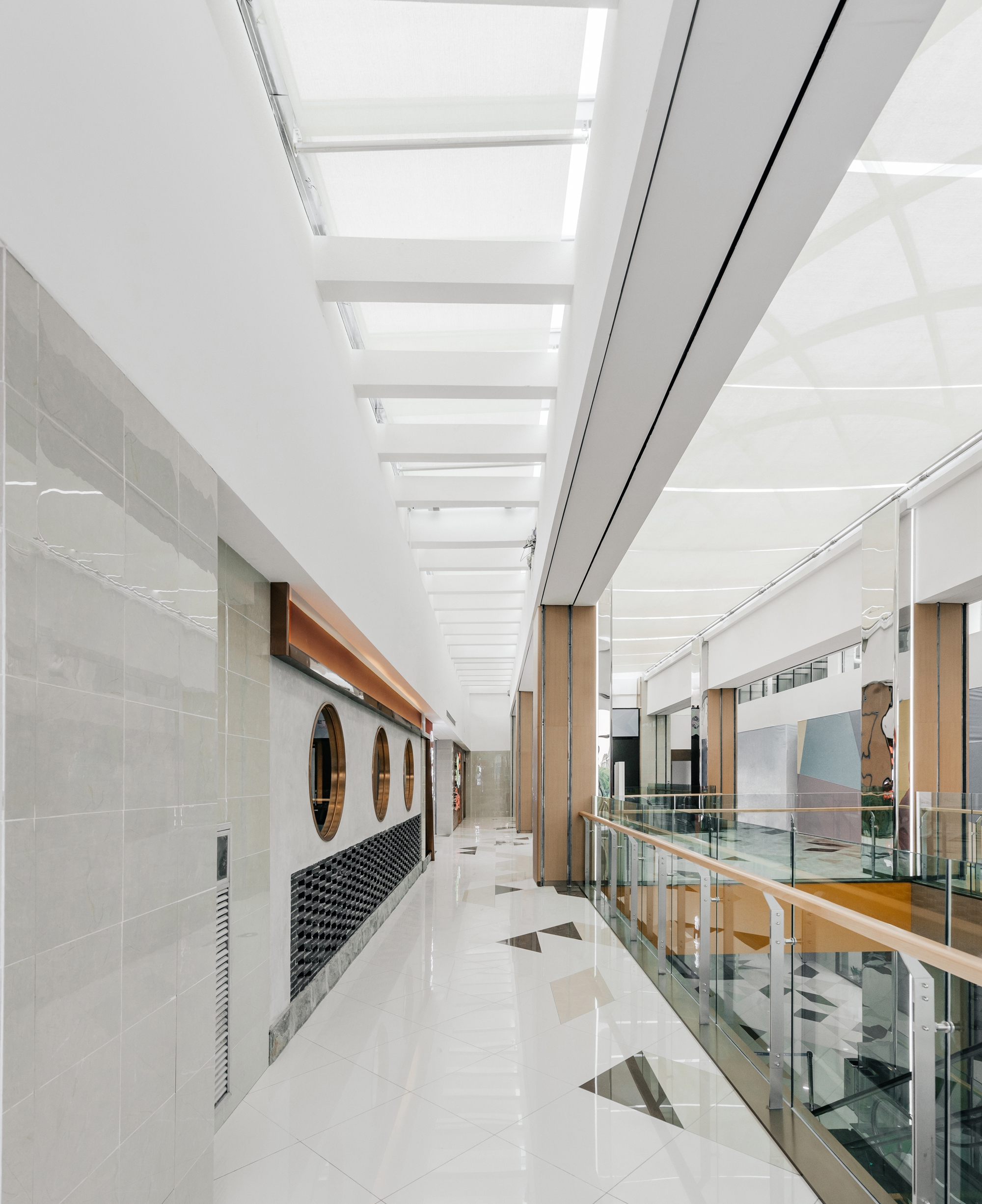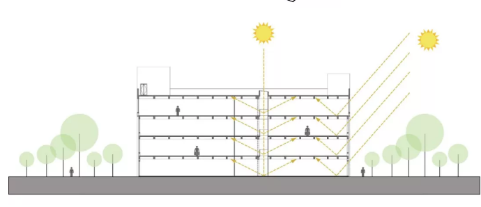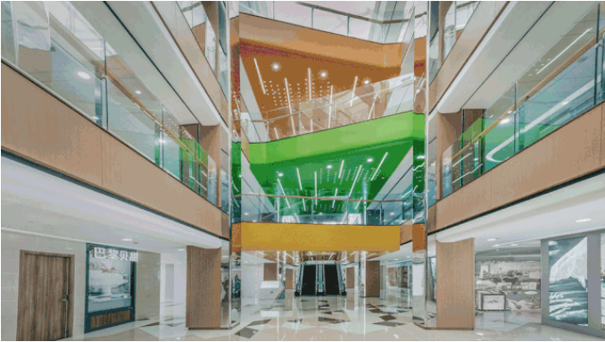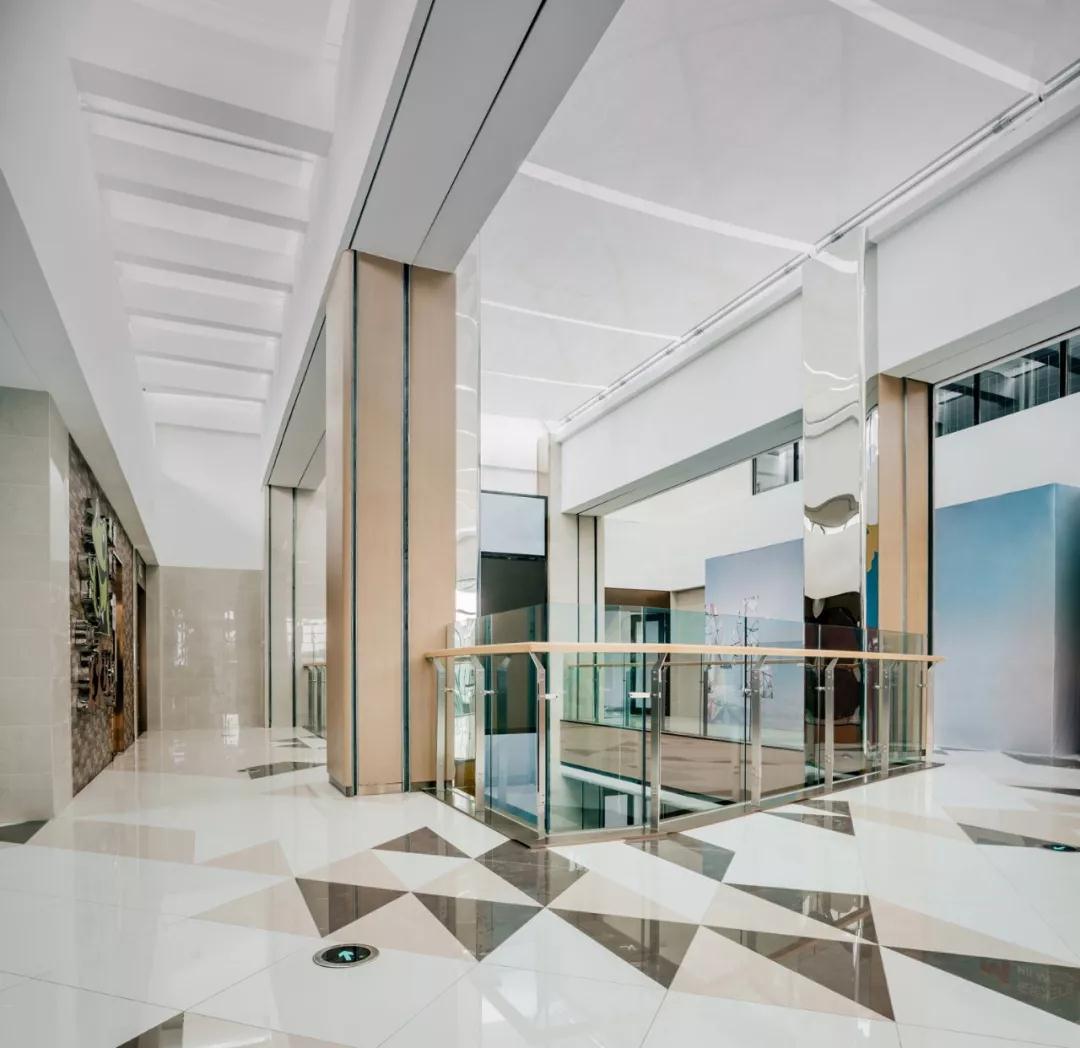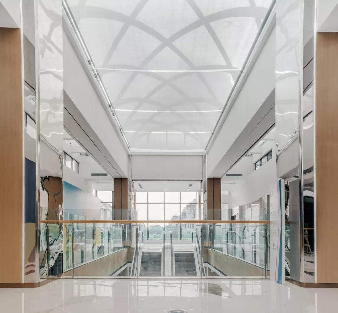 空间布局:设置玻璃采光顶,提高建筑的自然采光率和通透性,使空间进一步拉伸和扩大,极大程度地将空间美的一面展现出来
