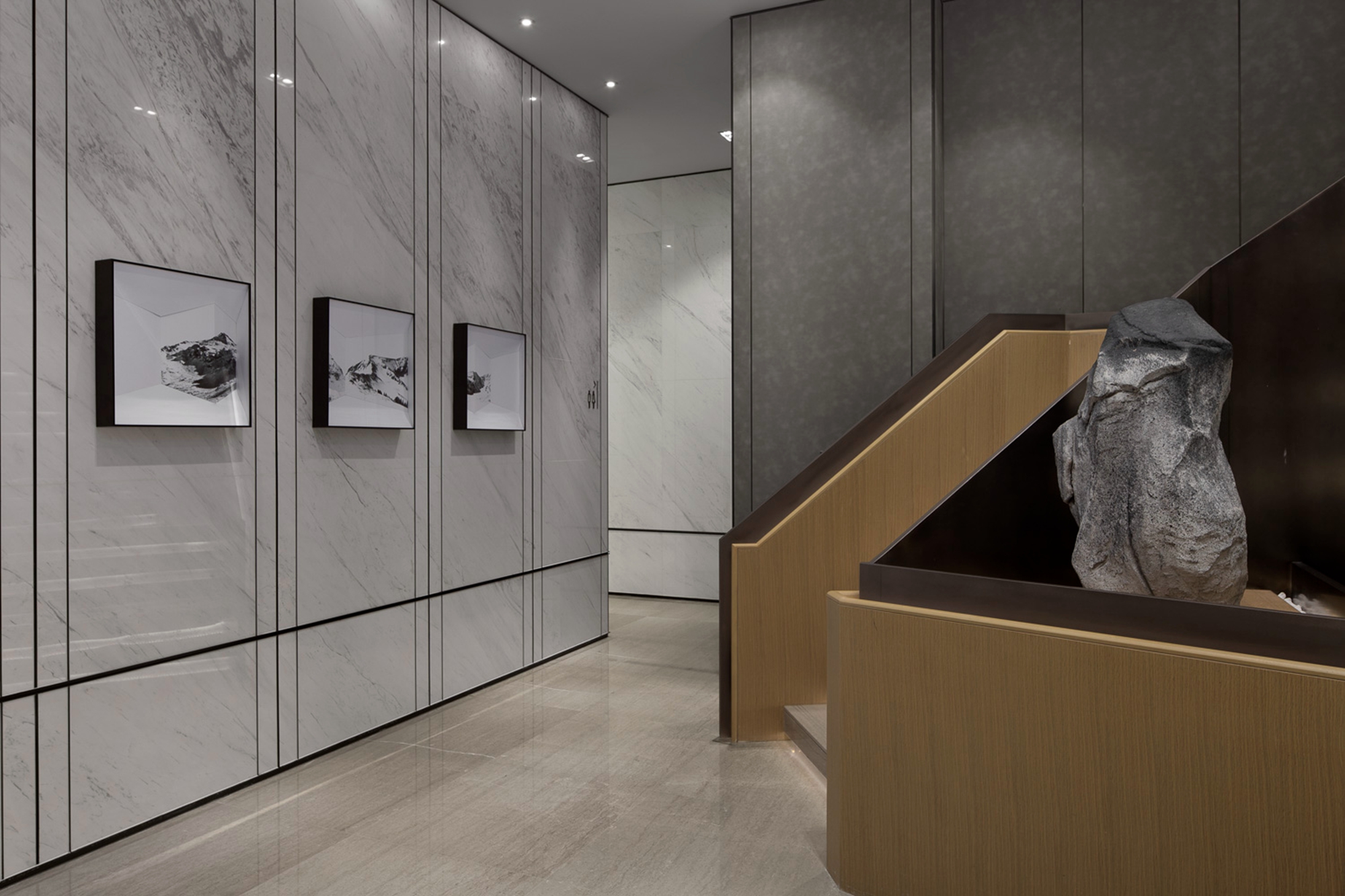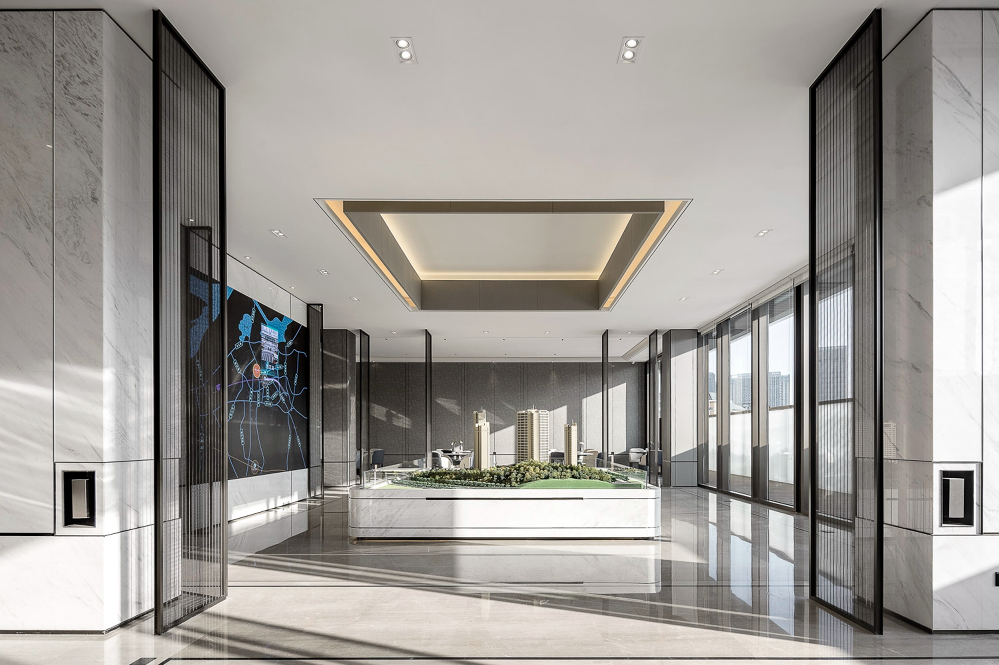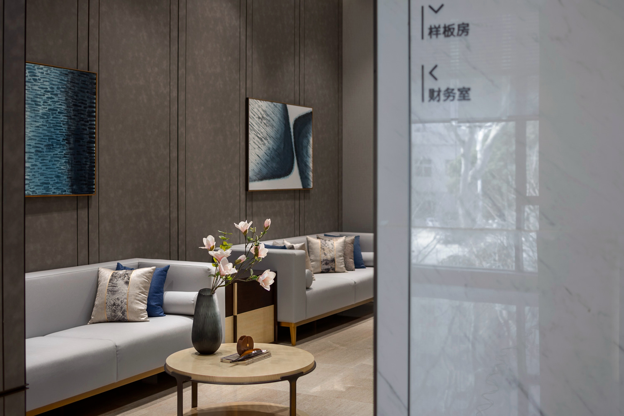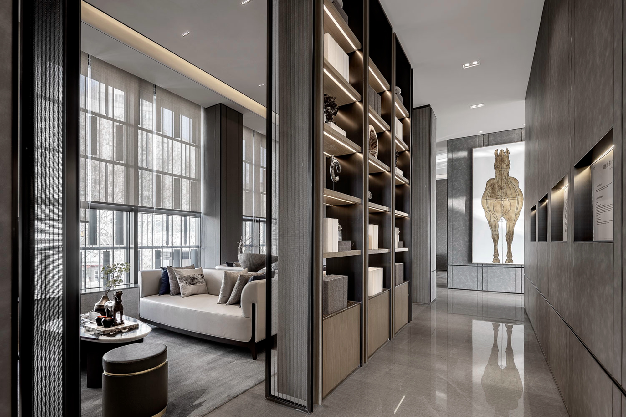空间布局:空间形式使视线得以延展,不用过多的装饰,使空间显现出现代东方美学内敛的气质。