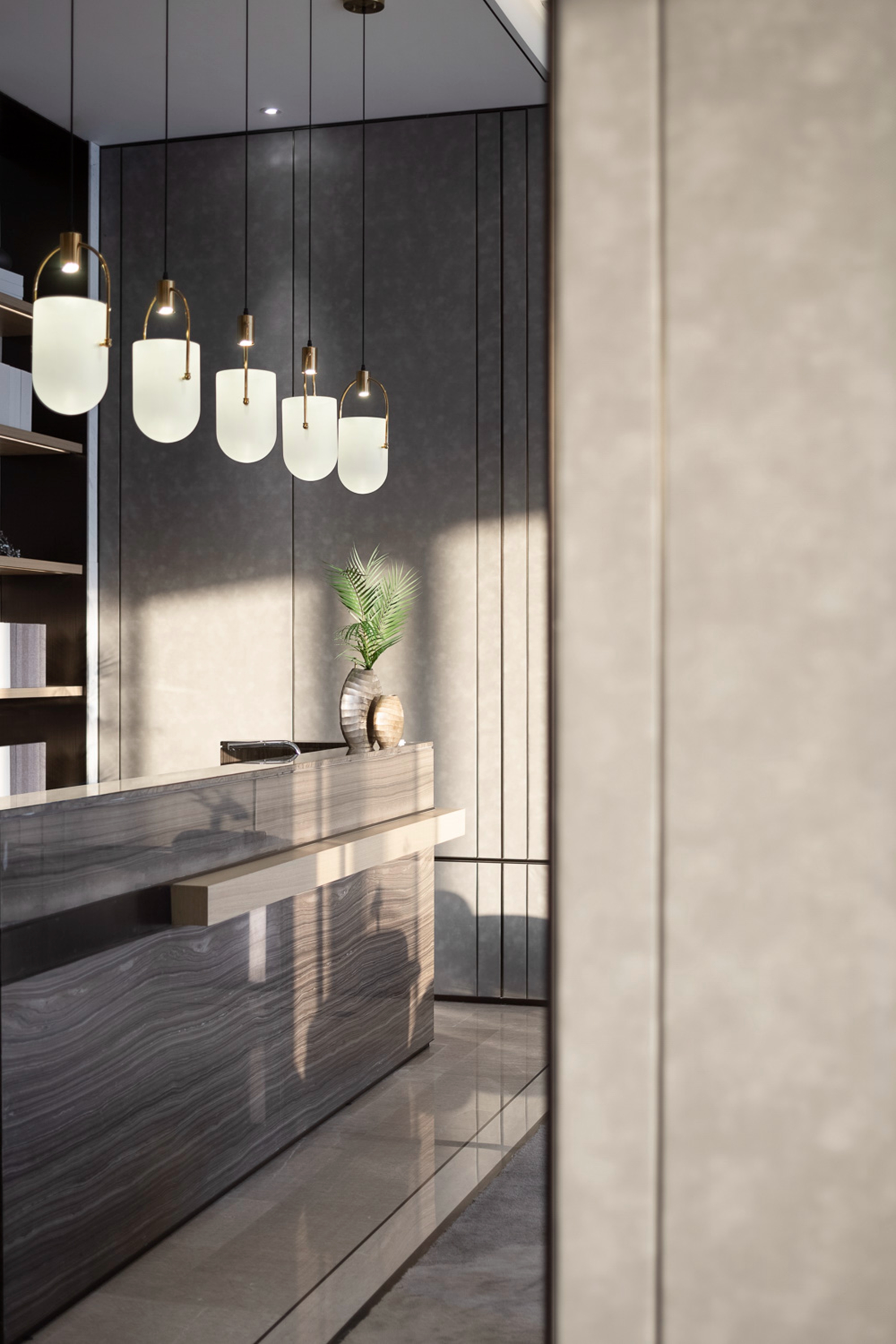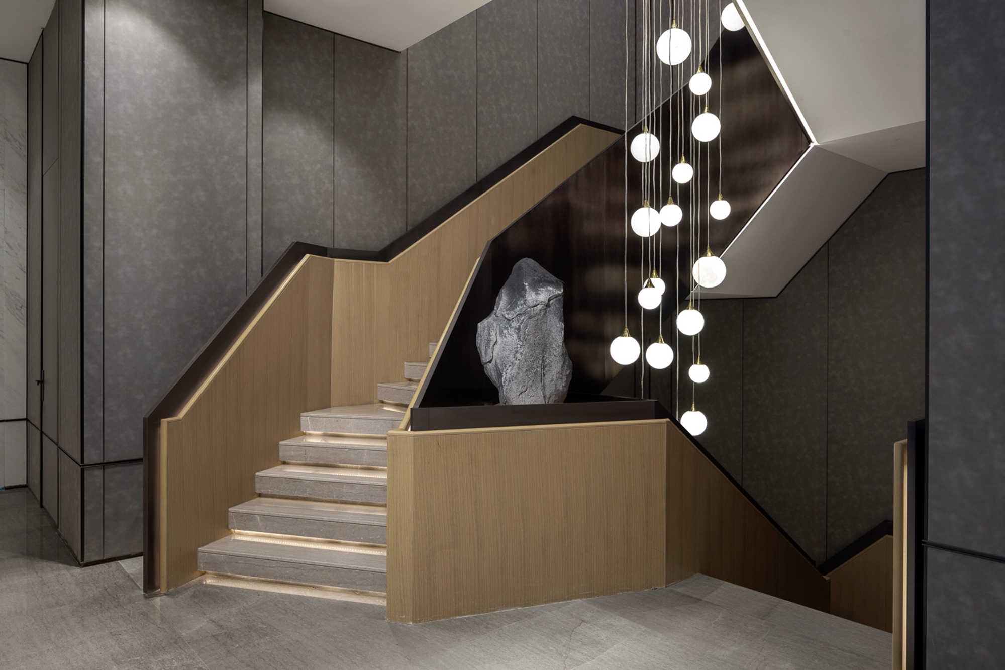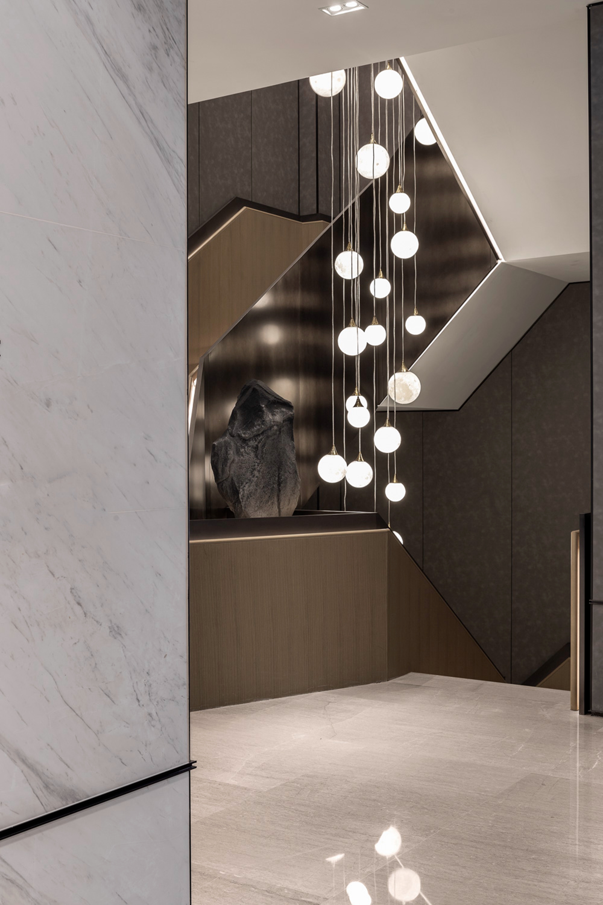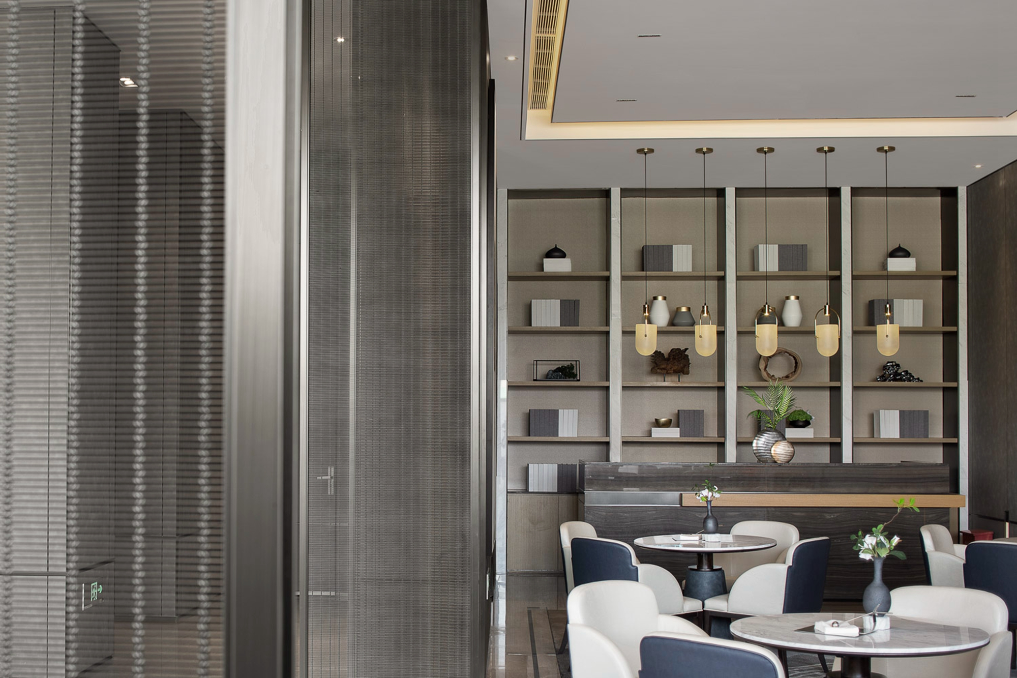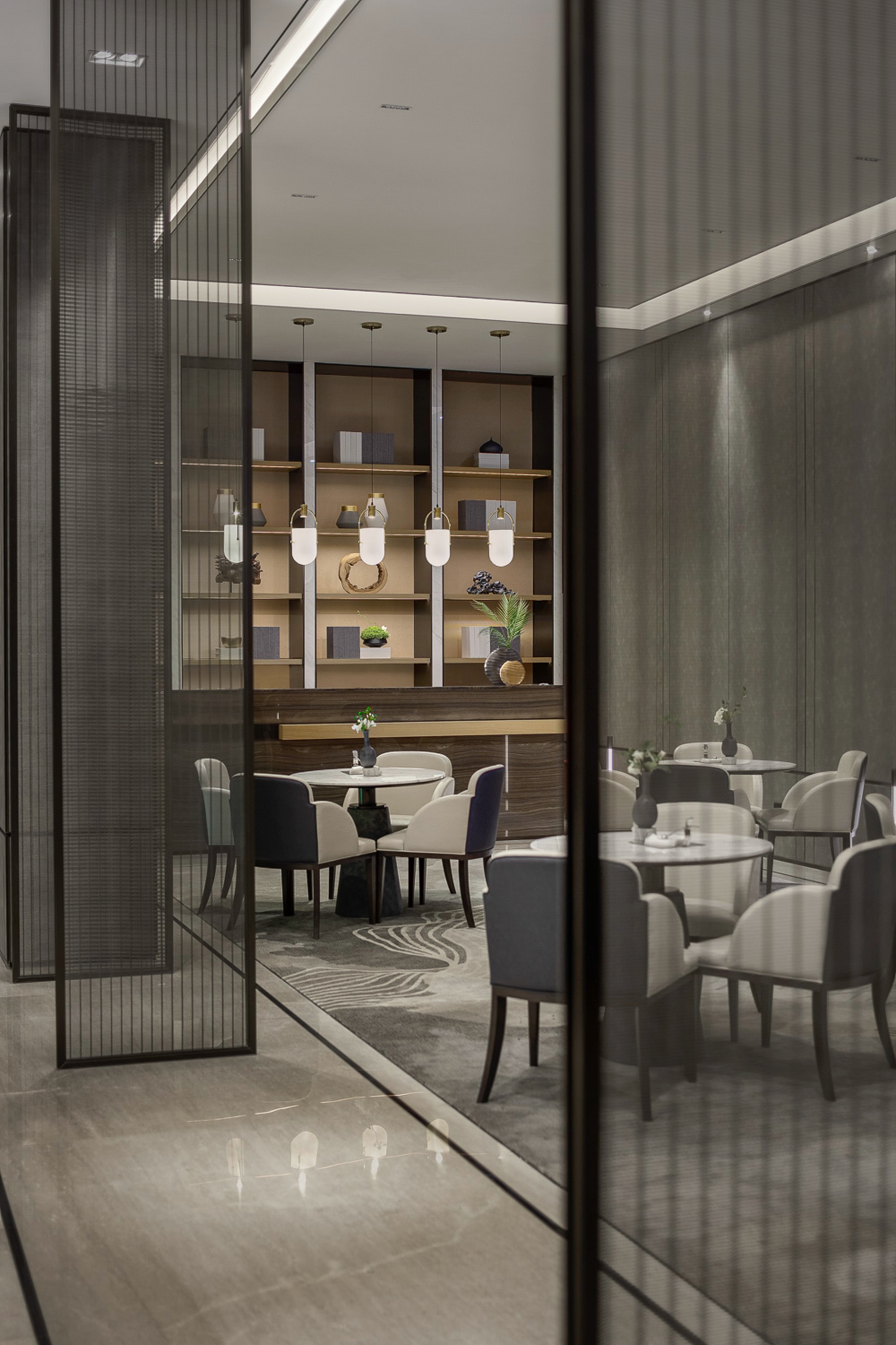 用户体验:建筑外的光与灯光相呼应,点点中式风细节穿插游走,博古架替代实体隔墙,光与空间的韵律之美在此悠然定格。移步易景,次第展开,用现代的设计手法搭配东方元素和细节,比简约多一点温度,比摩登多一丝沉稳。